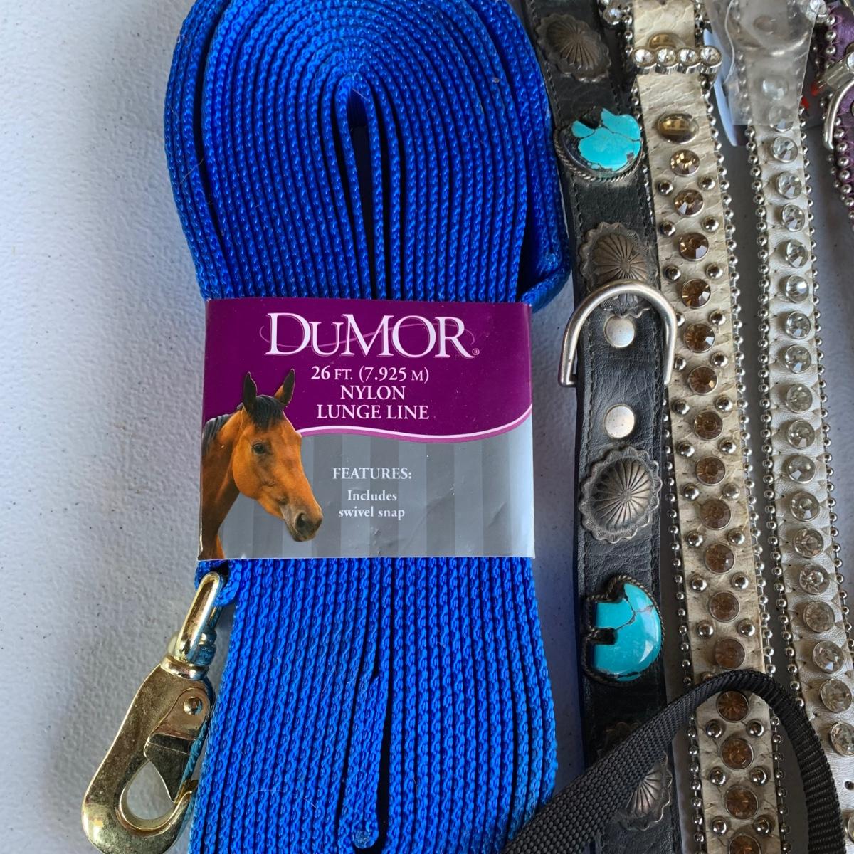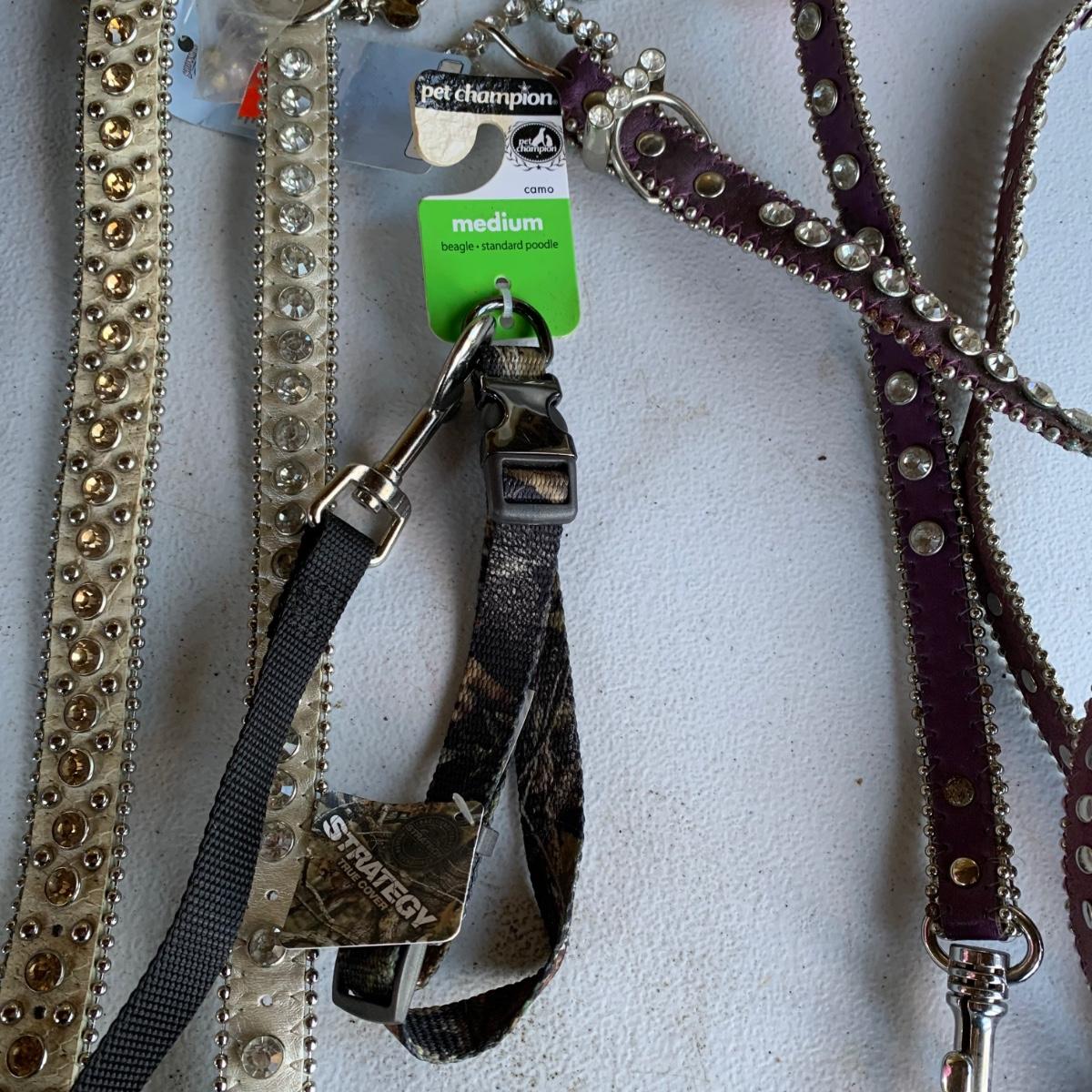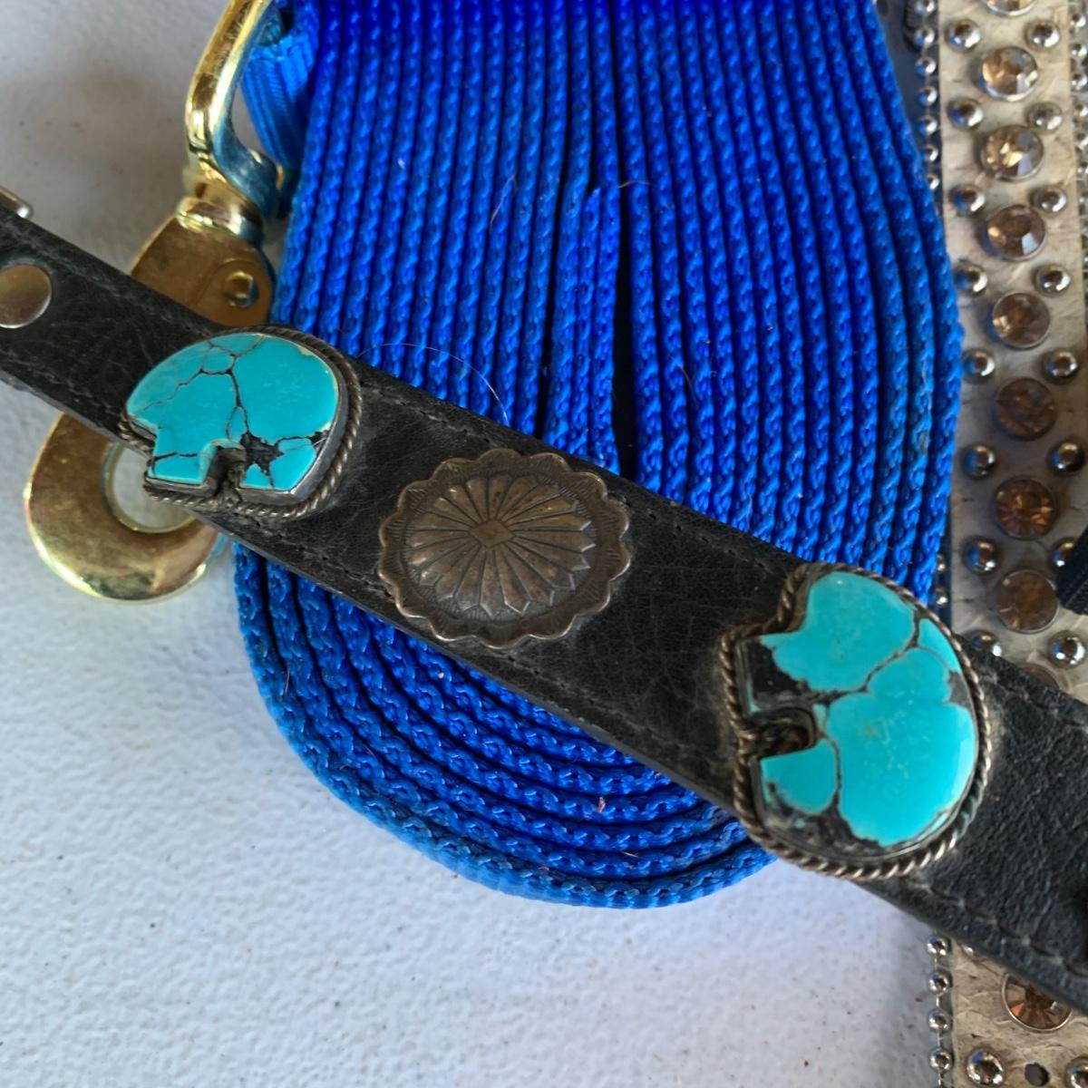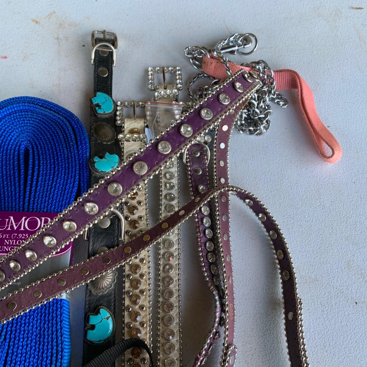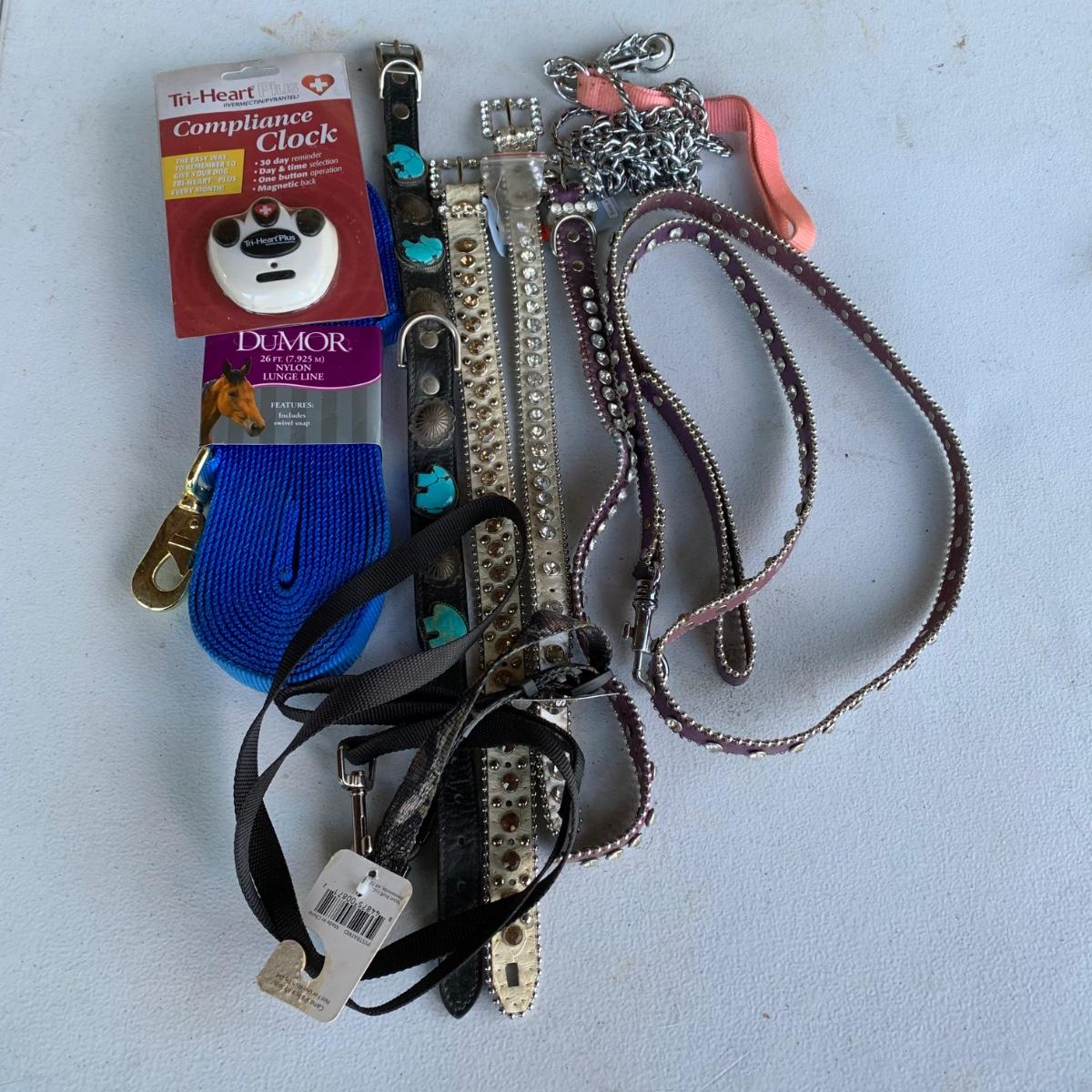LOT 93R: Dog Collars & Leashes, Tri-Heart Reminder & Dumor Lunge Line, Leather Southwestern Style Pet Collar