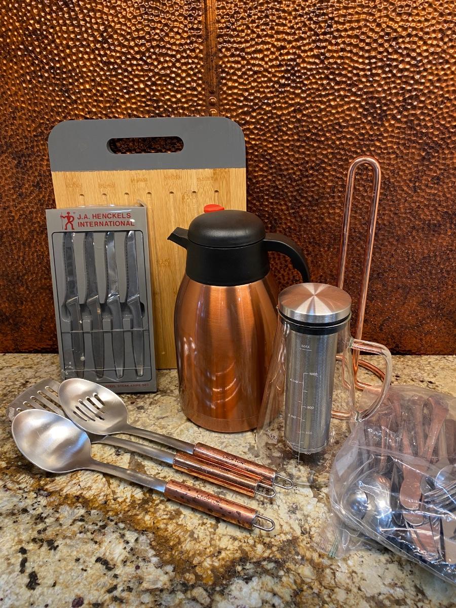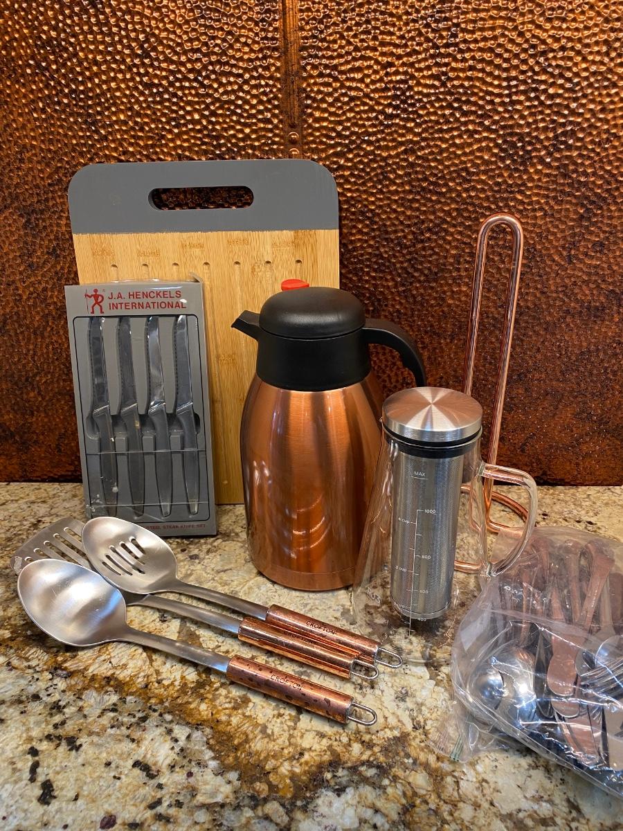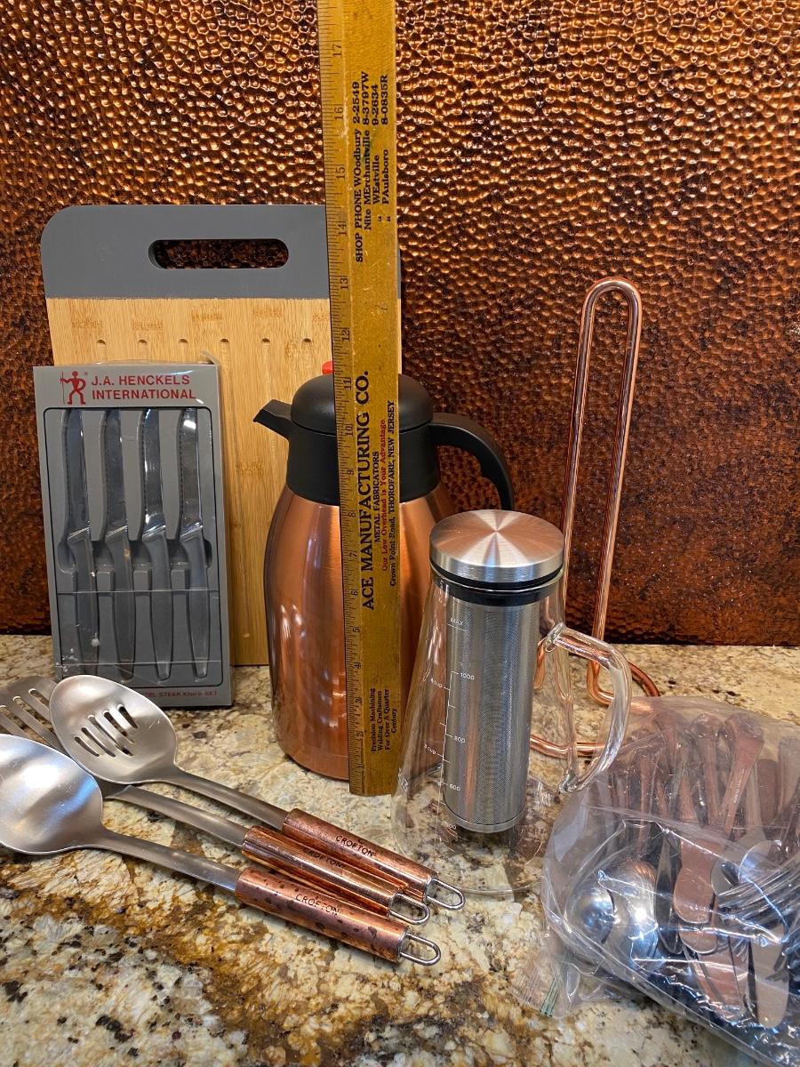 LOT:117: Henckels Steak Knives, Copper Coffee Carafe, Copper Handled Utensils and Paper Towel Holder; and Flatware