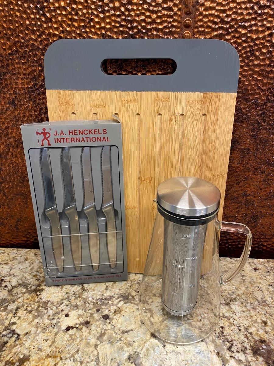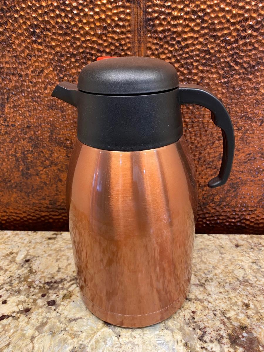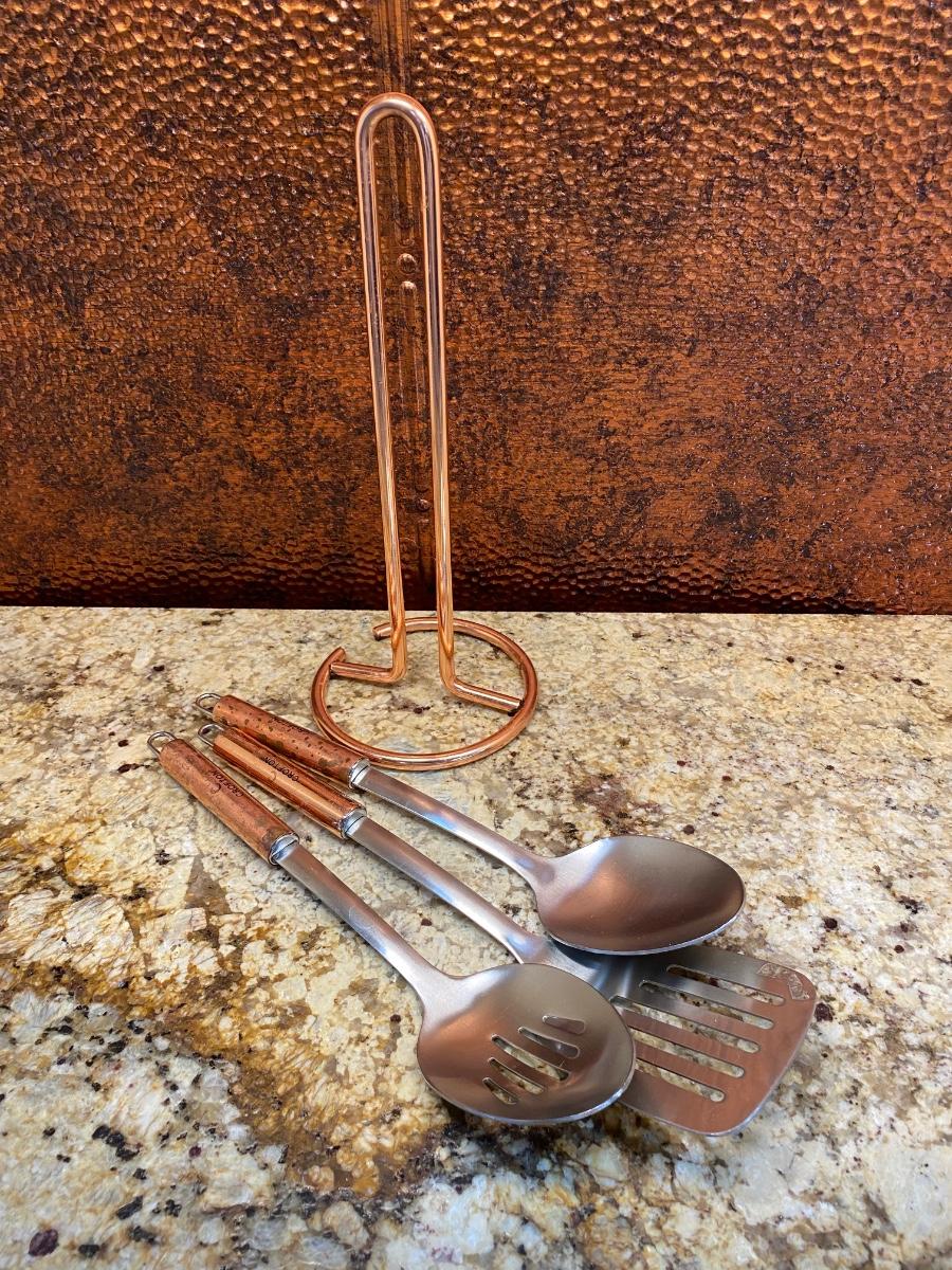 LOT:117: Henckels Steak Knives, Copper Coffee Carafe, Copper Handled Utensils and Paper Towel Holder; and Flatware