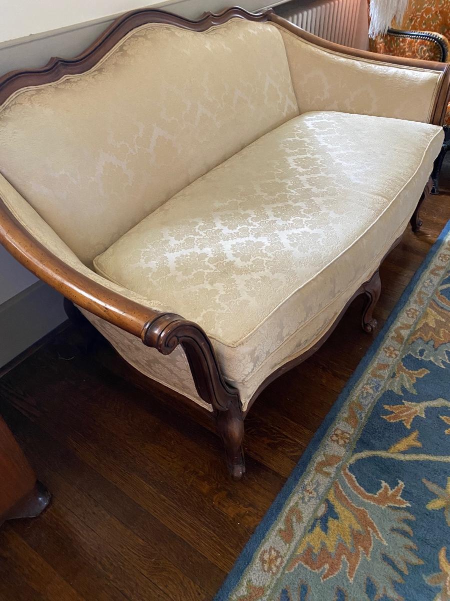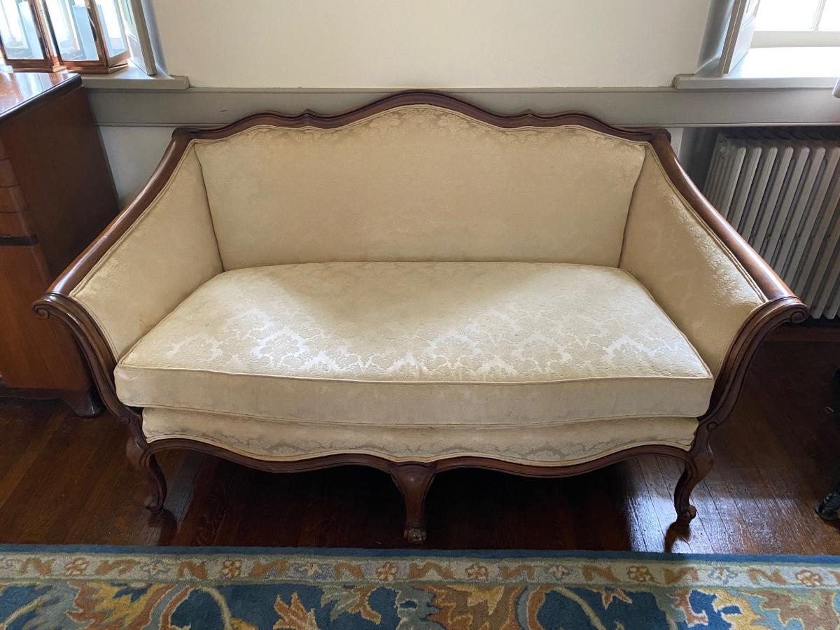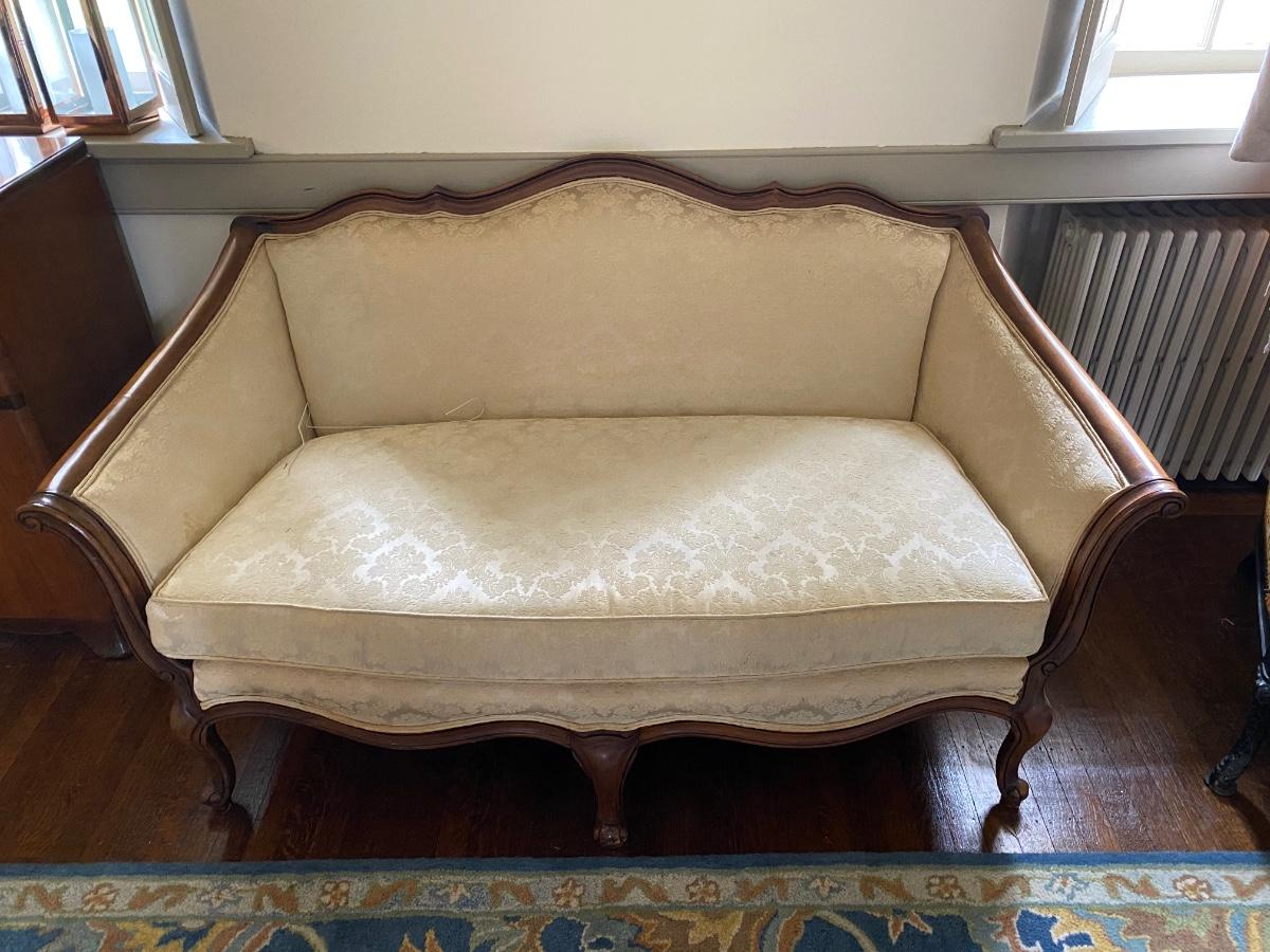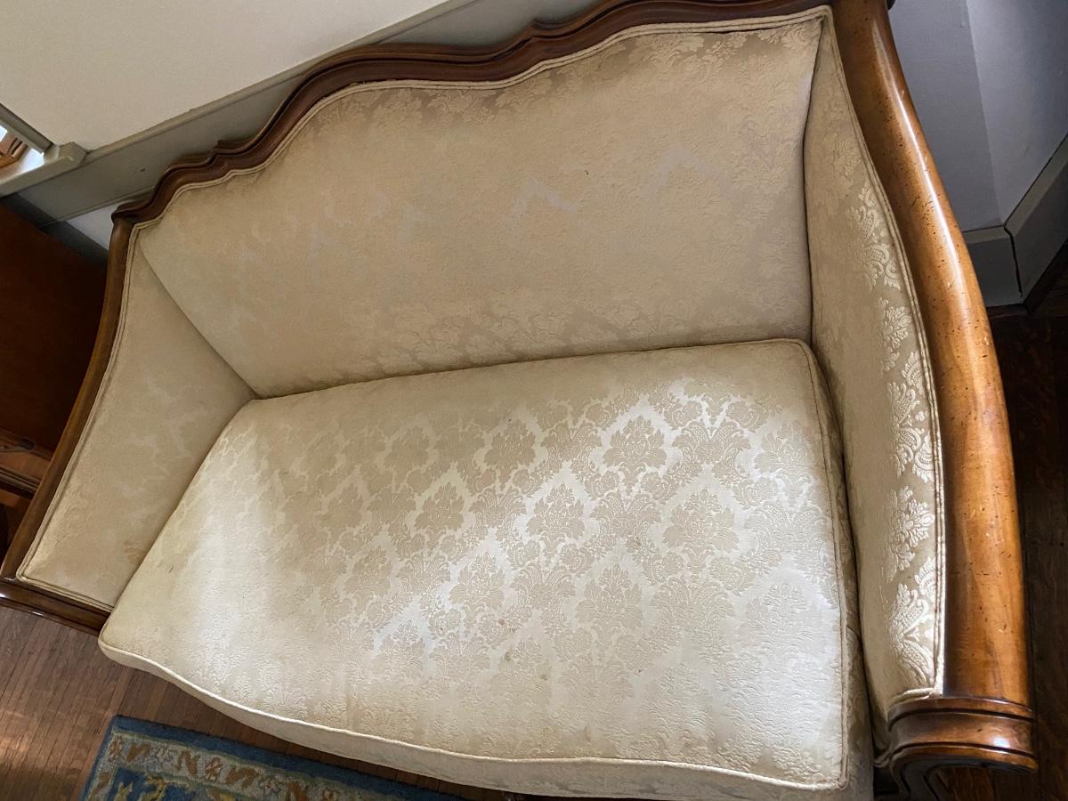LOT:127: Early Americans White Upholster Love Seat with Wood Trim