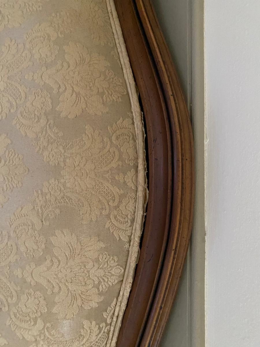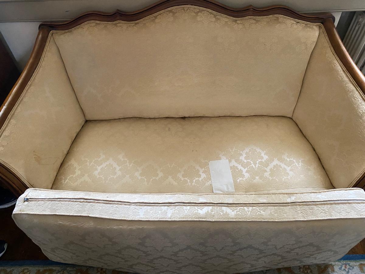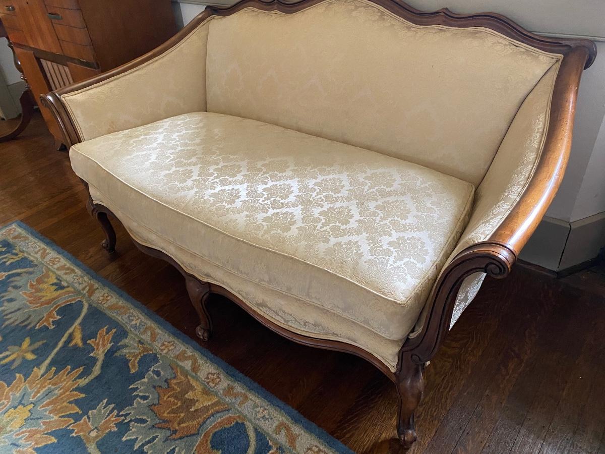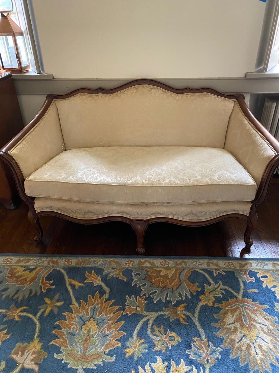 LOT:127: Early Americans White Upholster Love Seat with Wood Trim