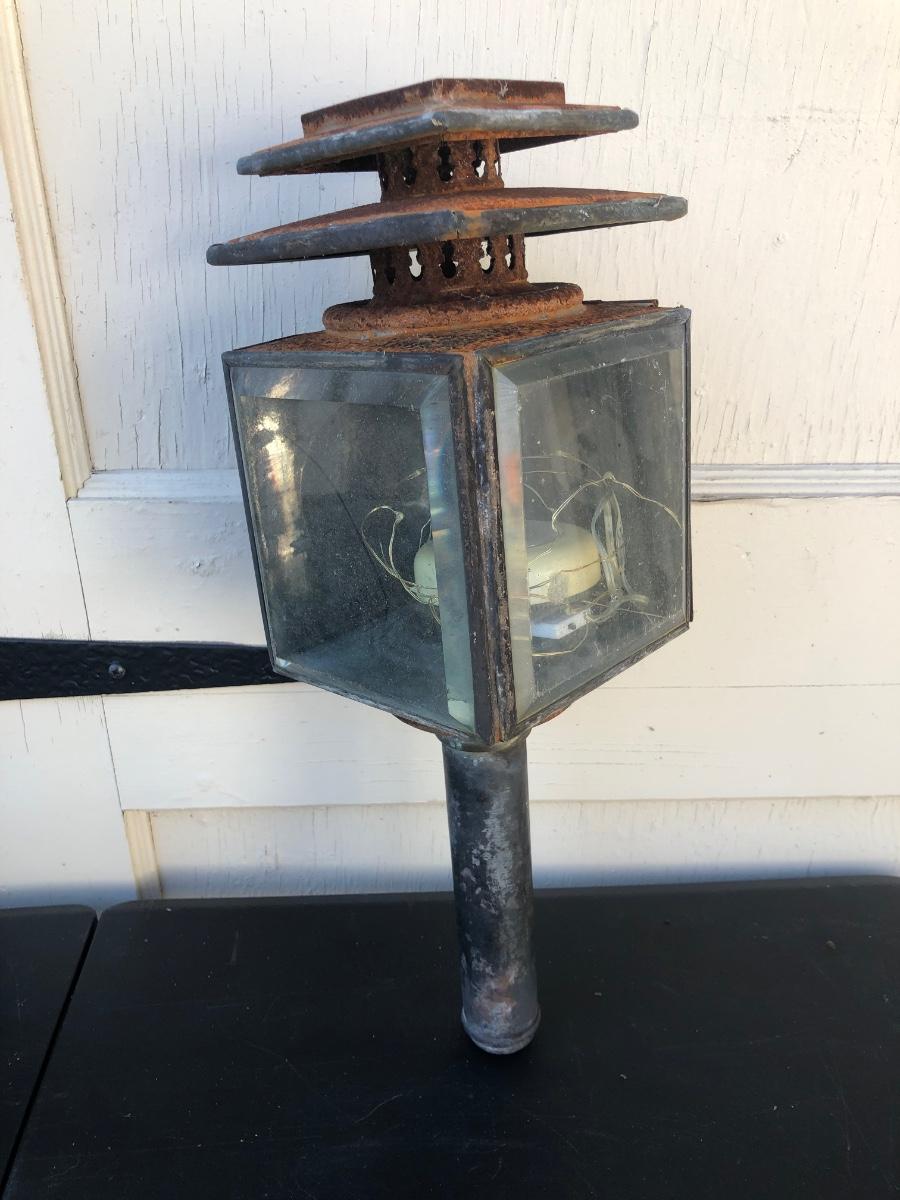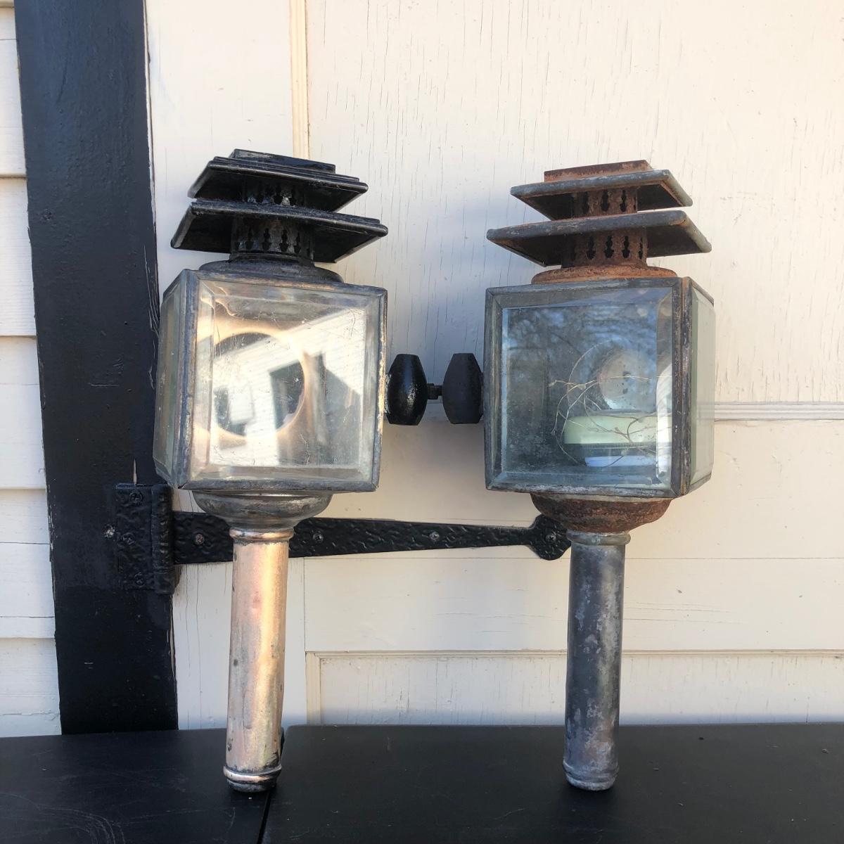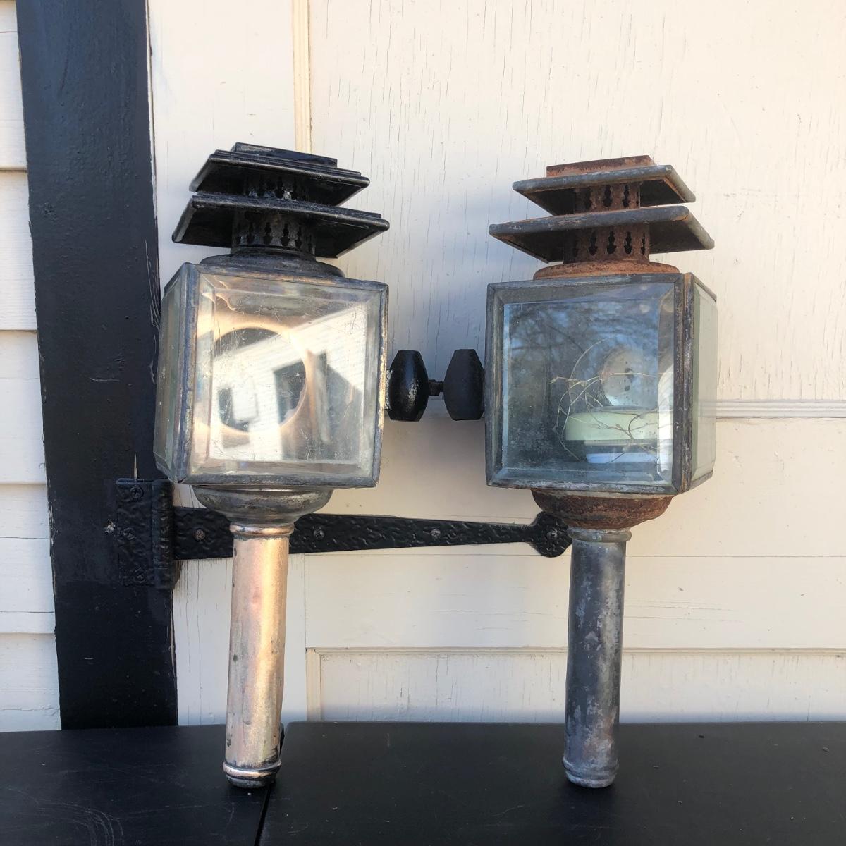 Two carriage lanterns. One is very rusted and the other is in better shape. Both are square with beveled glass. One has modern lighting technology inside but the door is rusted halfway shut (see photo - its rusted in that position).