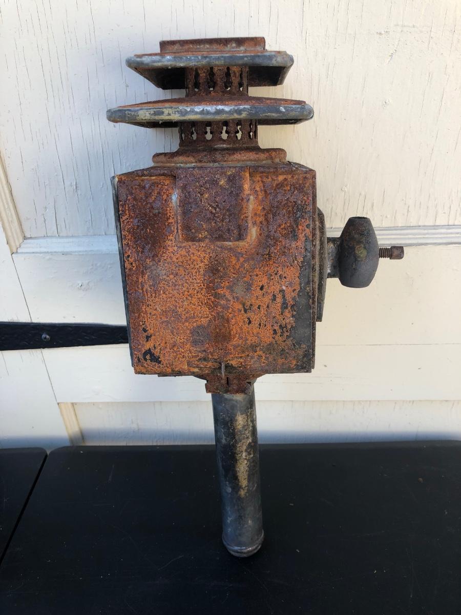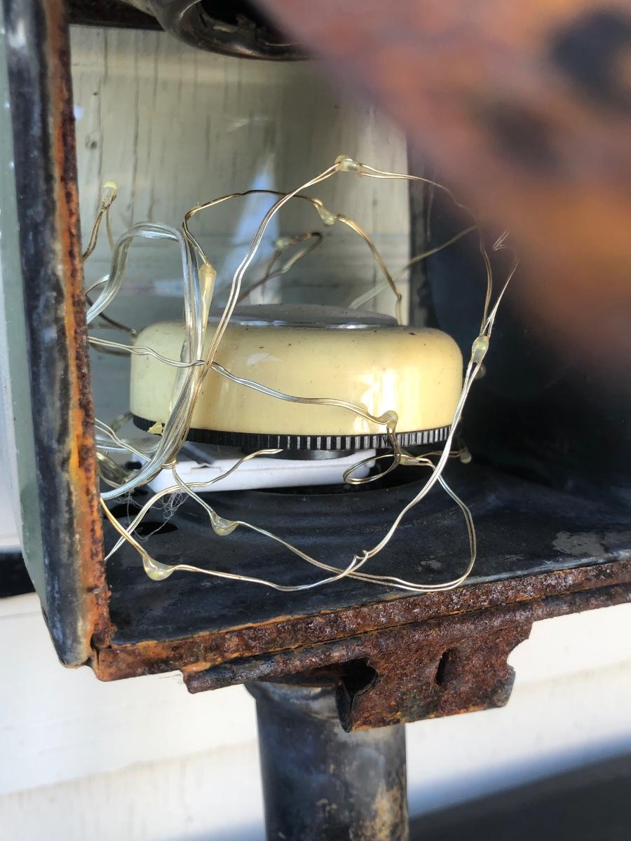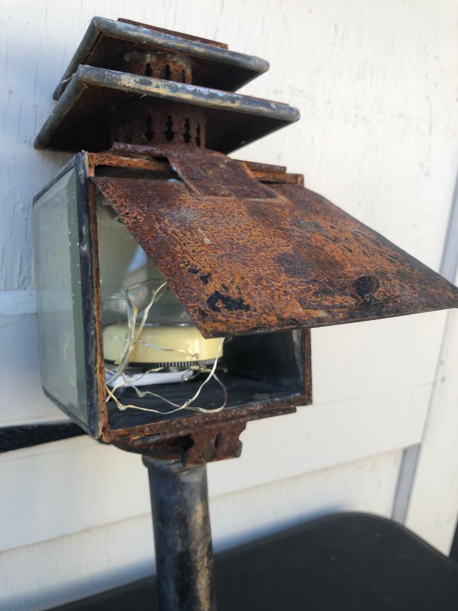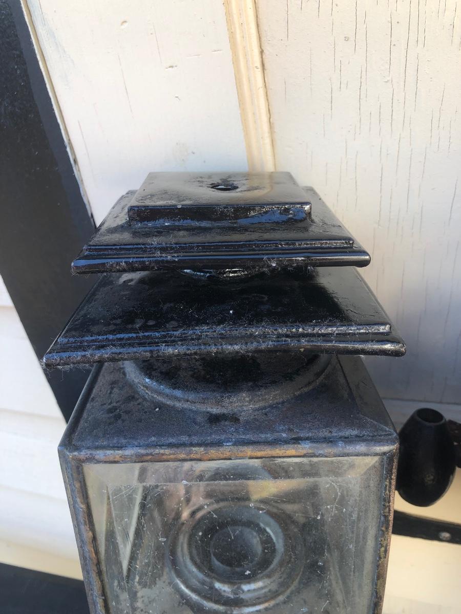 Two carriage lanterns. One is very rusted and the other is in better shape. Both are square with beveled glass. One has modern lighting technology inside but the door is rusted halfway shut (see photo - its rusted in that position).