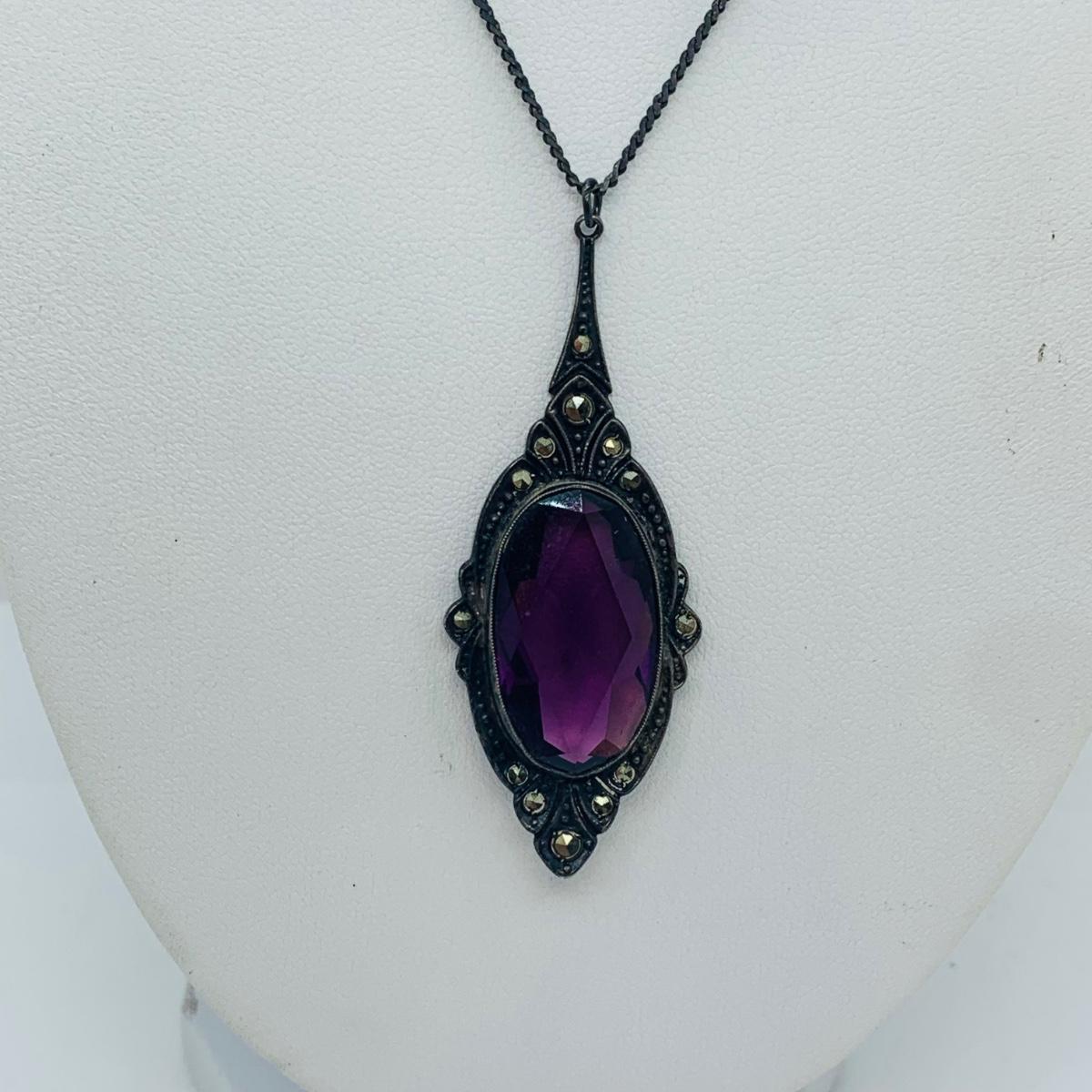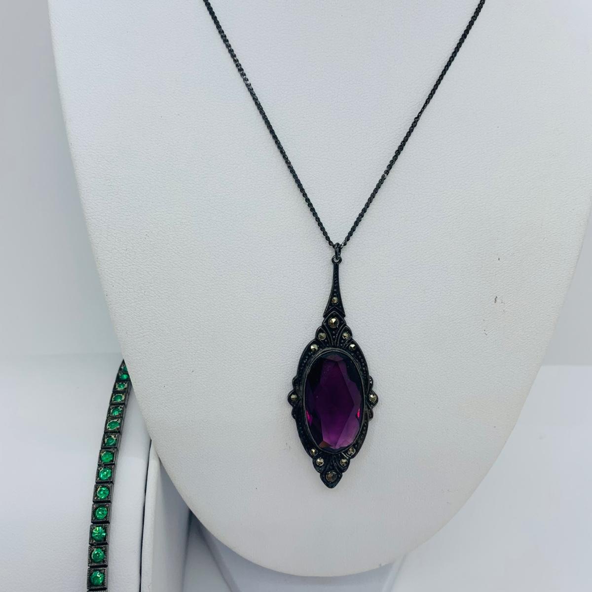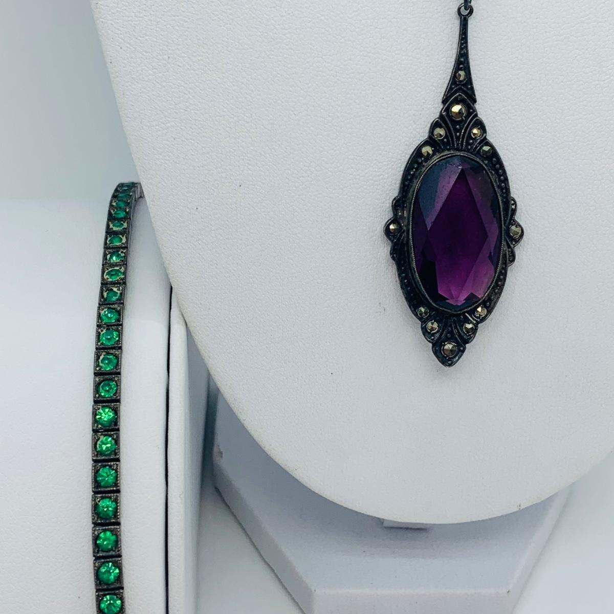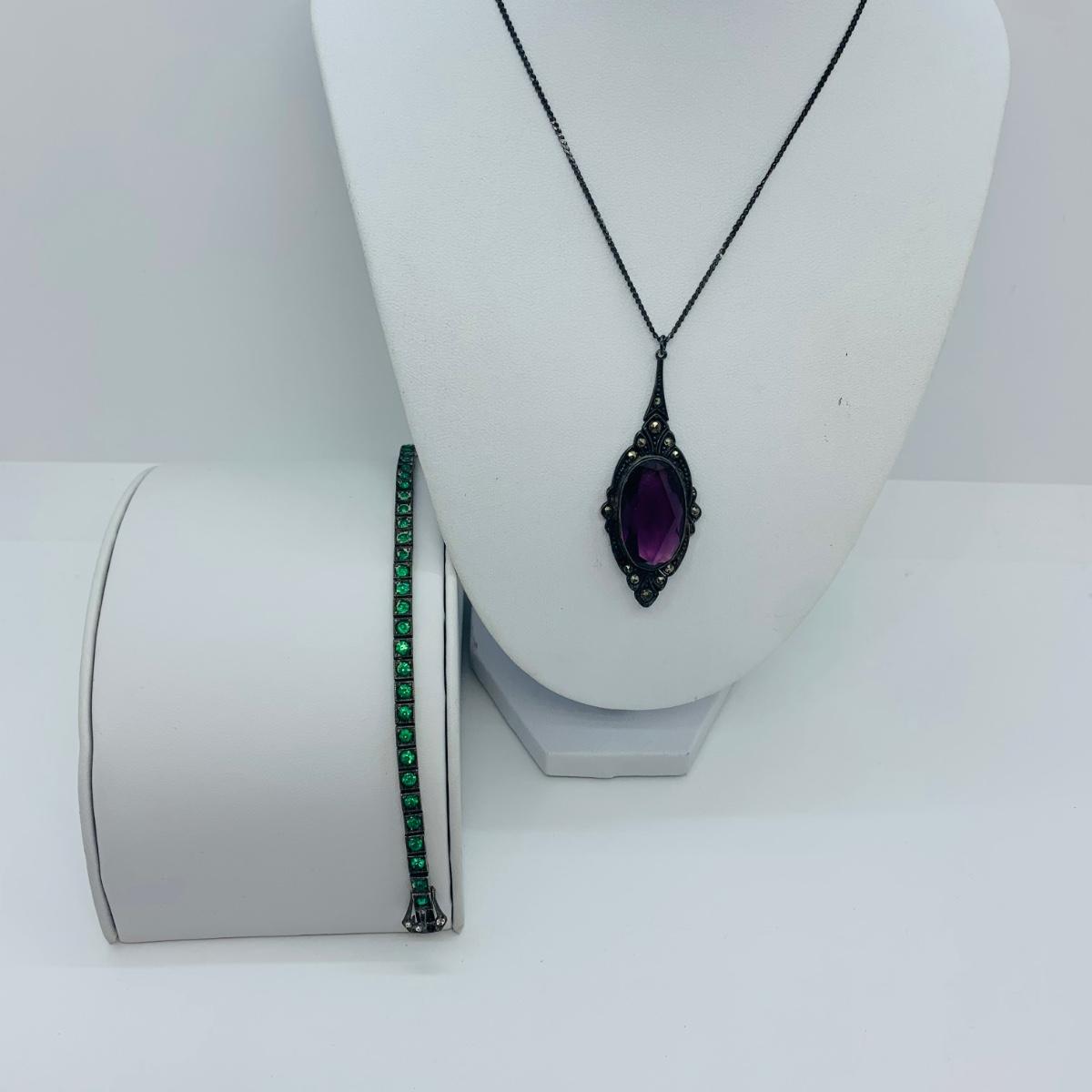 LOT 304: Sterling Silver Collection: 2" Amethyst Pendant w/24" Chain & Simulated 7"Emerald Braclet