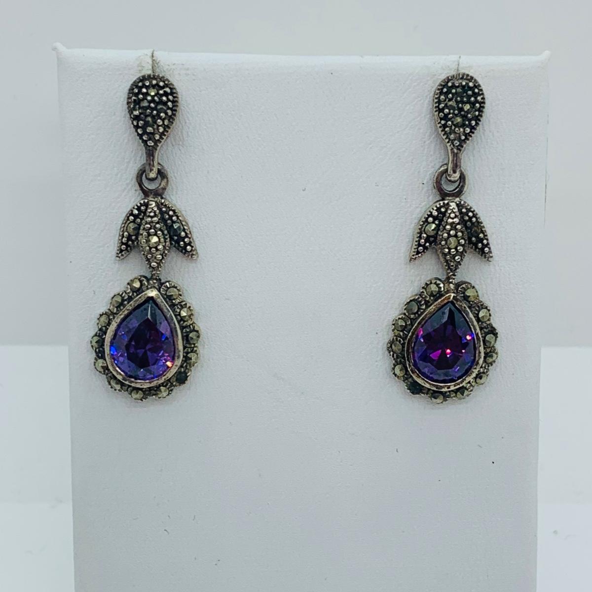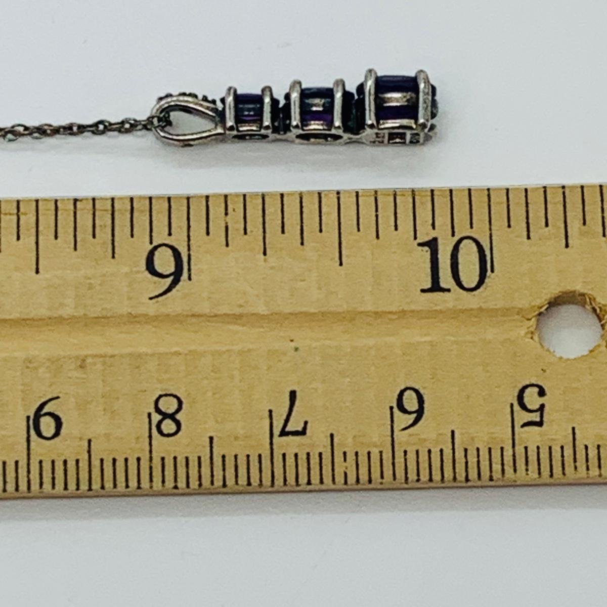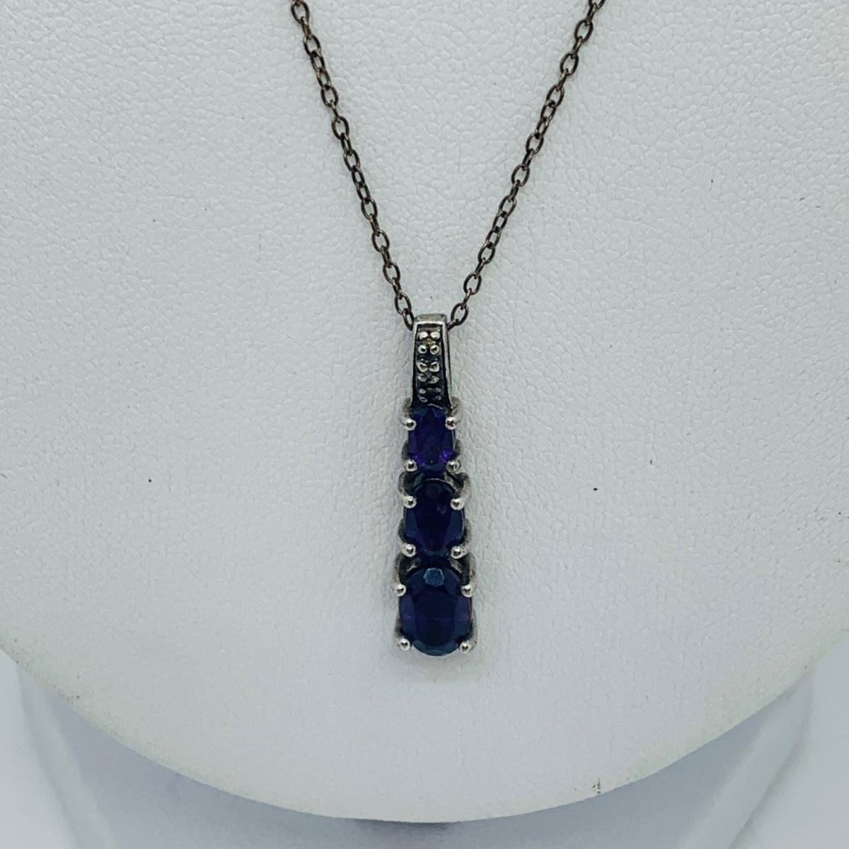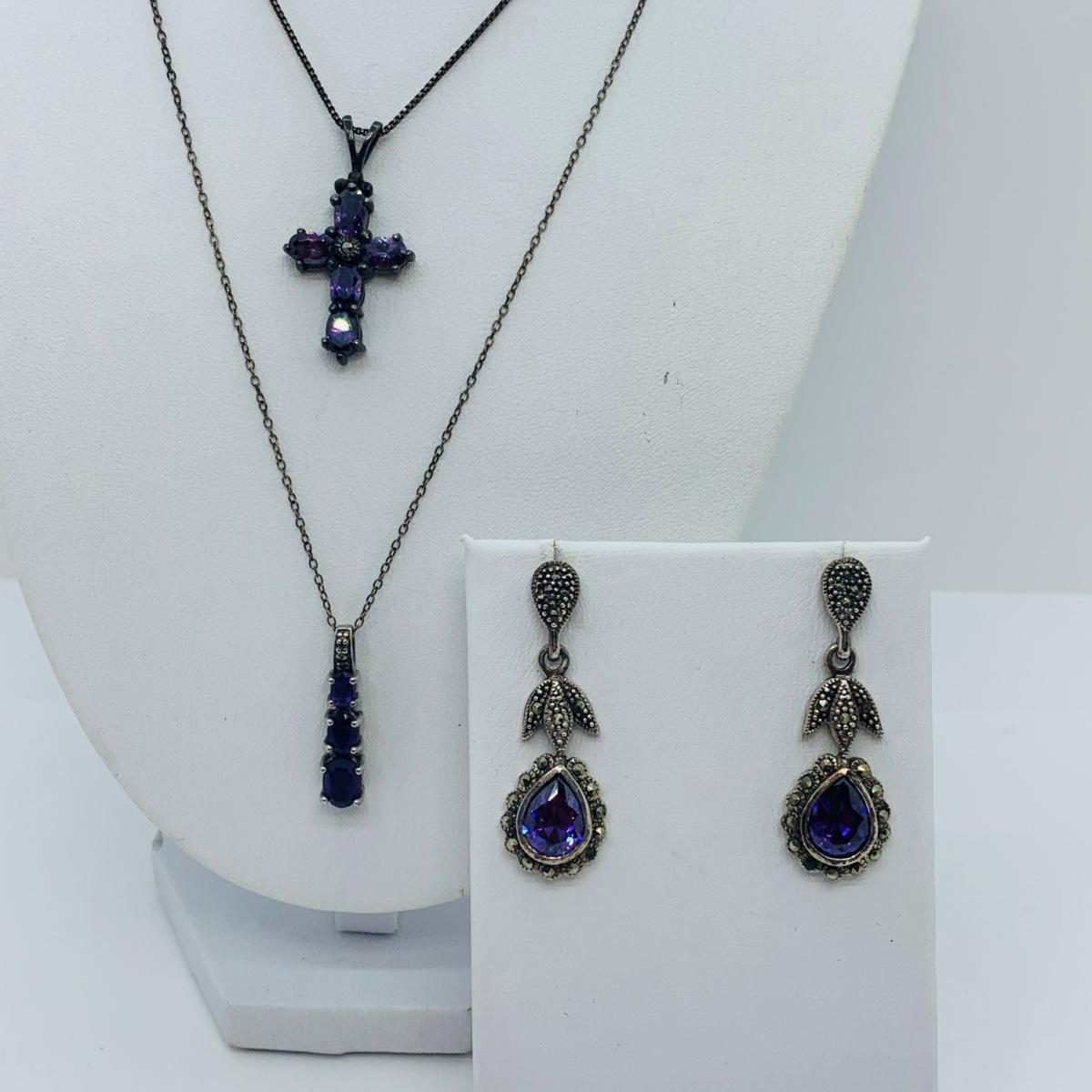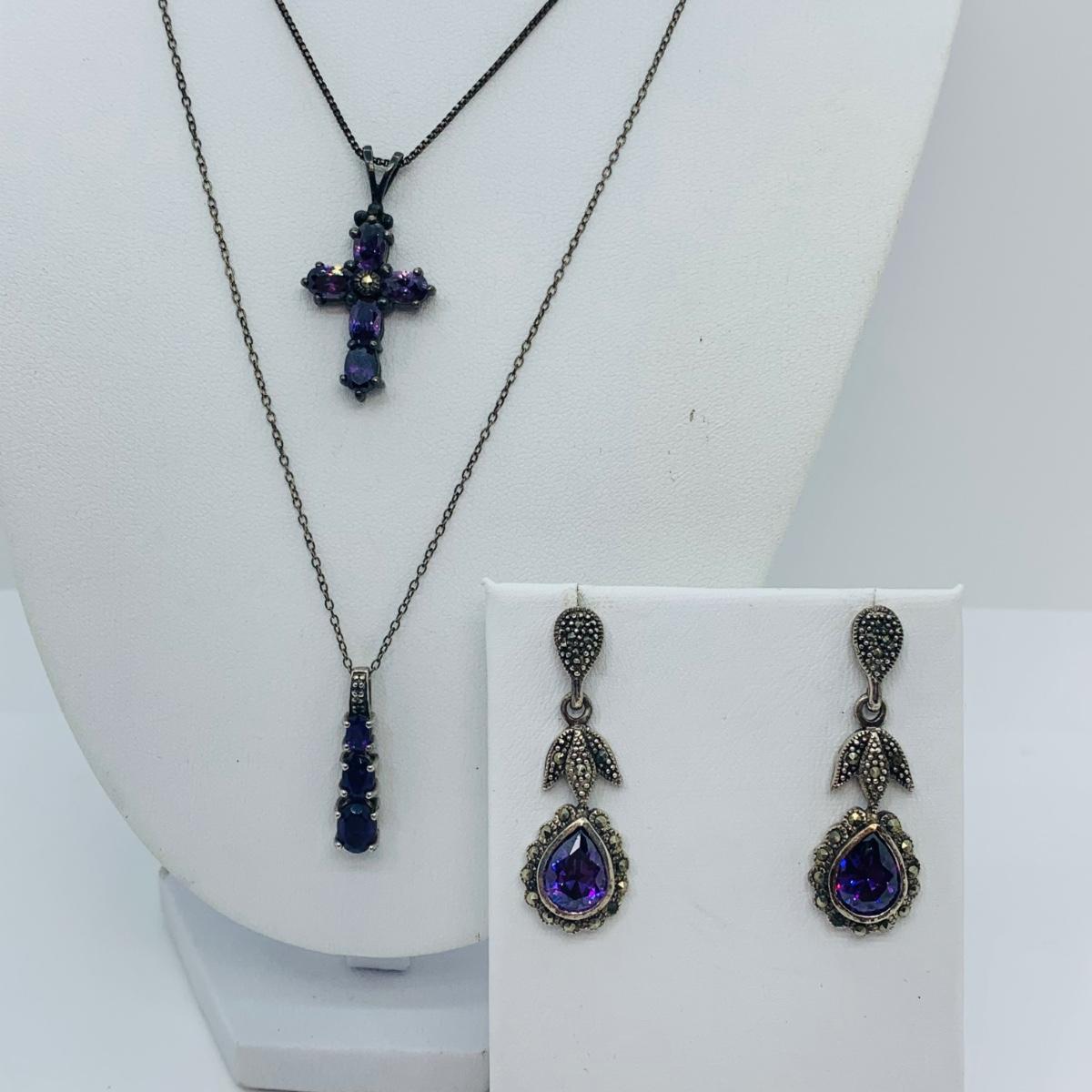 LOT 303: Sterling Silver & Simulated Amethyst Pendants w/Chains & Pierced Earrings