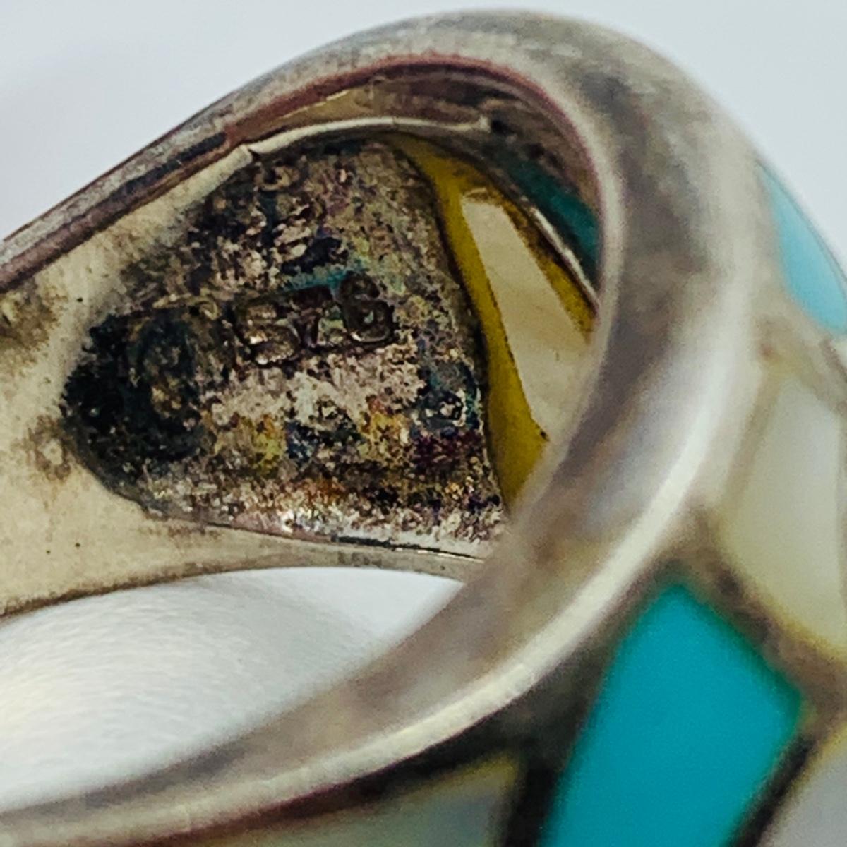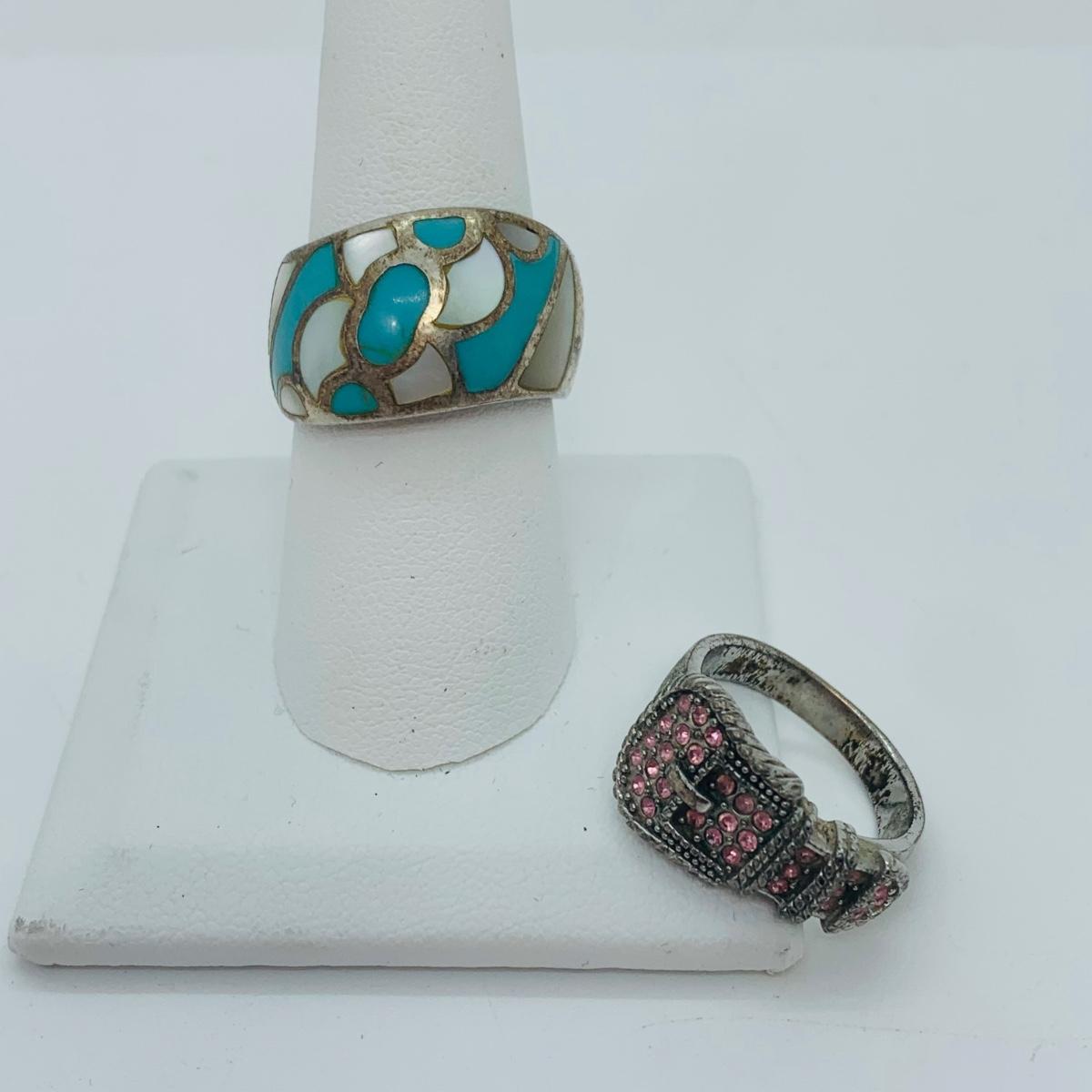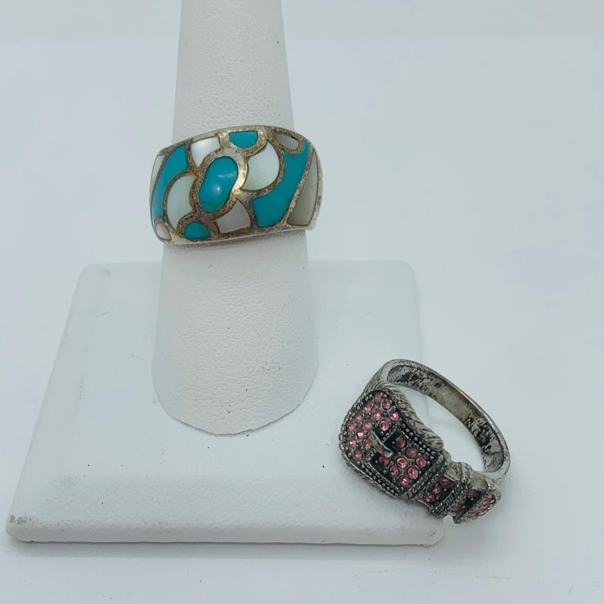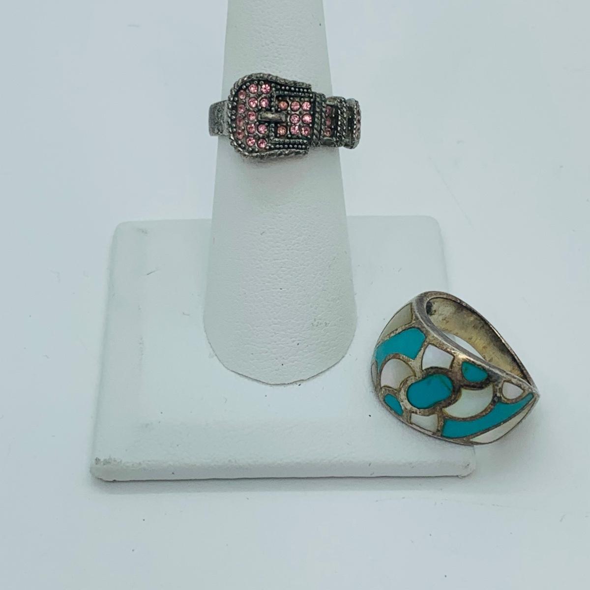 LOT 300: Sterling Silver Rings: Belt Buckle w/Simulated Gemstones Sz7 & Mother of Pearl & Turquoise Sz8.5