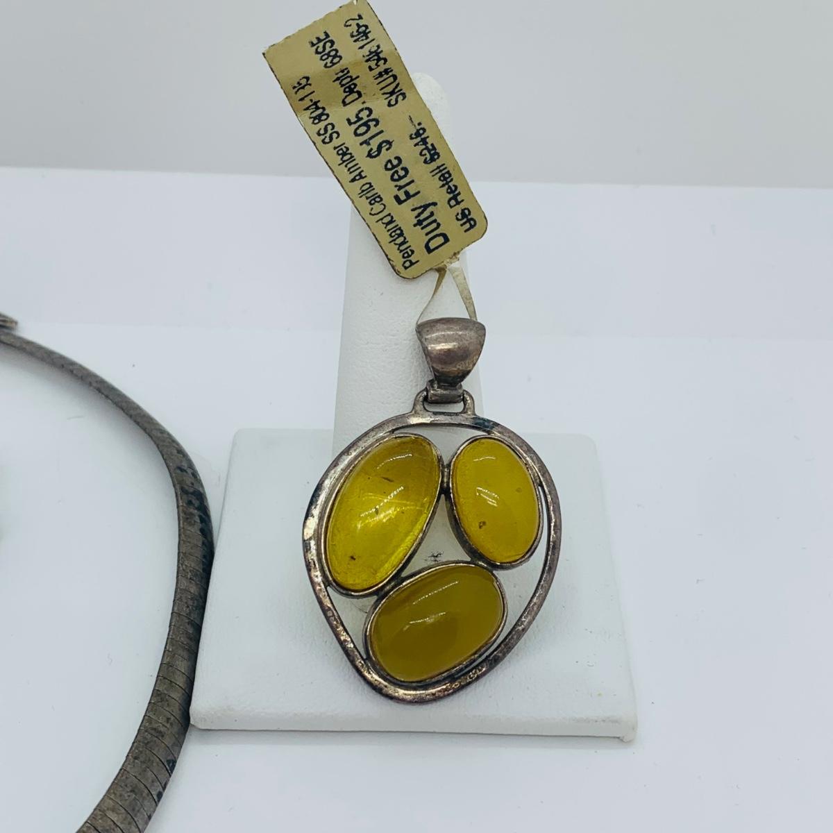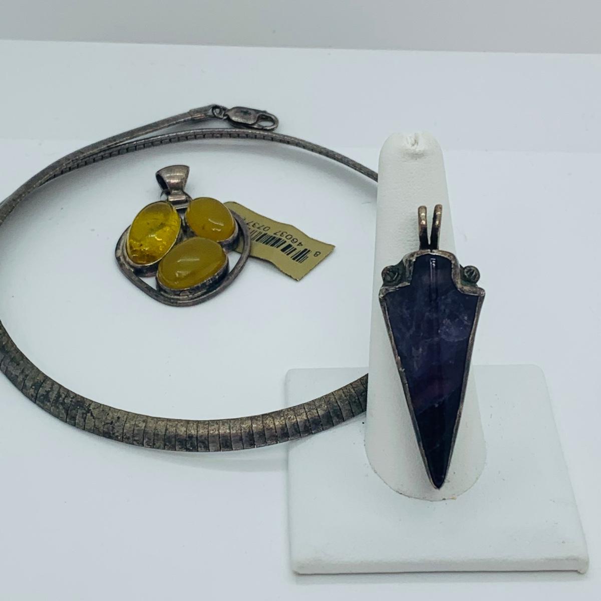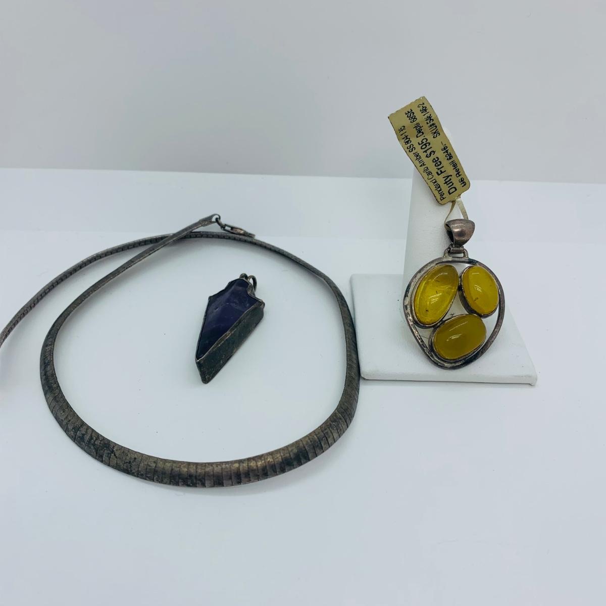 LOT 299: Sterling Silver Choker Style Necklace, Amethyst Stone Pendant & Yellow Stone Pendant