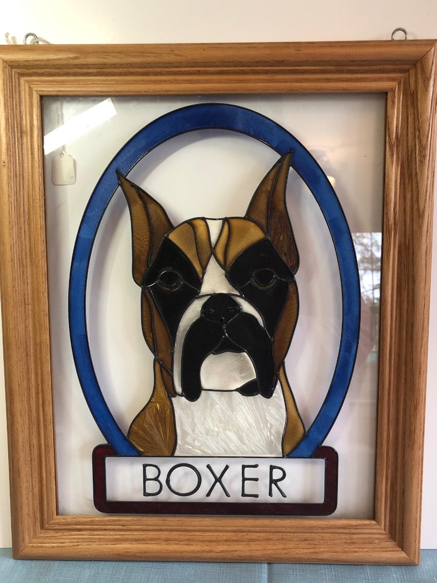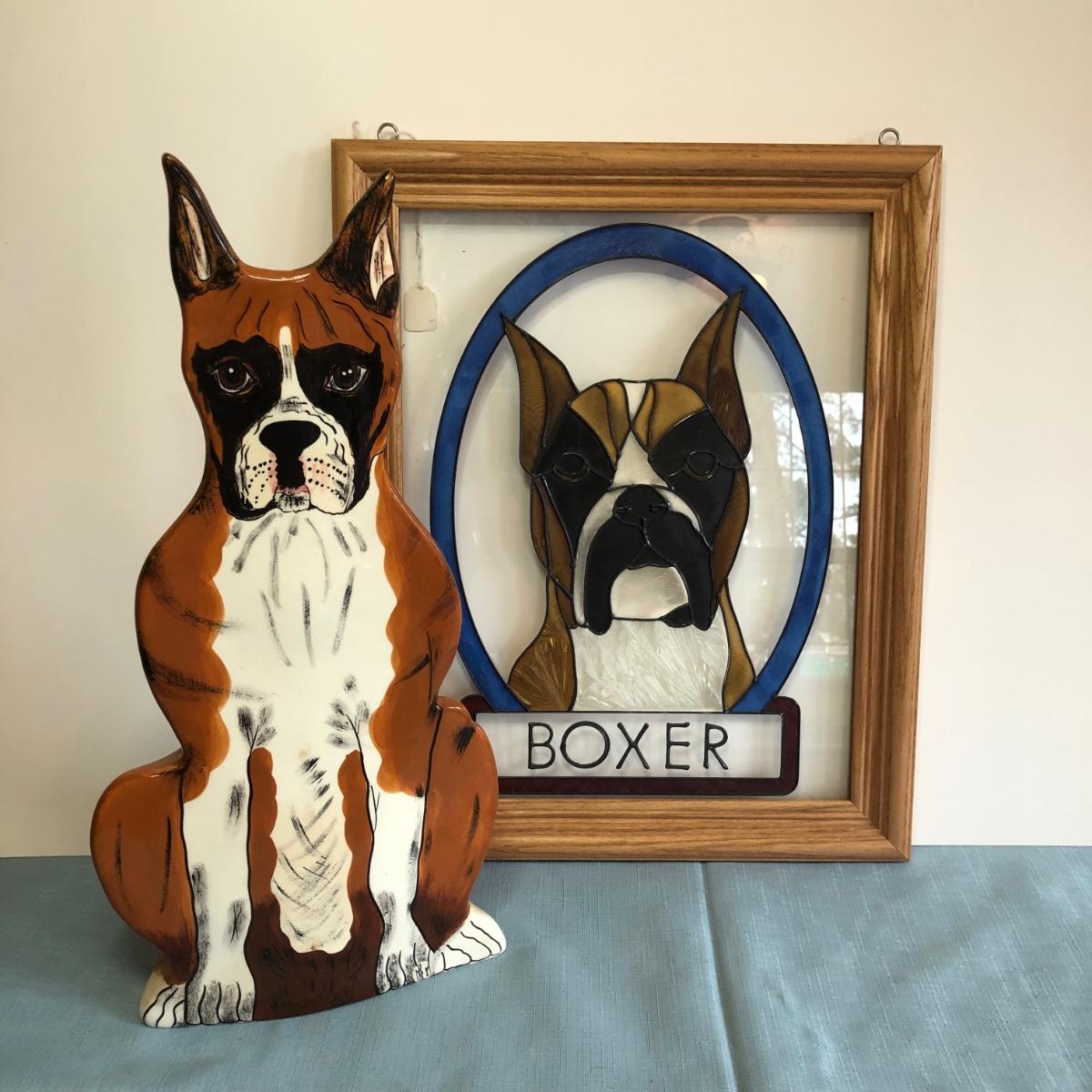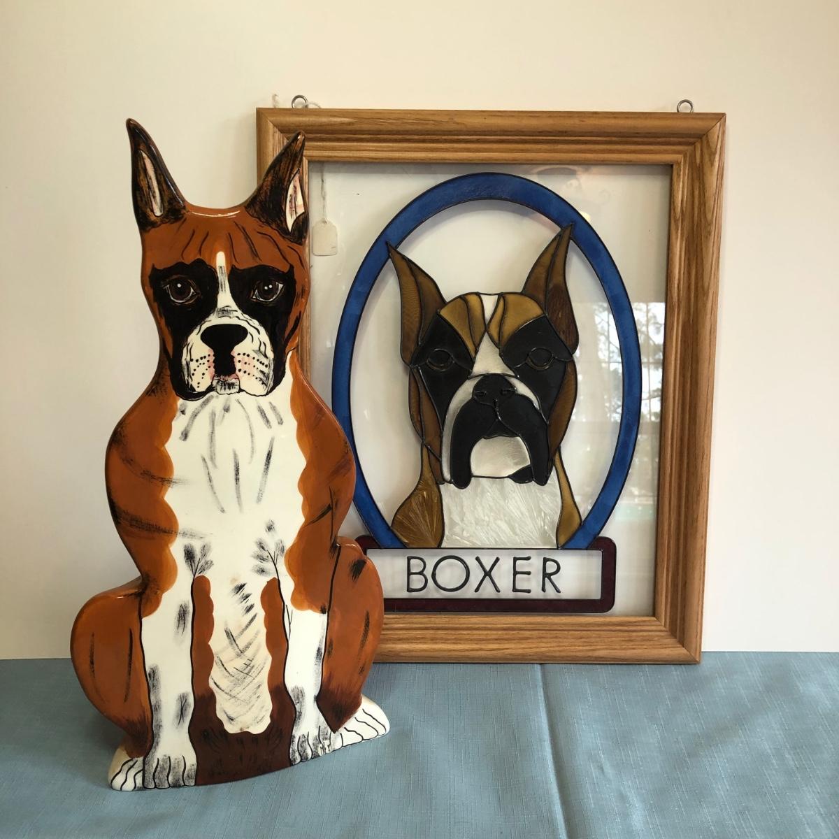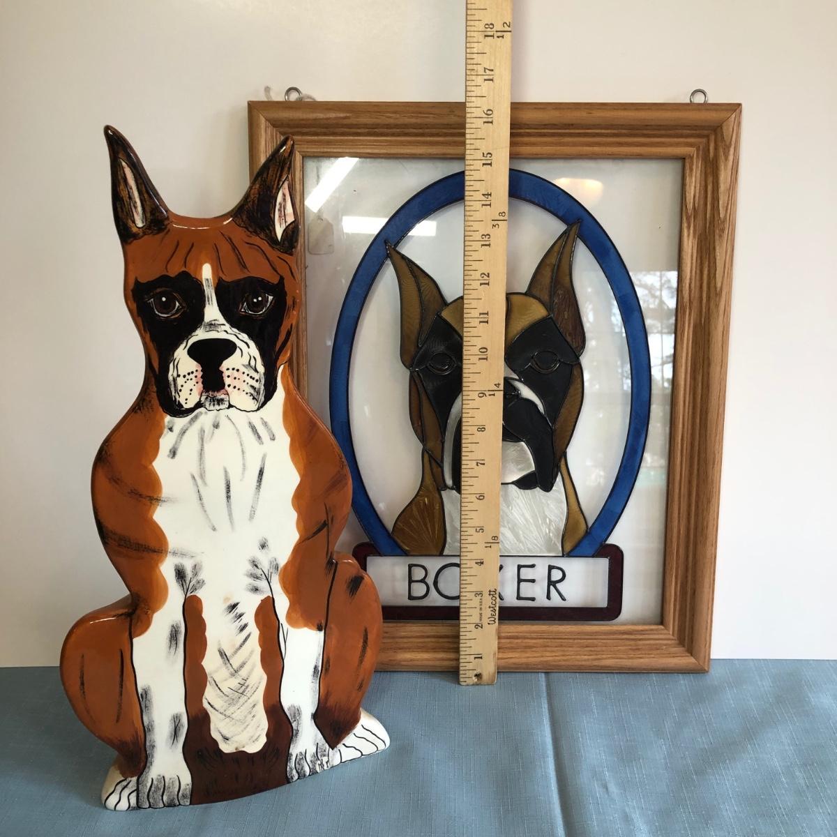 Includes one framed pane of glass with a boxer painted on it and a boxer shaped vase signed "Dogs by Nina." Vase is 16.5 inches tall.