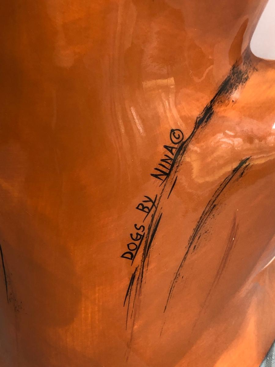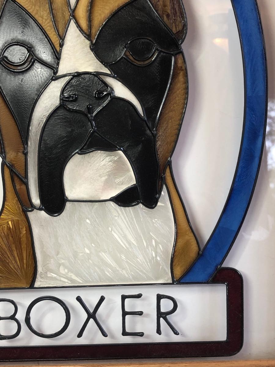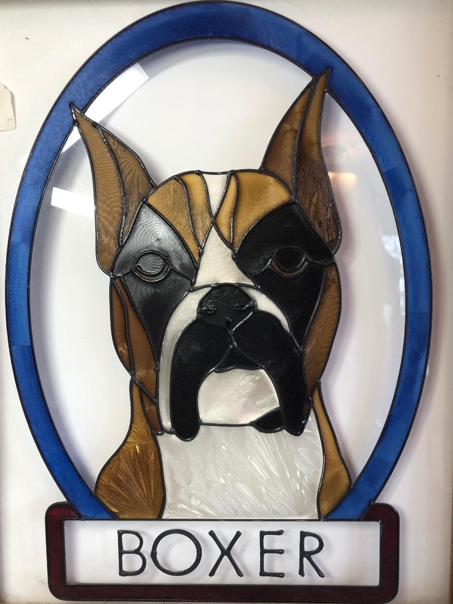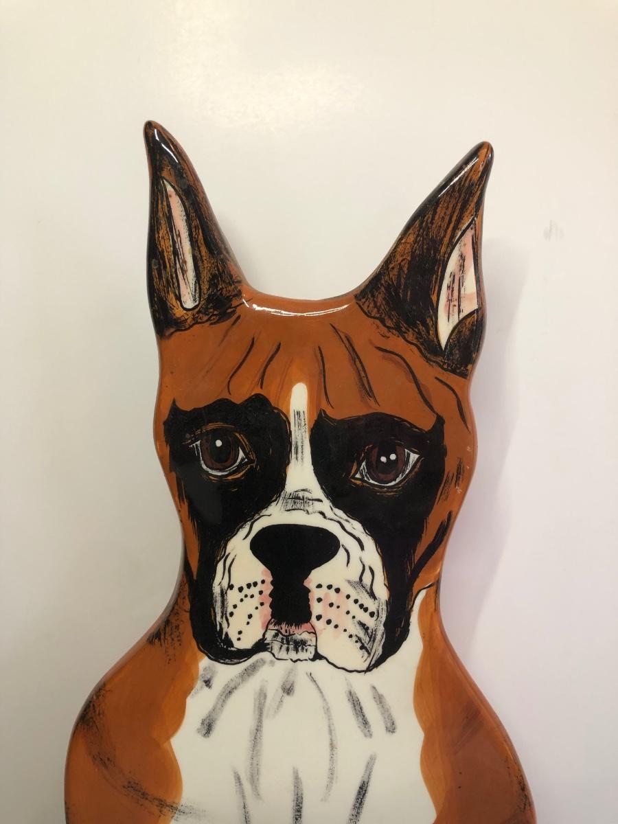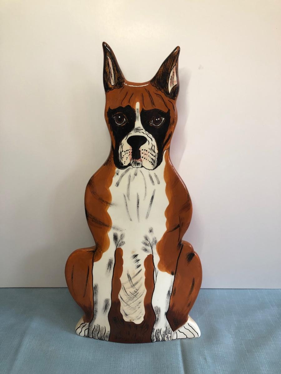 Includes one framed pane of glass with a boxer painted on it and a boxer shaped vase signed "Dogs by Nina." Vase is 16.5 inches tall.
