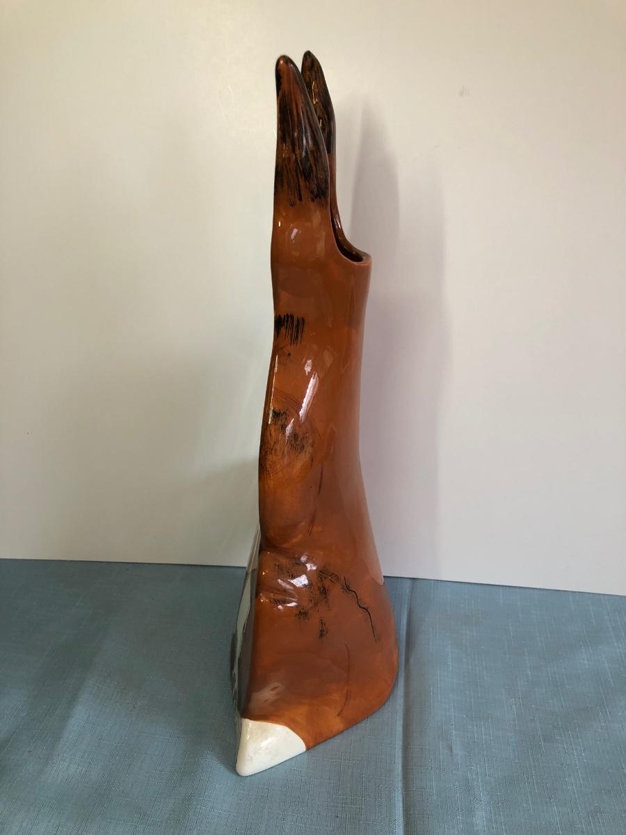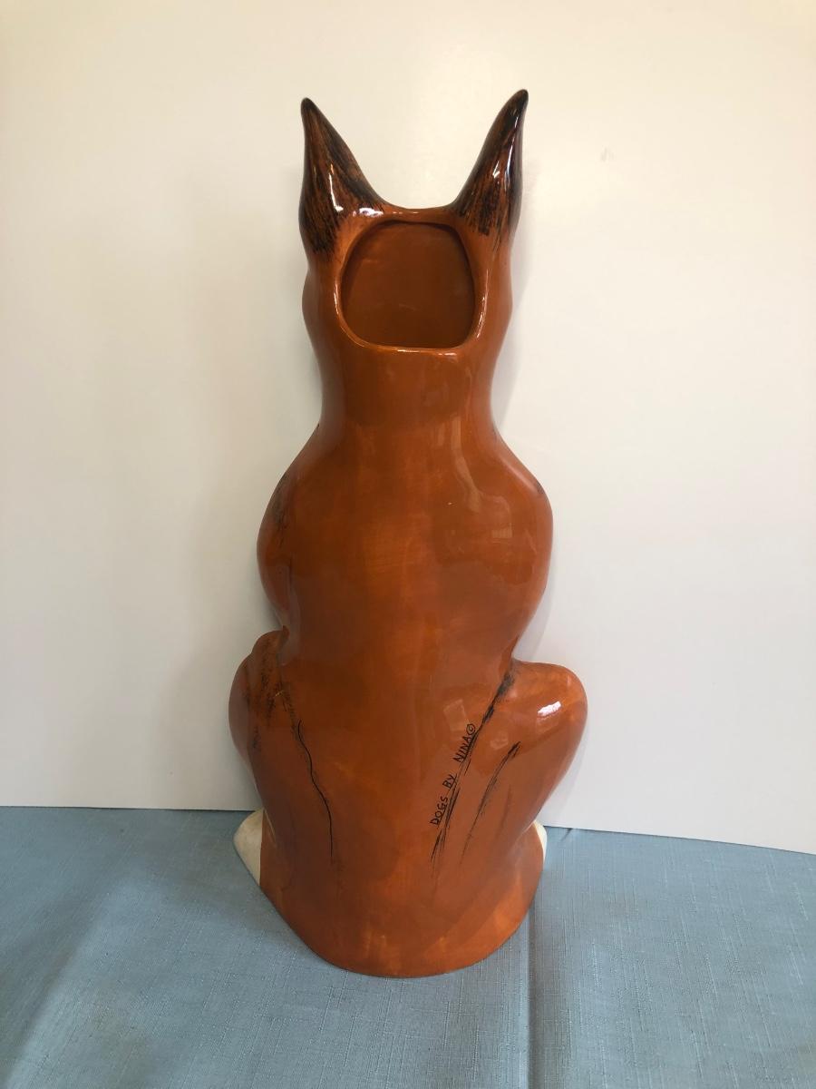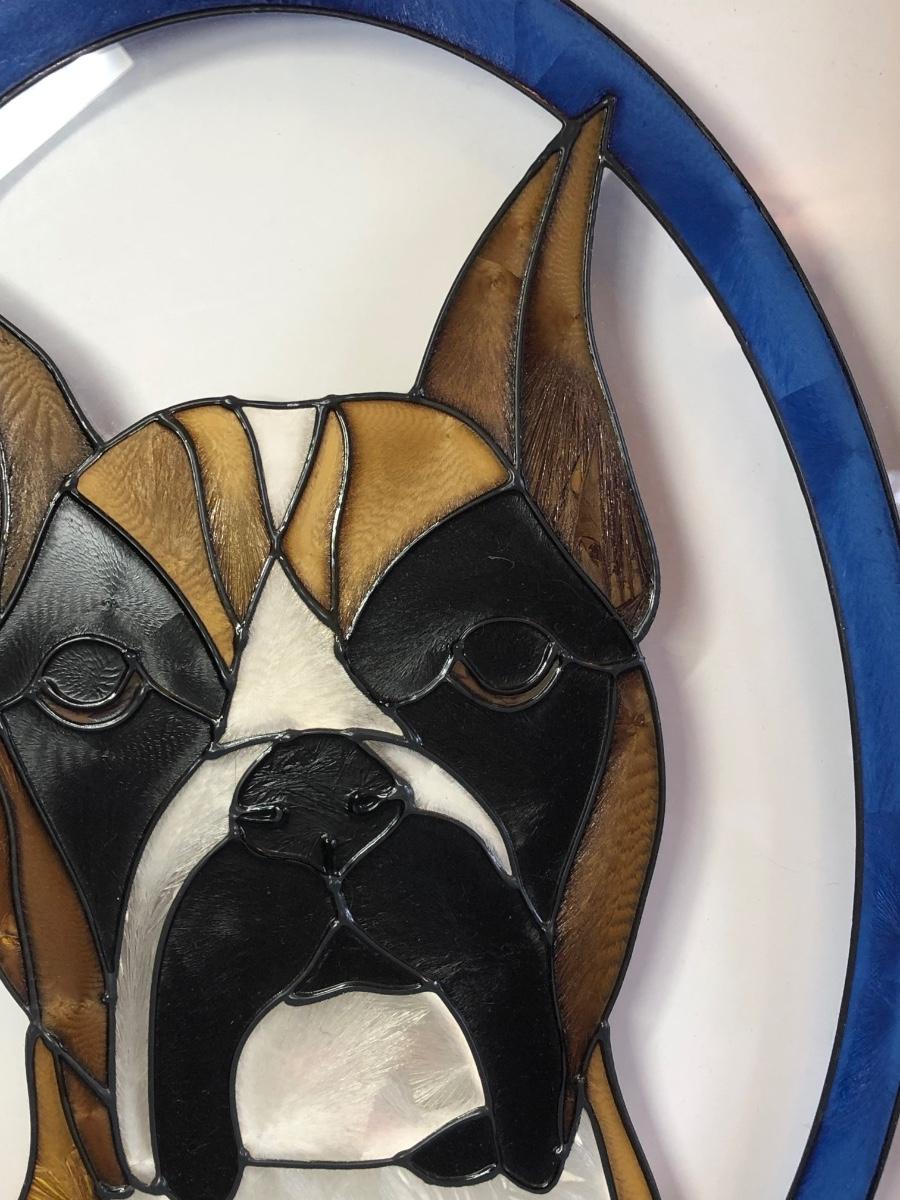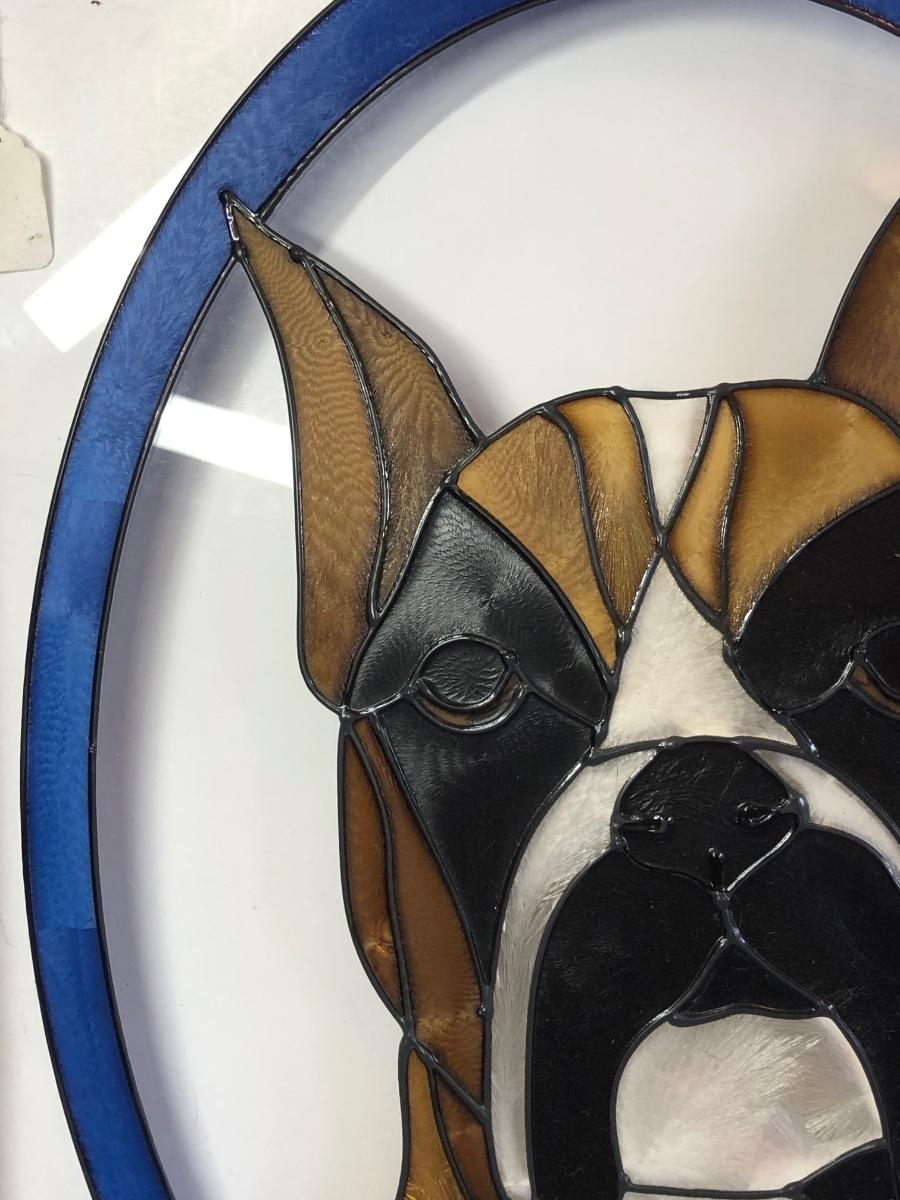 Includes one framed pane of glass with a boxer painted on it and a boxer shaped vase signed "Dogs by Nina." Vase is 16.5 inches tall.
