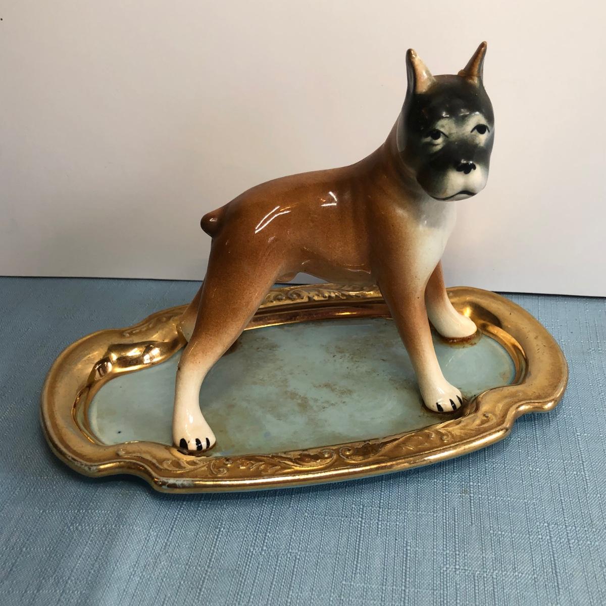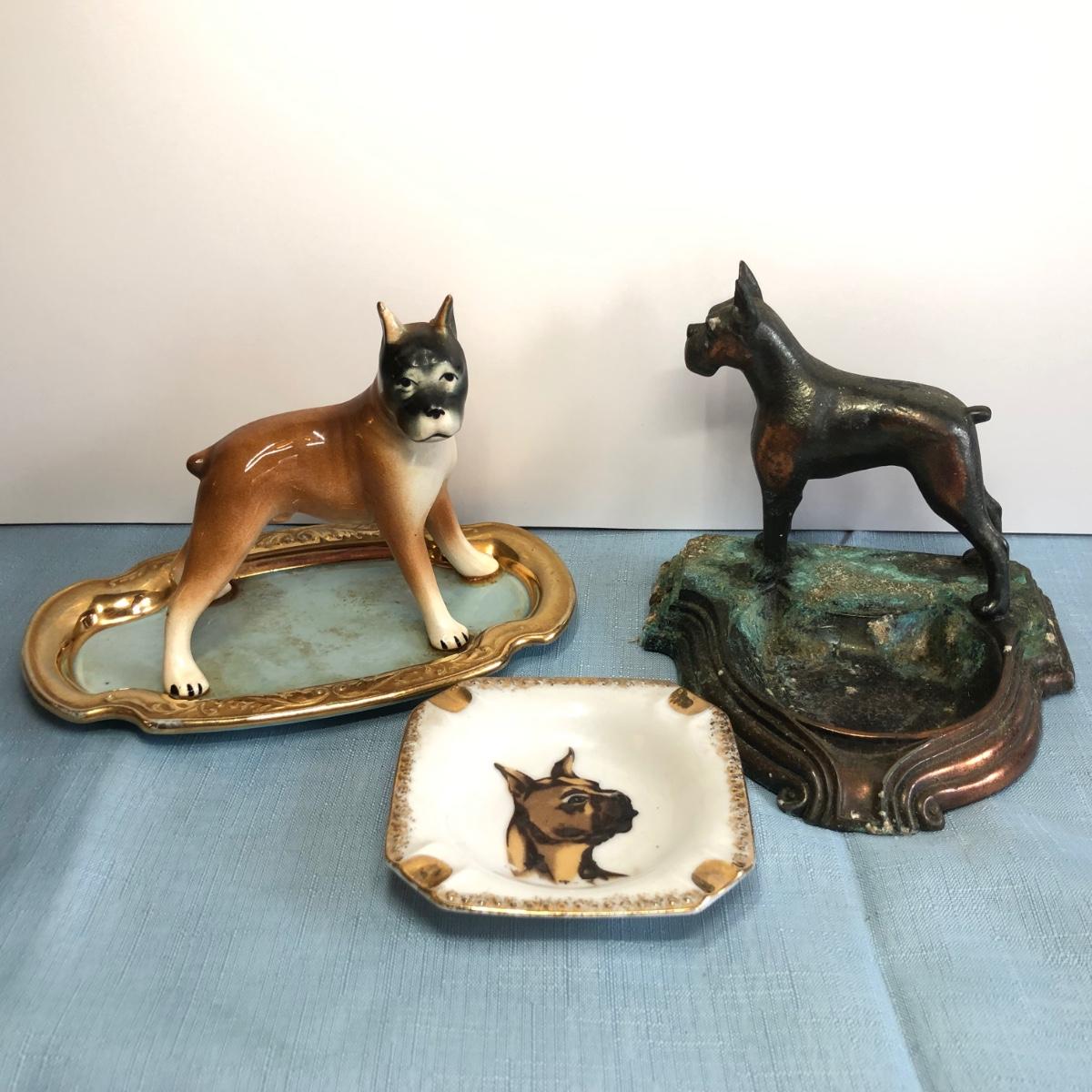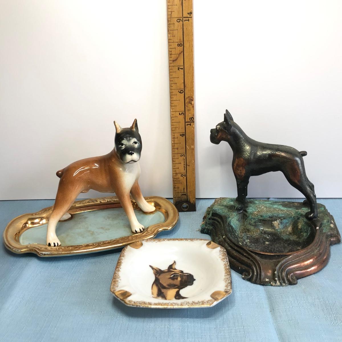 Two ash trays, one metal with a boxer statue and some damage and one pottery with a boxer painted on it and gold colored detailing. The trinket dish has a boxer statue and .22K gold rim.