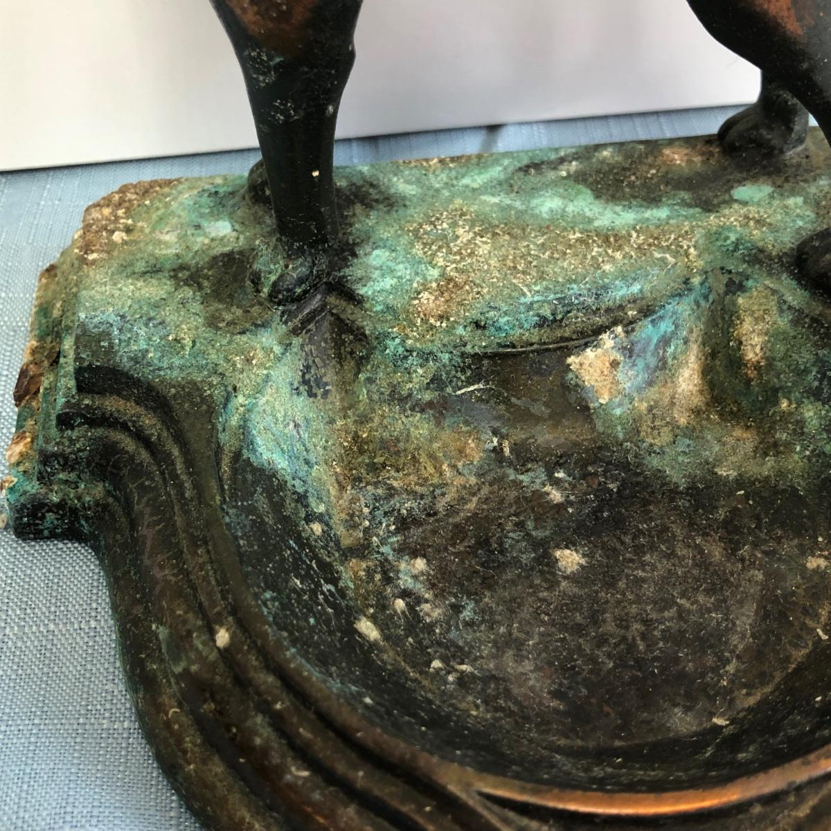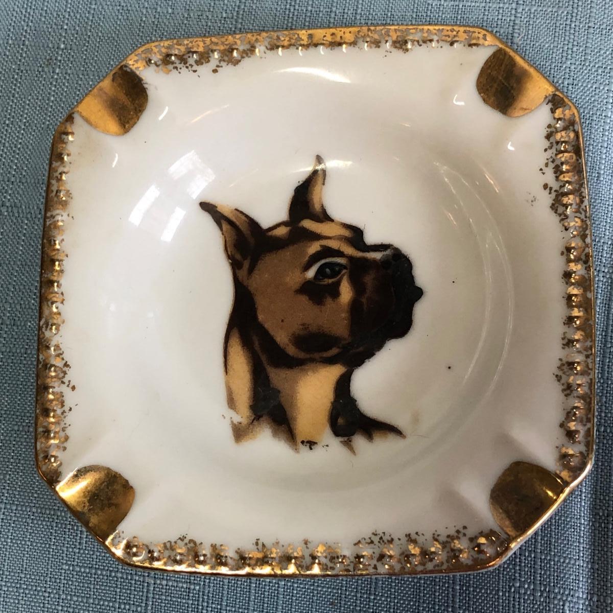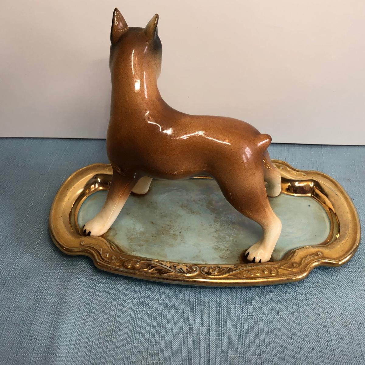 Two ash trays, one metal with a boxer statue and some damage and one pottery with a boxer painted on it and gold colored detailing. The trinket dish has a boxer statue and .22K gold rim.