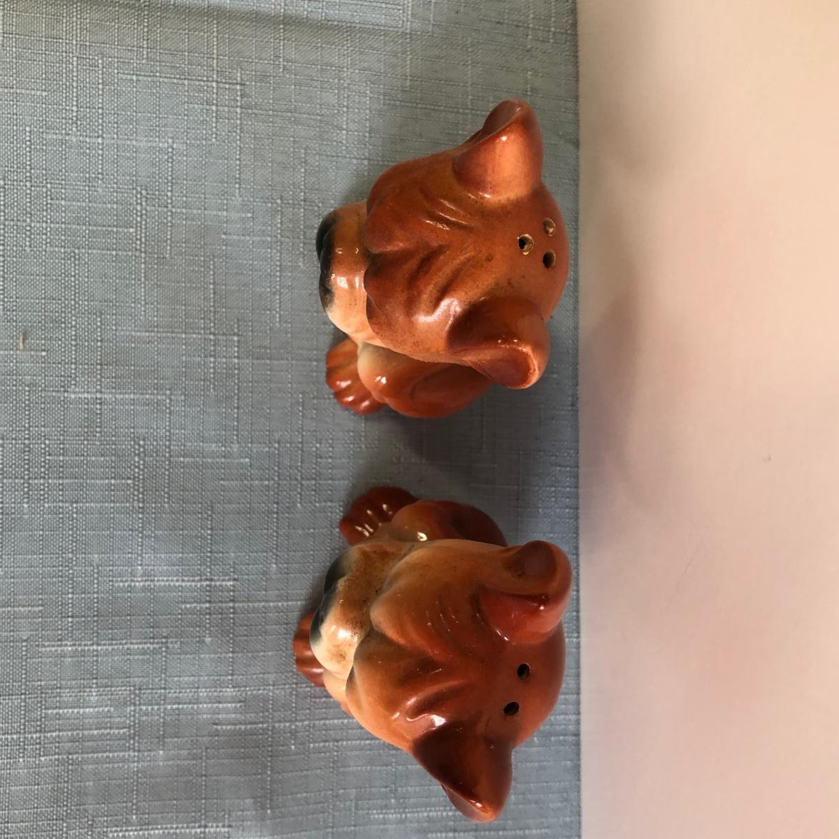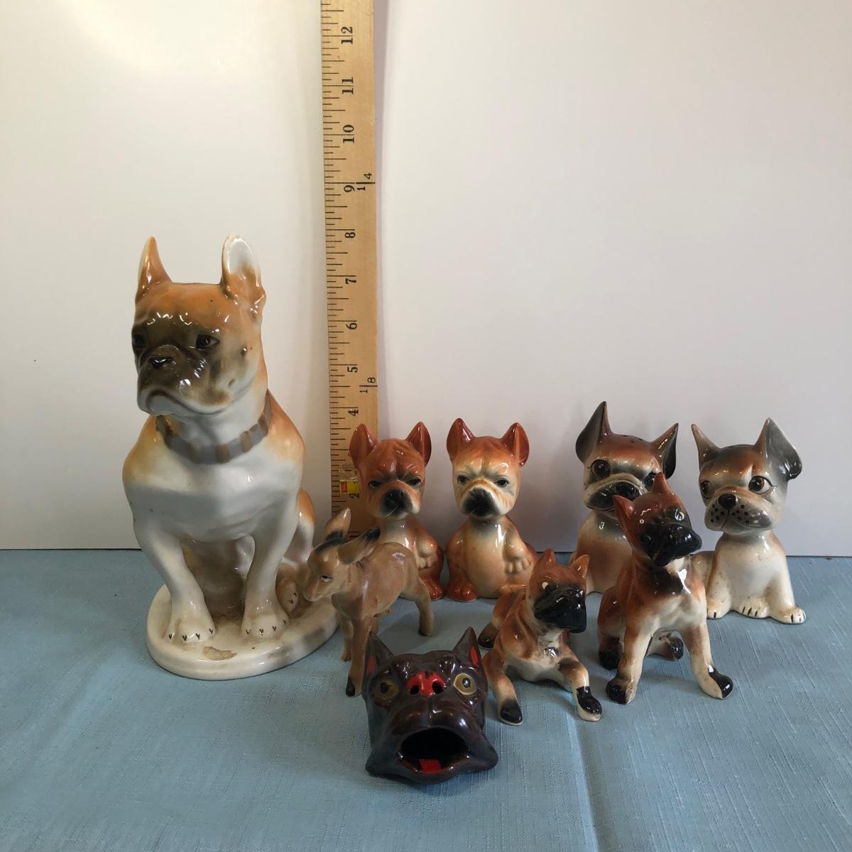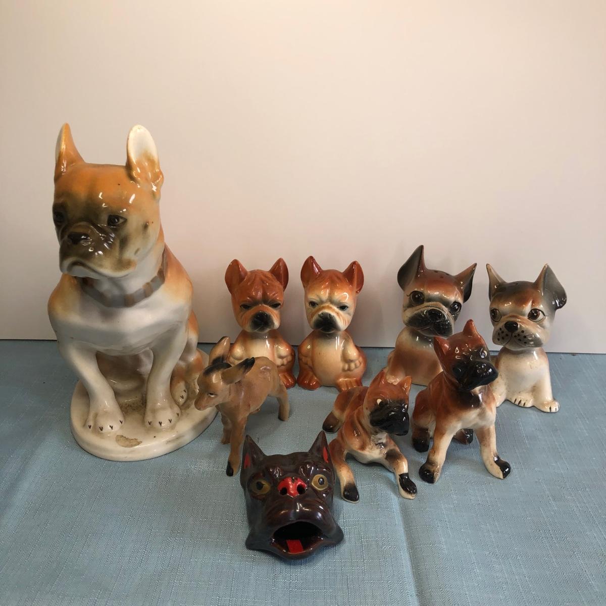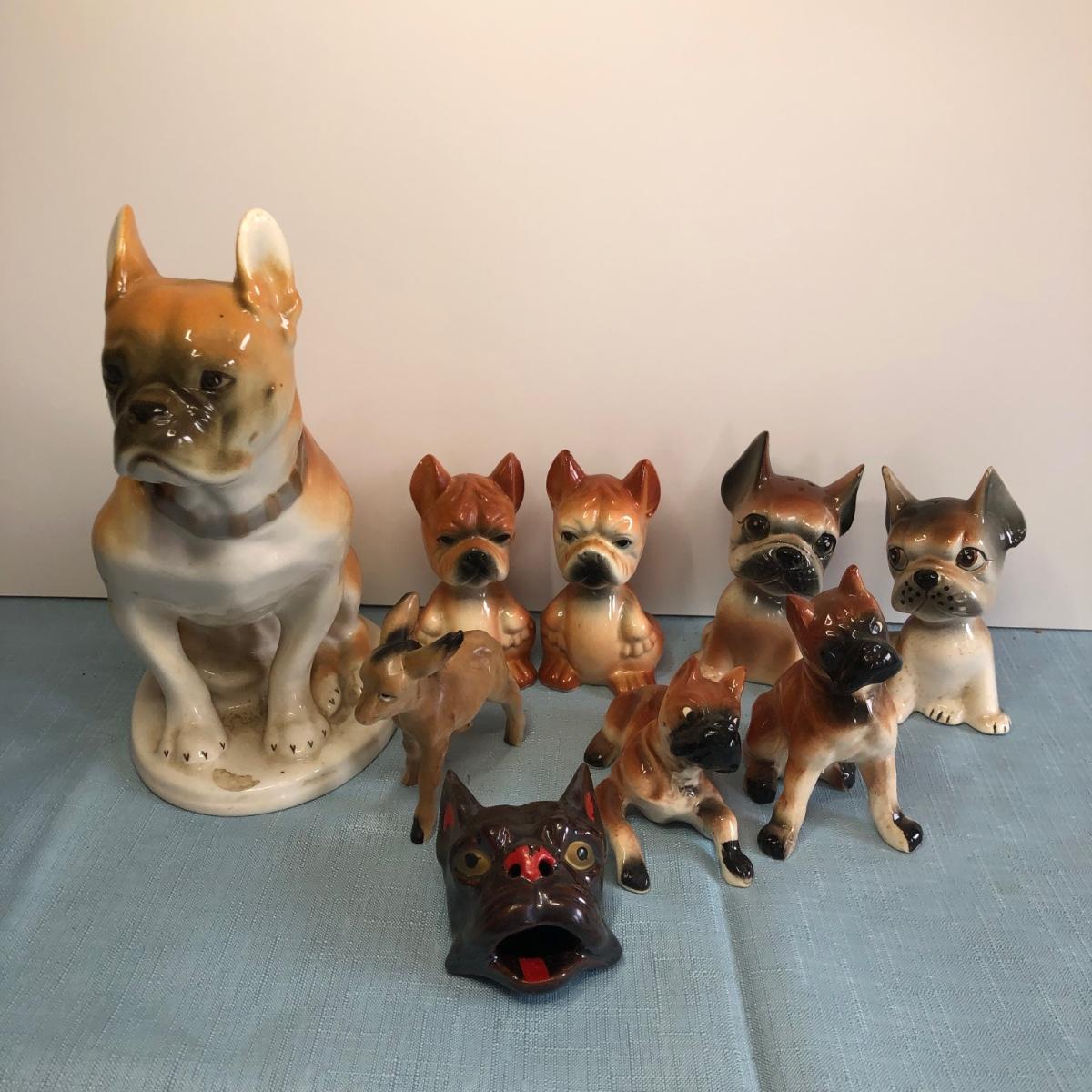 Includes three sets of dog shaped salt & pepper shakers, a small donkey, a larger ceramic statue of a French Bulldog and a small Japanese dog figure.