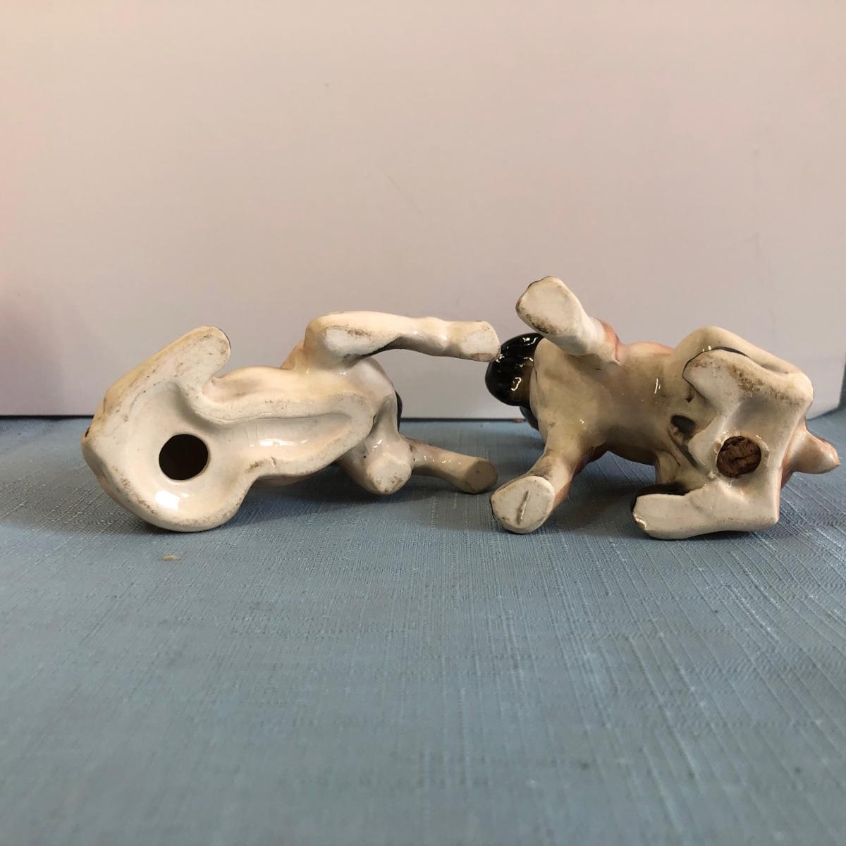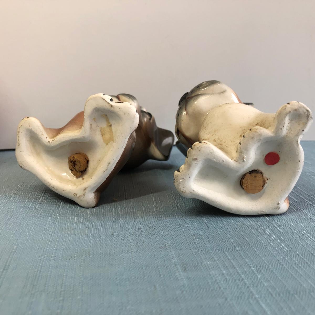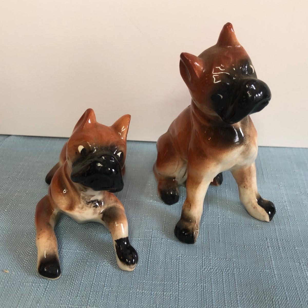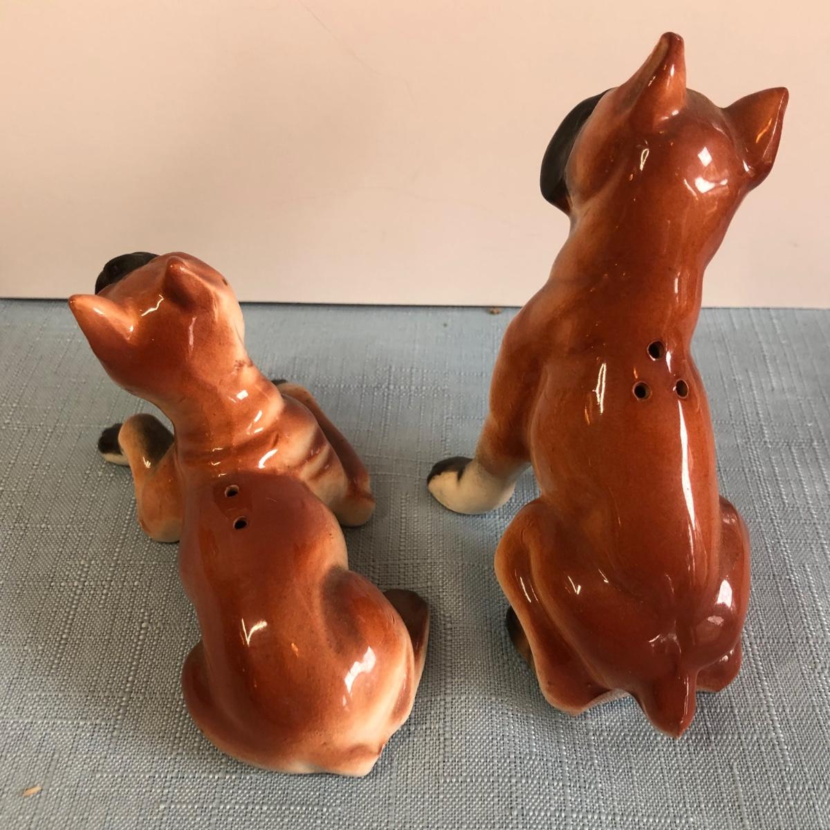 Includes three sets of dog shaped salt & pepper shakers, a small donkey, a larger ceramic statue of a French Bulldog and a small Japanese dog figure.