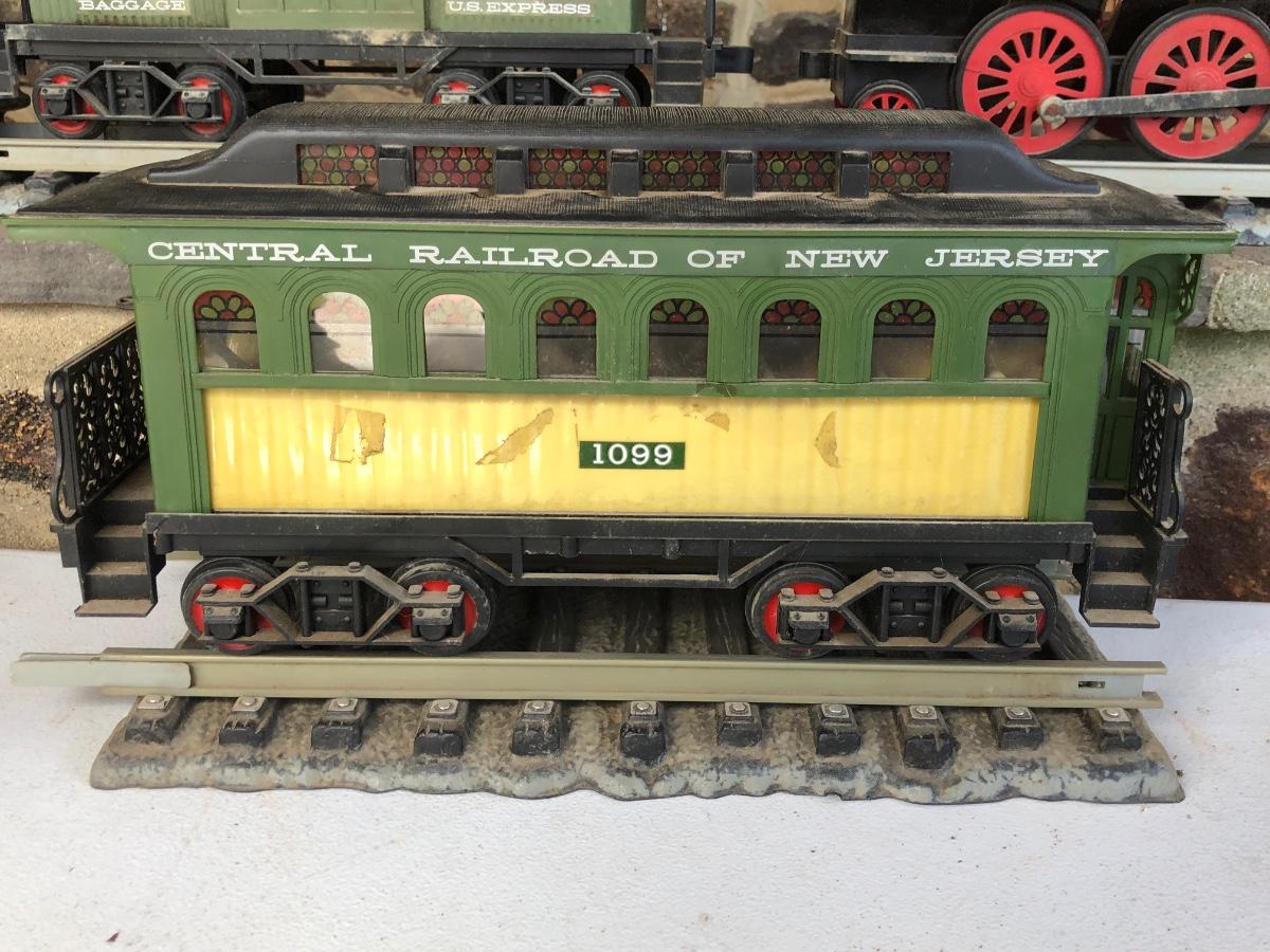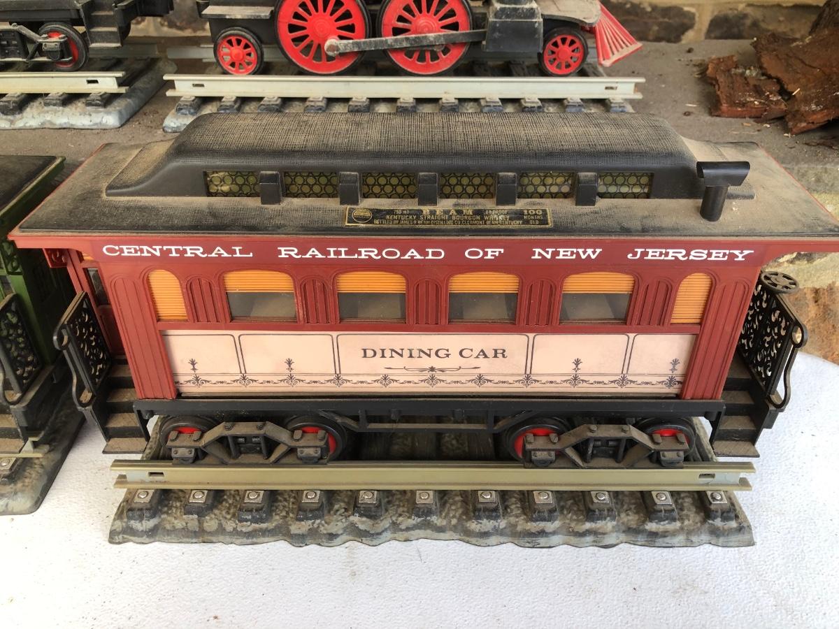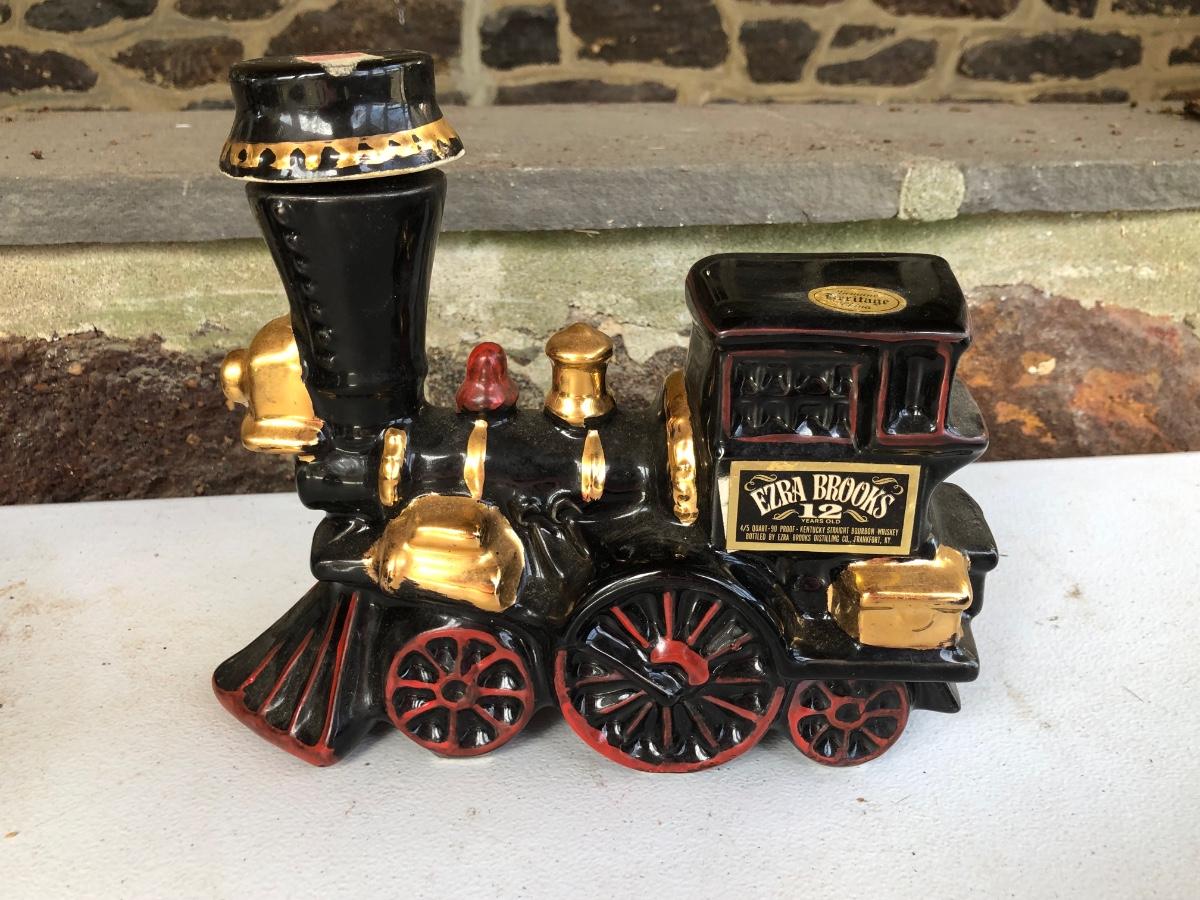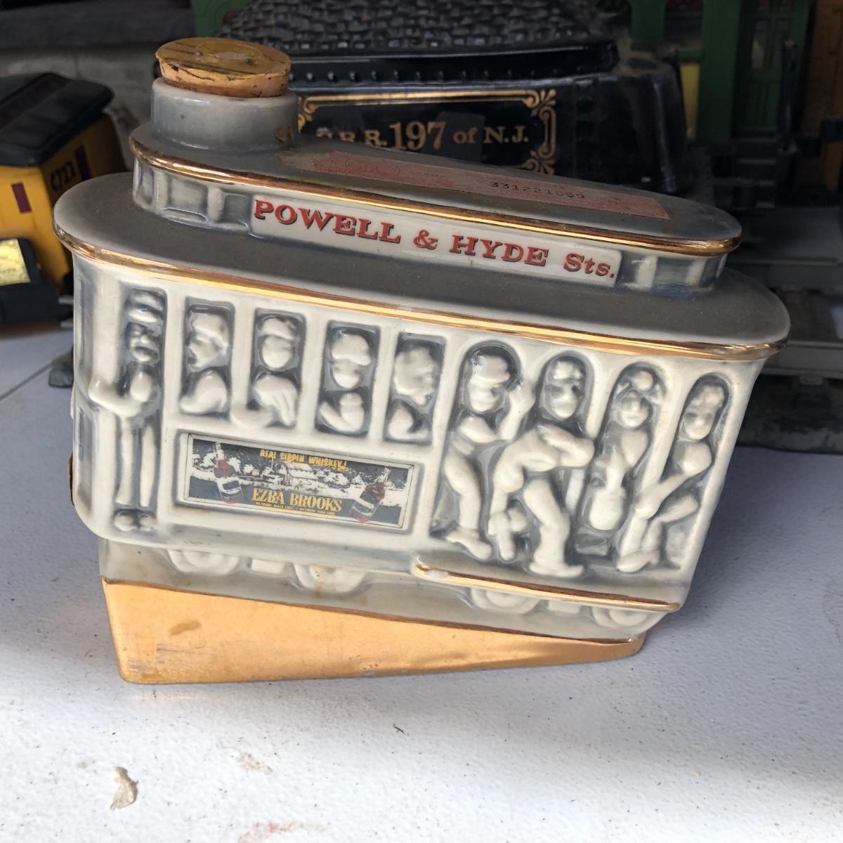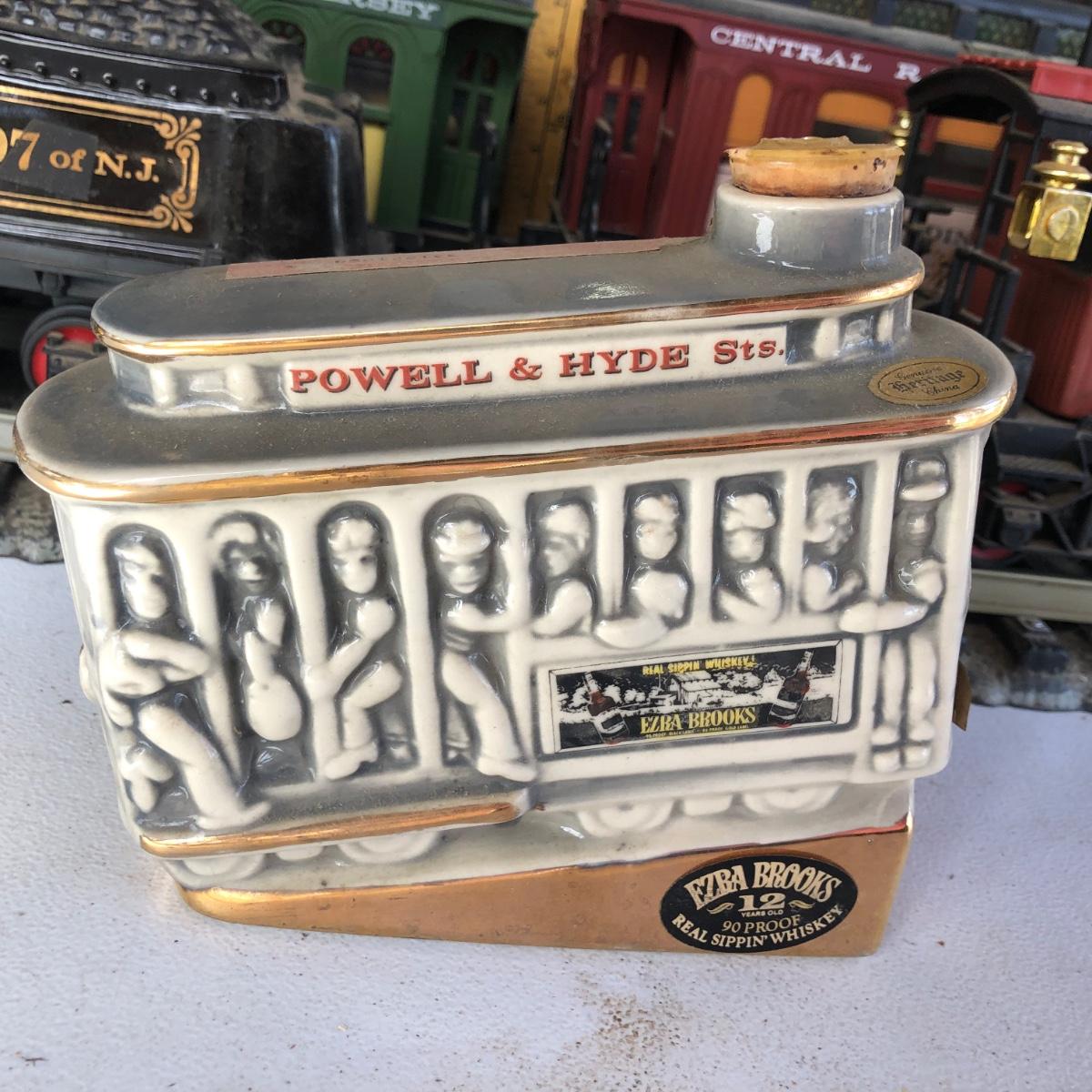 LOT 233M: Central Railroad of New Jersey Decanter Set w/ Track, Ezra Brooks Trolley Decanter & Commemorative Edition McCormick Train Decanter