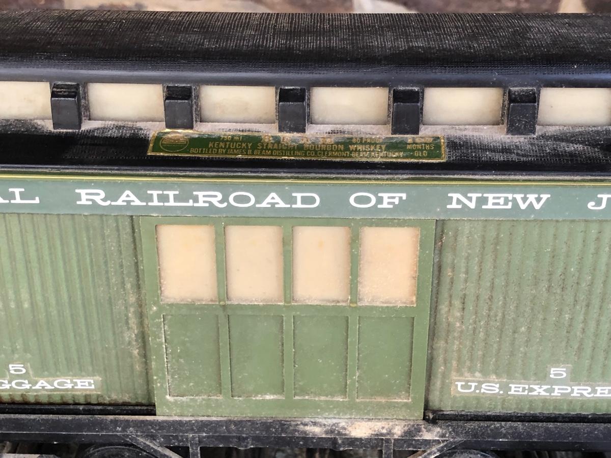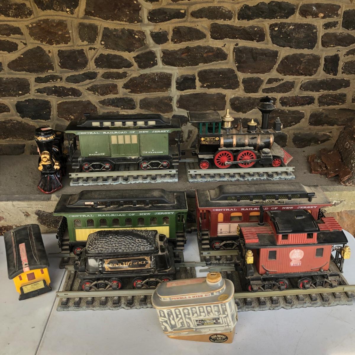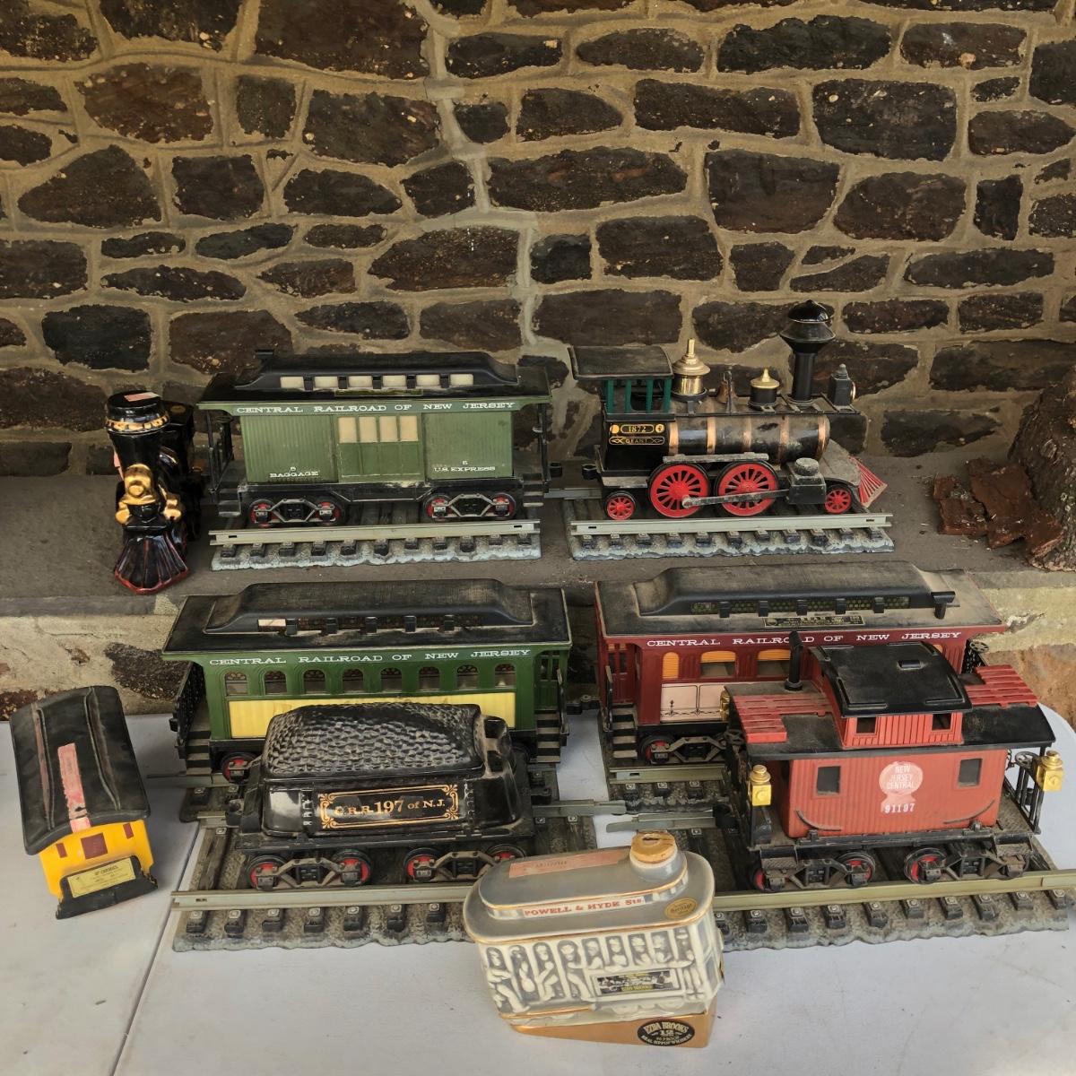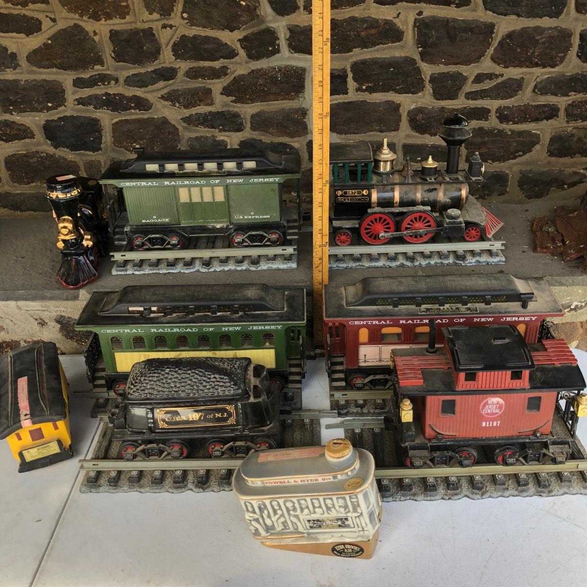Includes six pieces of the Jim Beam Central Railroad of NJ decanter set with track and two other ceramic decanters. CRR of NJ set includes hidden bottle tops in some of the pieces and six tracks for the cars to sit on.