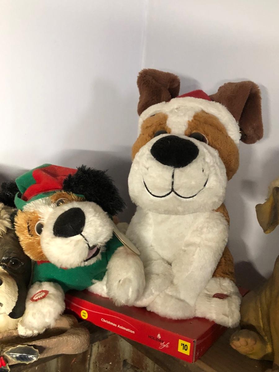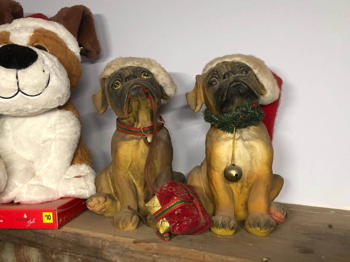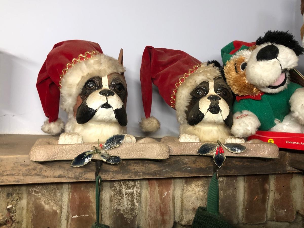LOT 245M: Boxer Christmas Statues, Stockings w/ Hooks & Stuffed Animals