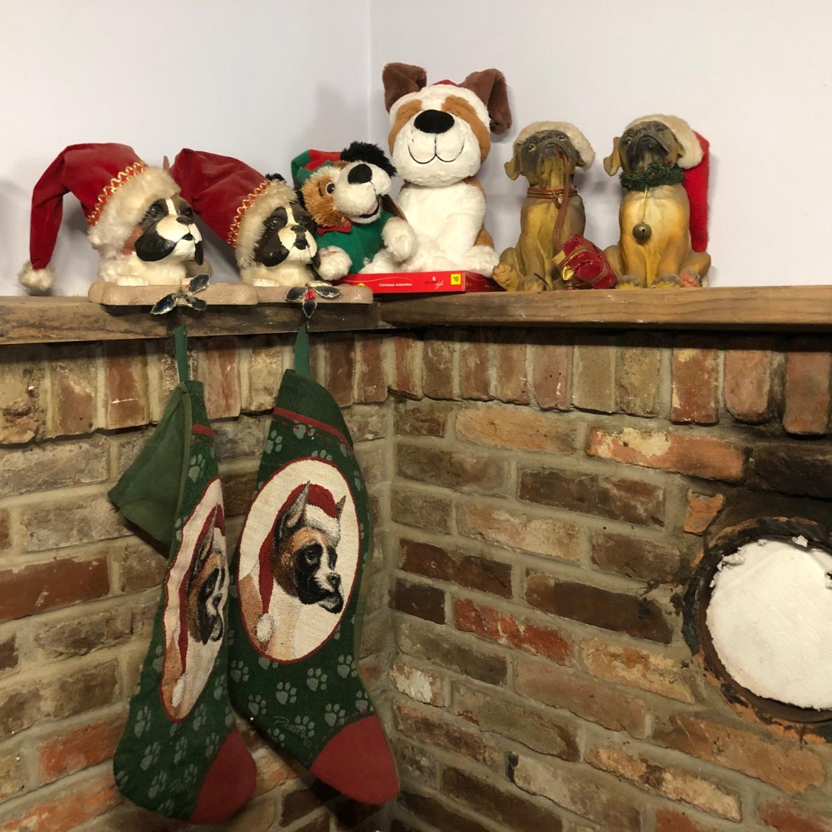 Two stockings with boxers with Santa hats held by two stocking hooks of boxers with Santa hats. Stuffed animals of dogs and two puppy statues with Santa hats.
