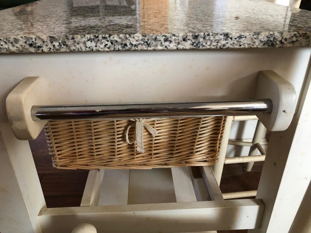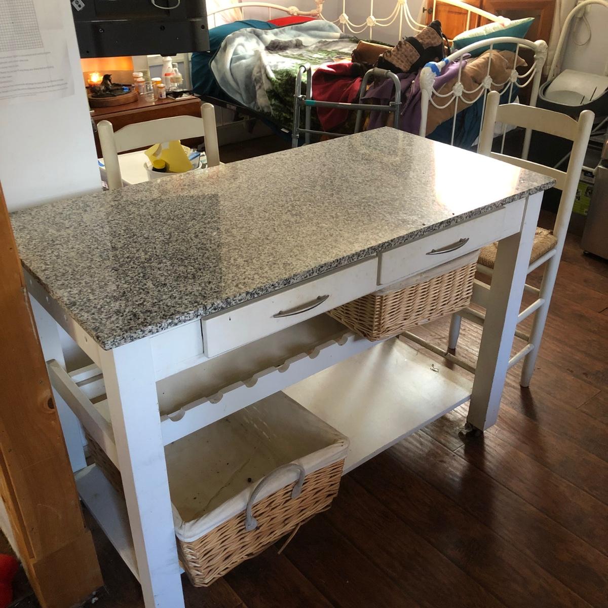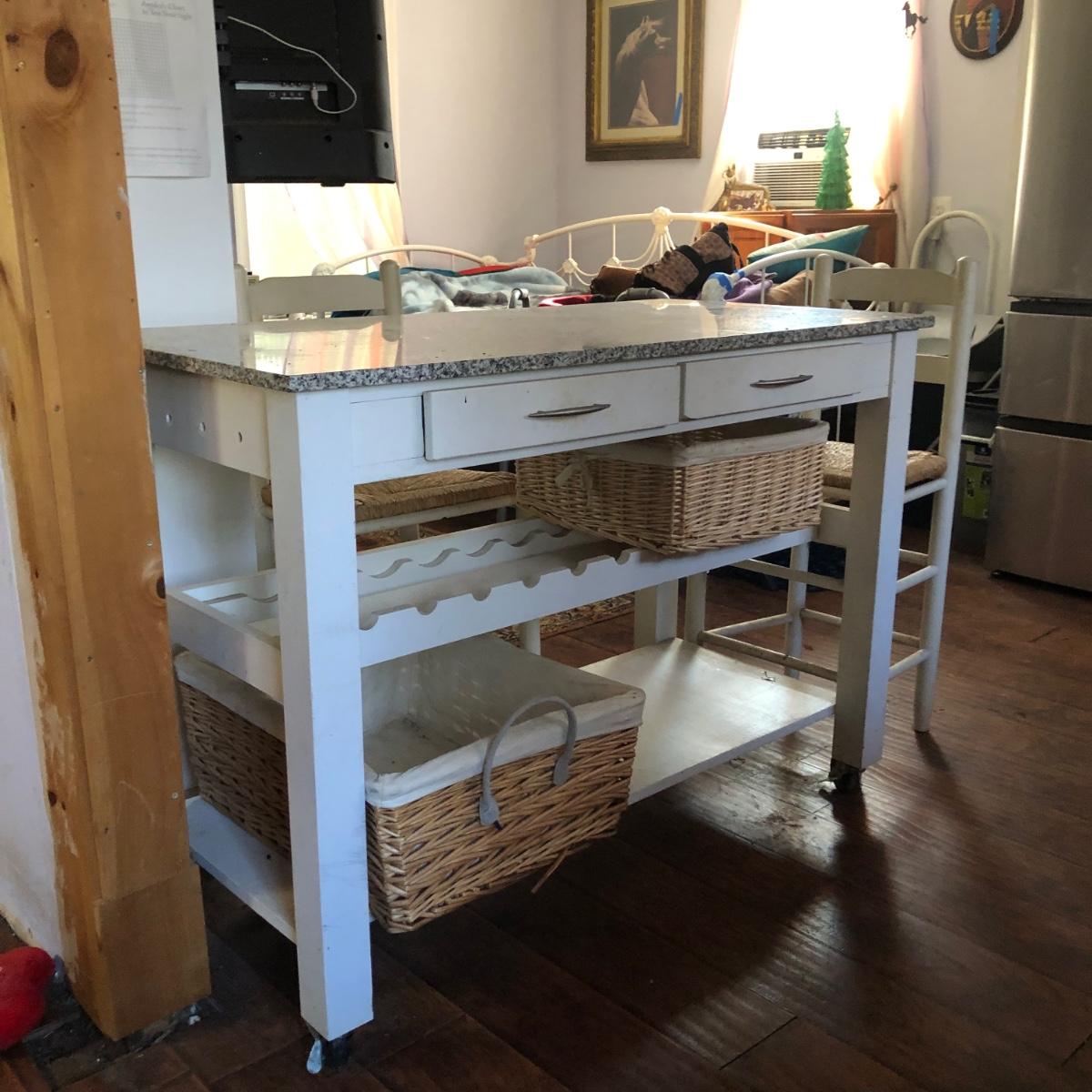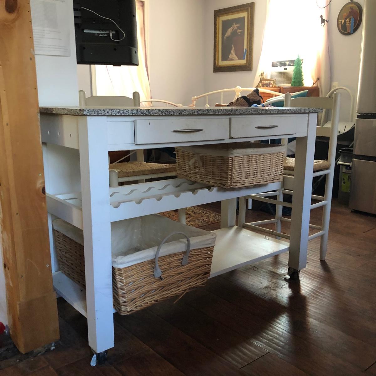 Kitchen table has a rack for bottles and a lower shelf. It is on wheels, white with a faux marble top and two drawers. Includes two baskets and two chairs that sit at the height of the table. Condition is used, see photos. Table measures 46W x 23D x 35H. Chairs measure 17W x 14D x 38H.