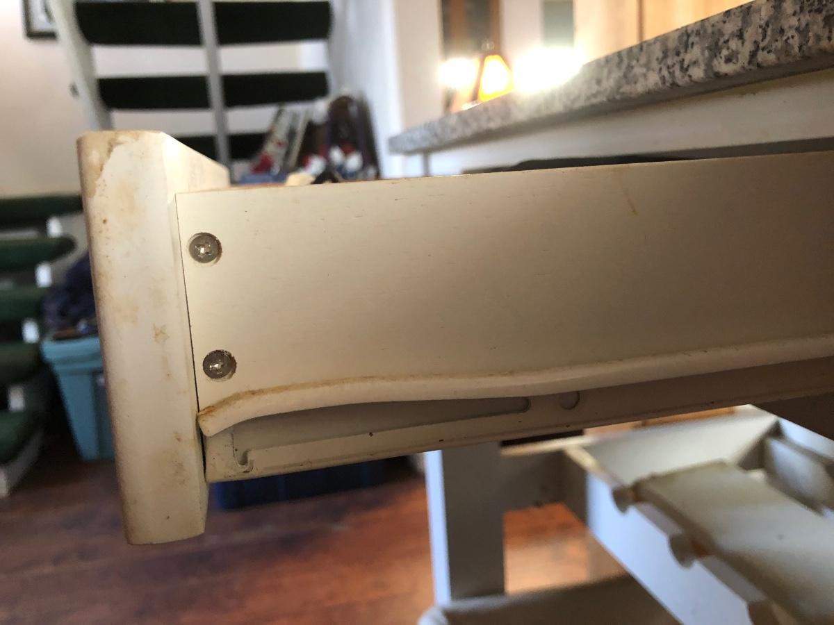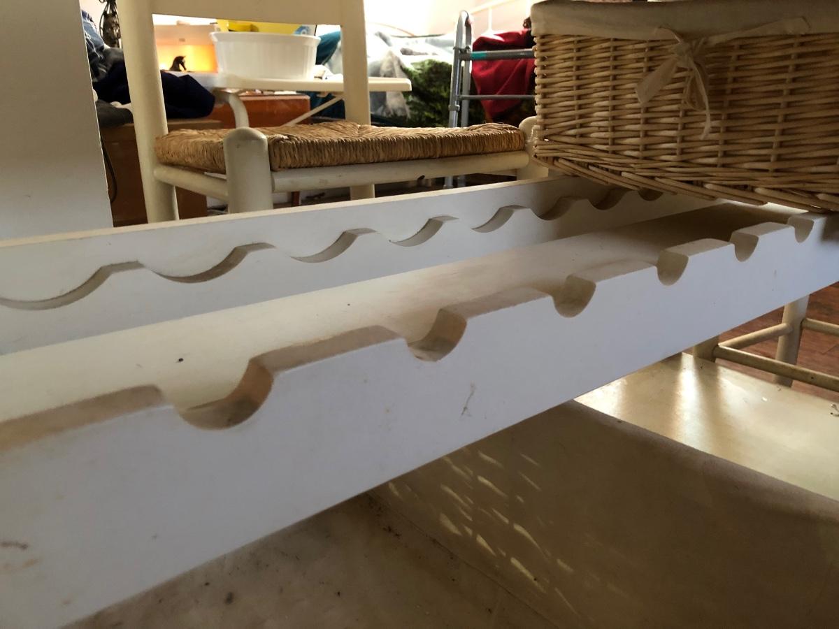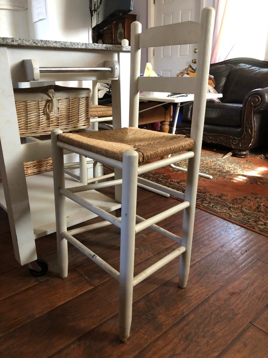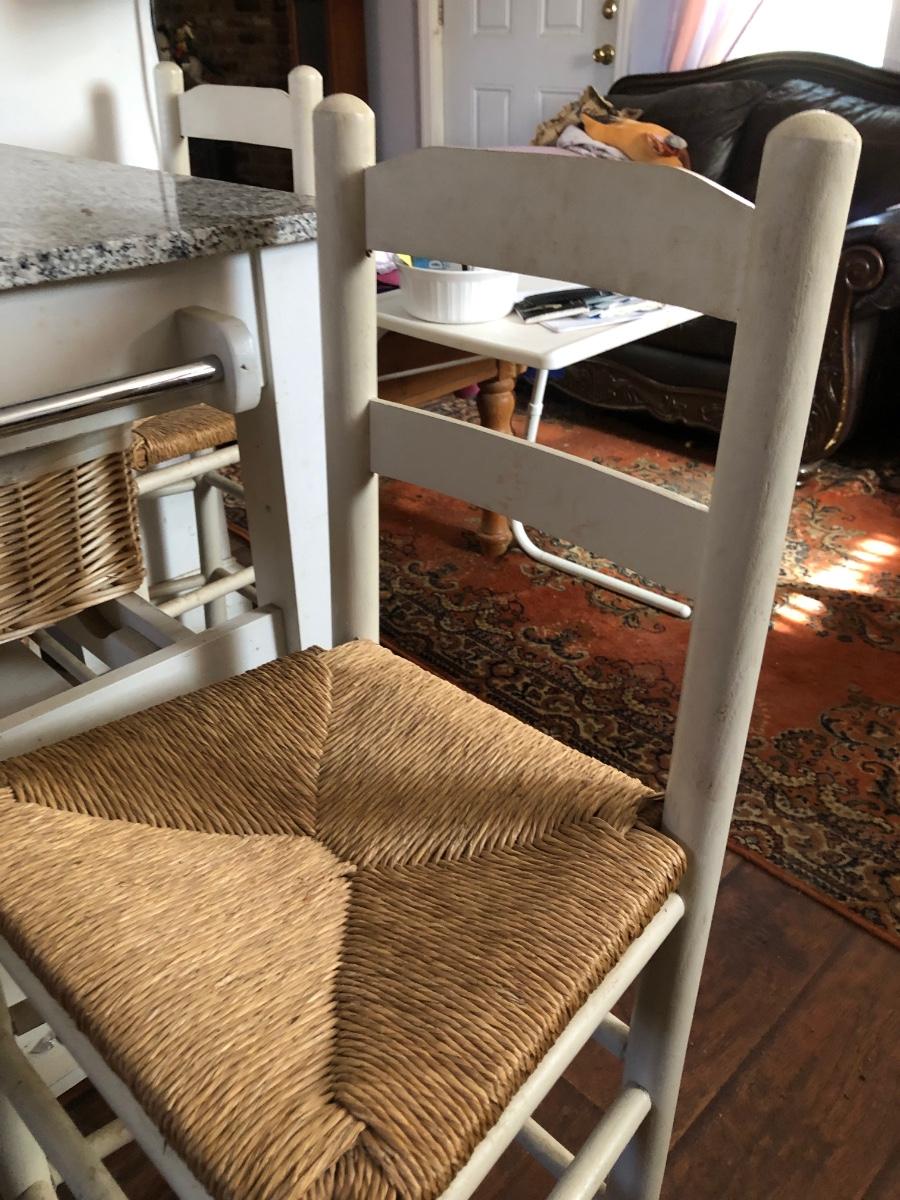 Kitchen table has a rack for bottles and a lower shelf. It is on wheels, white with a faux marble top and two drawers. Includes two baskets and two chairs that sit at the height of the table. Condition is used, see photos. Table measures 46W x 23D x 35H. Chairs measure 17W x 14D x 38H.