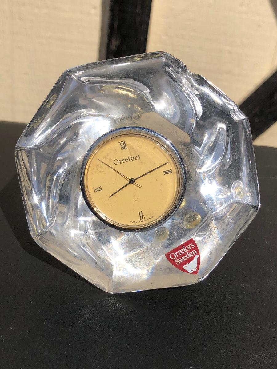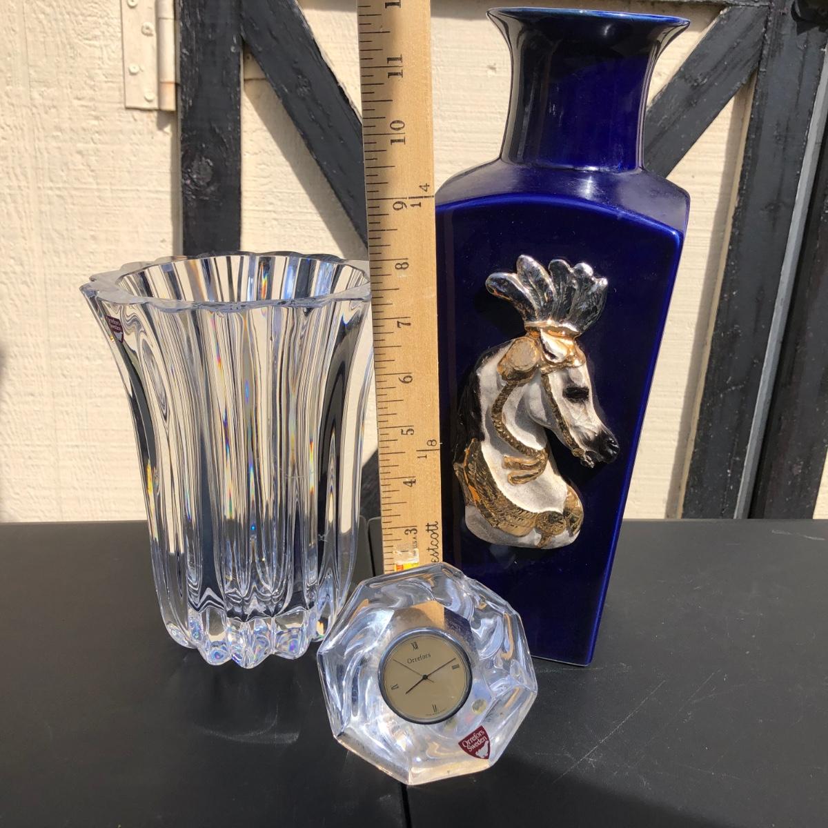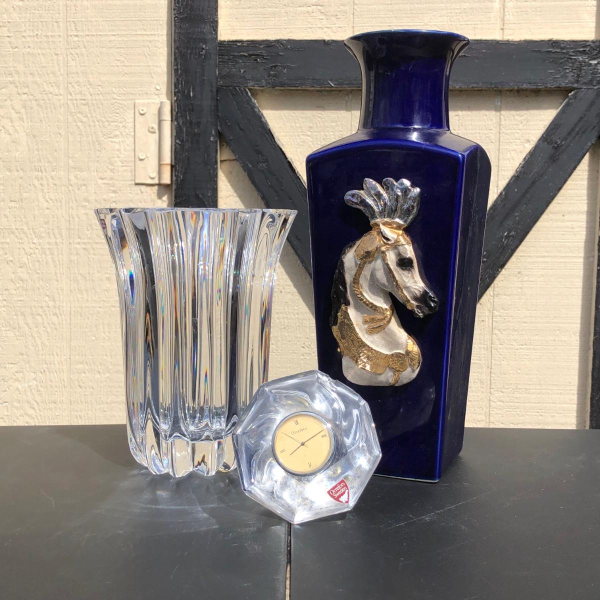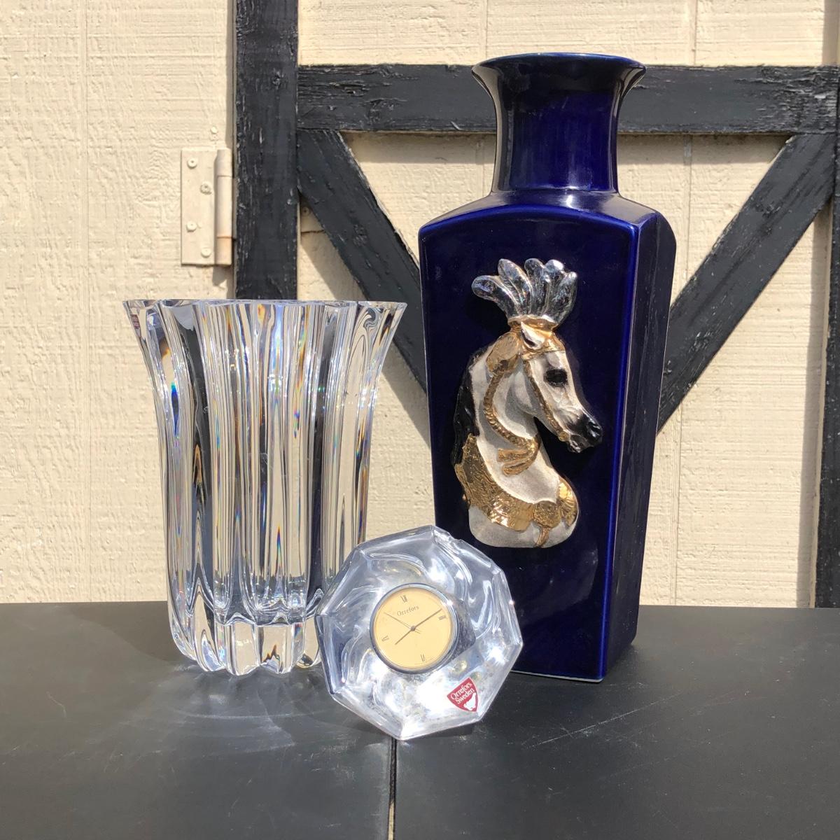 Includes a tall blue vase with a carnival horse on the front of it, a shorter crystal vase and a small clock made by Orrefors in Sweden.