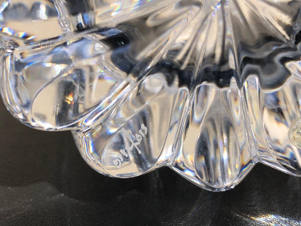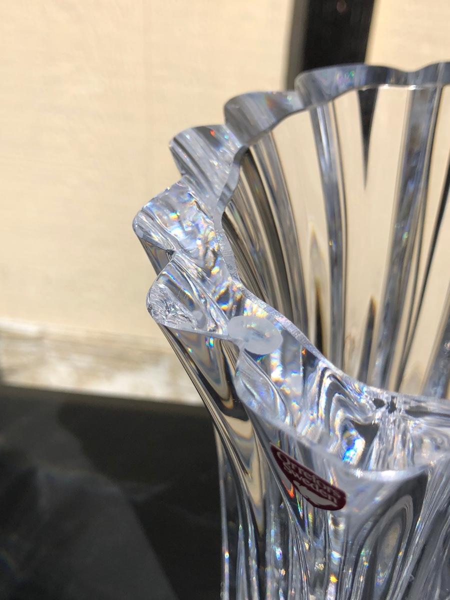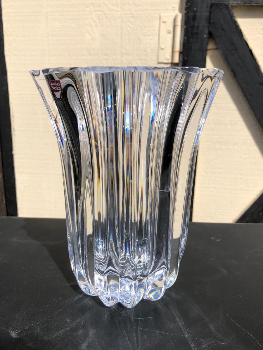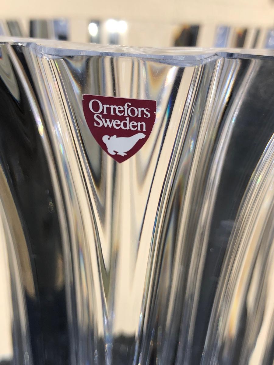Includes a tall blue vase with a carnival horse on the front of it, a shorter crystal vase and a small clock made by Orrefors in Sweden.