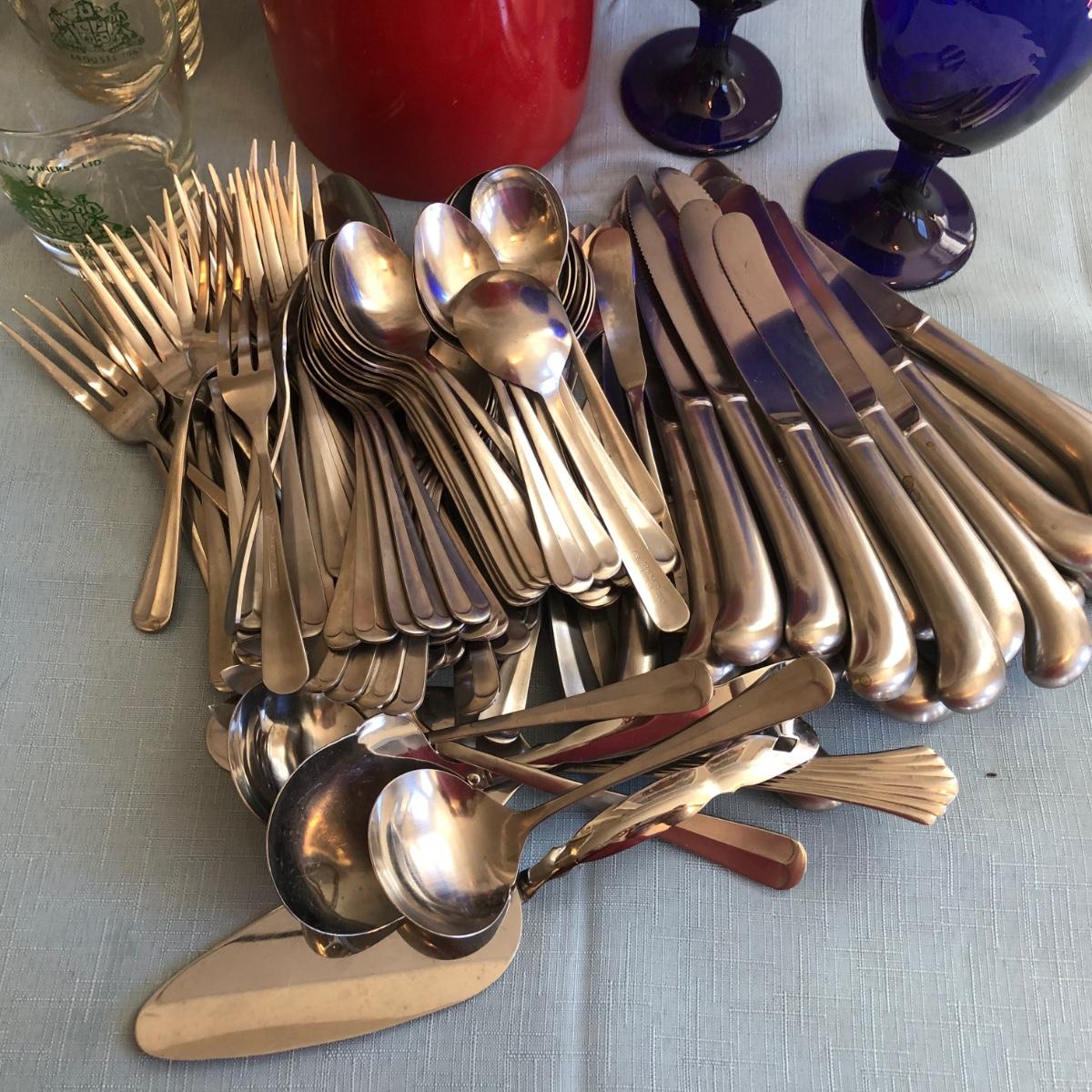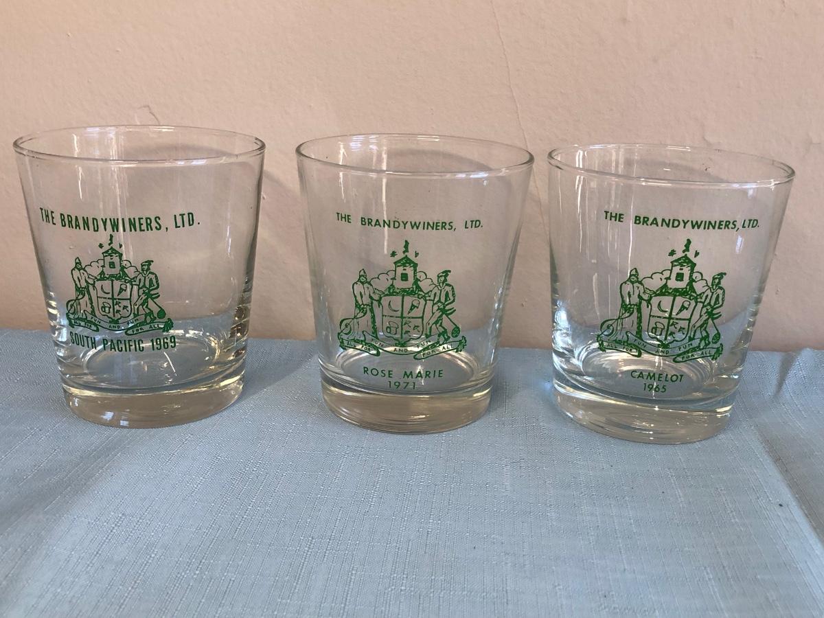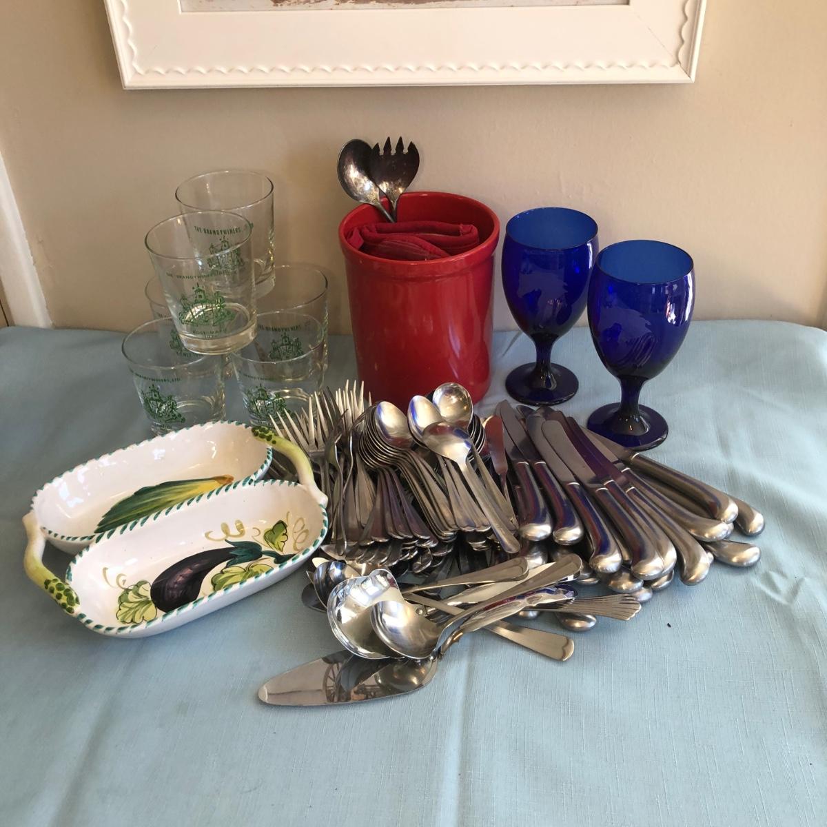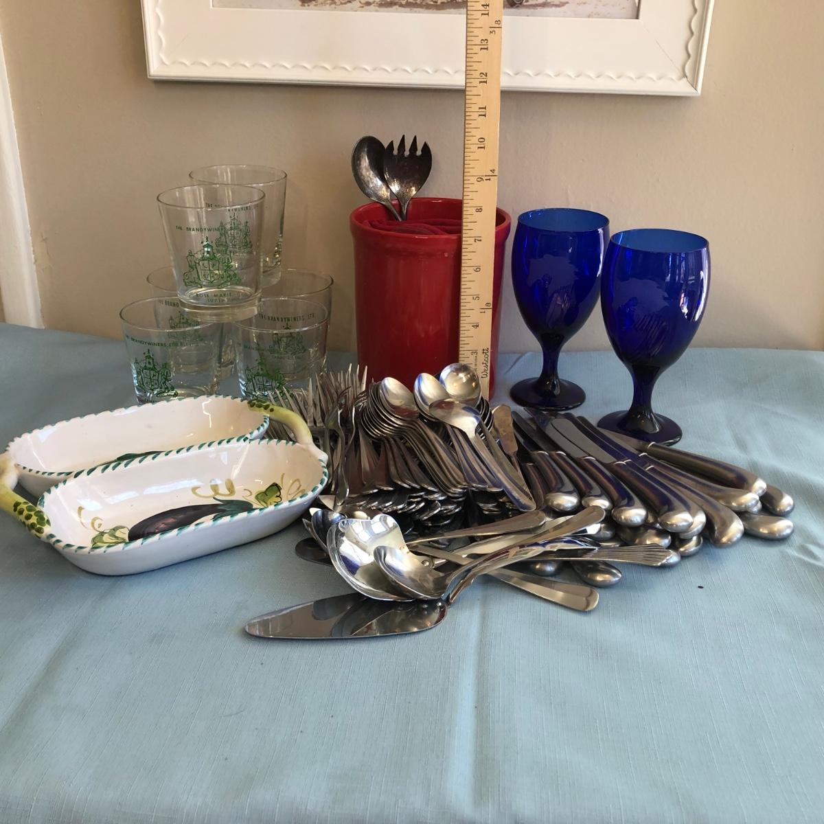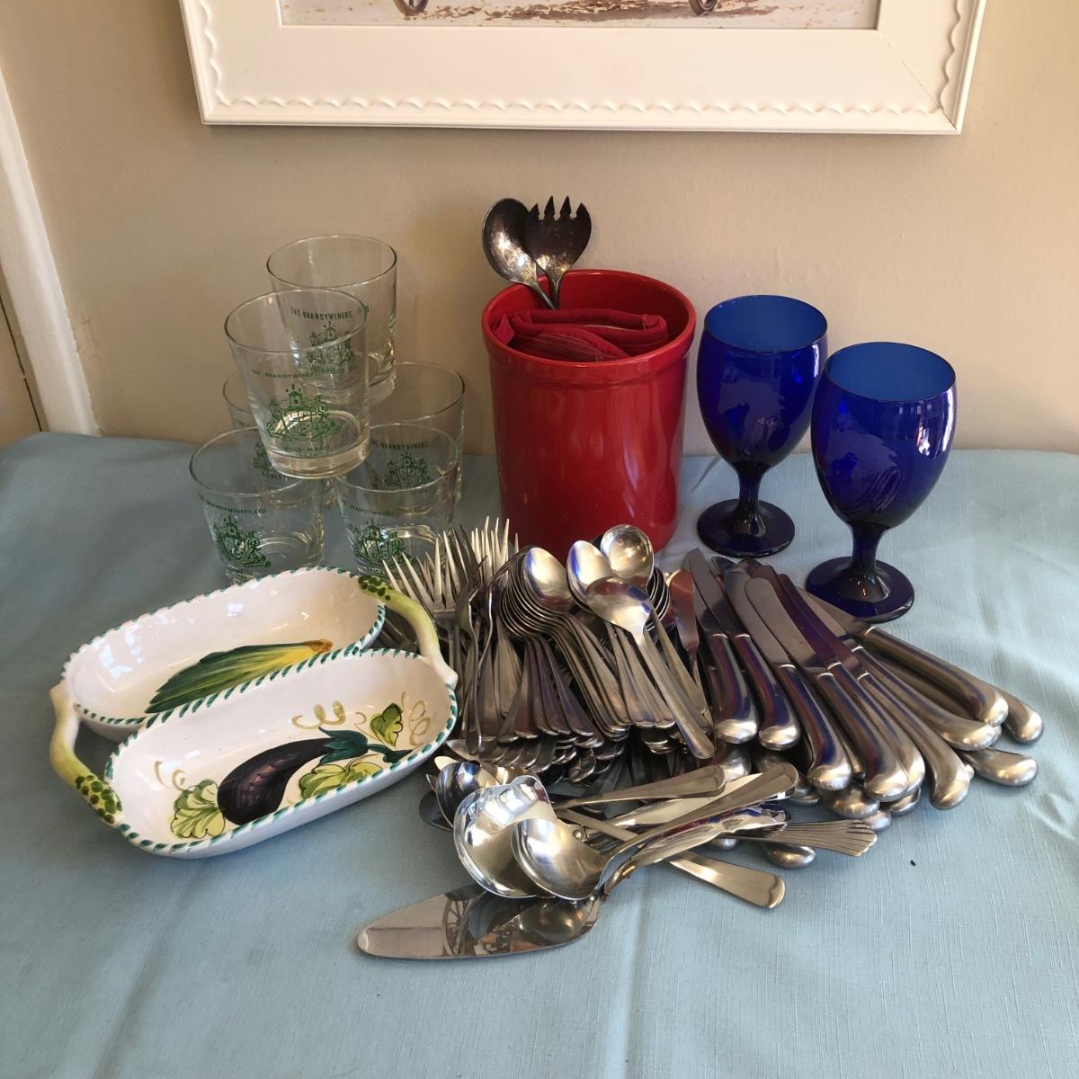 Includes a large collection of stainless steel silverware, six Brandywiners, Ltd. glasses marking Kismet 1966, Carousel 1967, Brigadoon 1974, South Pacific 1969, Rose Marie 1971, and Camelot 1965. Also includes two etched horse head wine glasses in blue glass, a utensil holder and small red oven mitts, a vegetable dish marked "Italy" on the bottom, and two silver plated utensils.