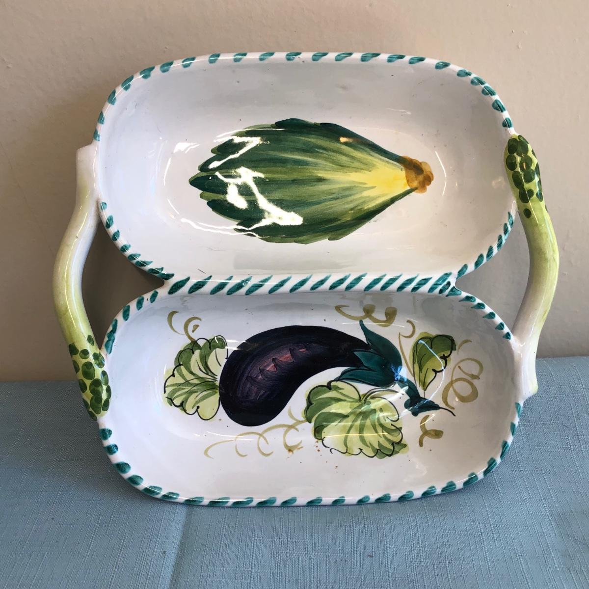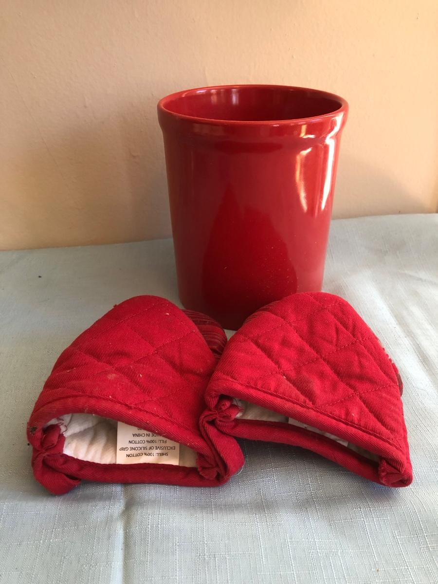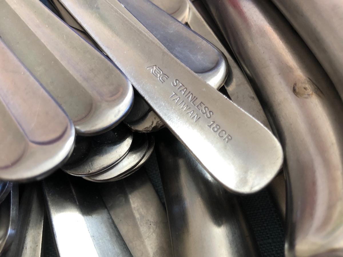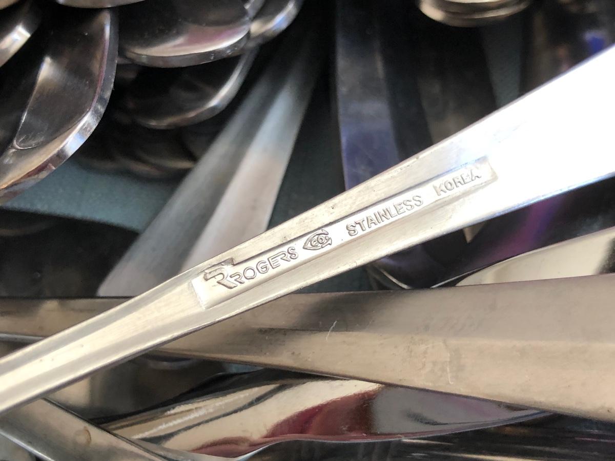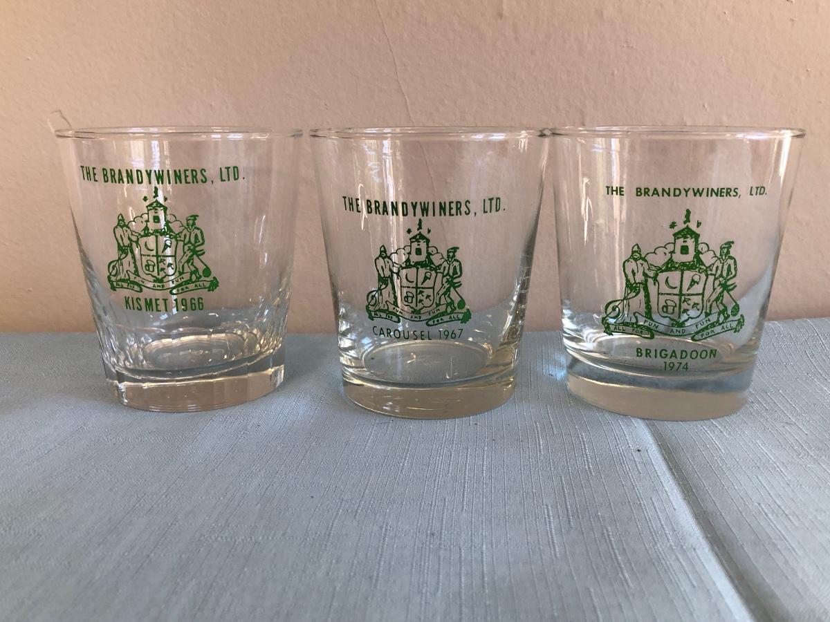 Includes a large collection of stainless steel silverware, six Brandywiners, Ltd. glasses marking Kismet 1966, Carousel 1967, Brigadoon 1974, South Pacific 1969, Rose Marie 1971, and Camelot 1965. Also includes two etched horse head wine glasses in blue glass, a utensil holder and small red oven mitts, a vegetable dish marked "Italy" on the bottom, and two silver plated utensils.