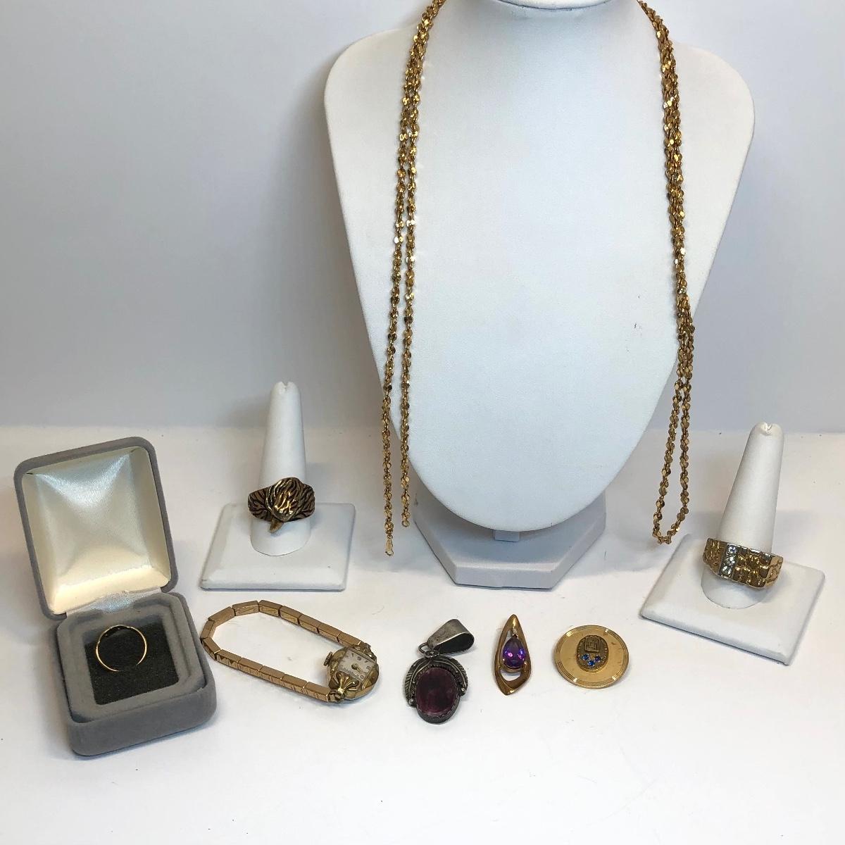 Includes a small Claddagh ring, a stretch watch, two rings and two pendants along with a pin and a long gold tone necklace without a clasp. Please see all pictures as they are the best representation of the items. The pictures show condition, measurements if taken, and what is included in the lot. Due to the large amount that we photograph and the time frame, we are not always able to take measurements. All items unless noted, are pre-owned and have been used. If you purchased furniture, you must bring help. We do not allow one person to carry large furniture out on their own. Bring help, tools and a truck for the safety of our client’s homes, and your personal safety. Any damages that result to the property including walls, and floors due to moving of the furniture will be charged to the buyer. Company policy. Thank you.