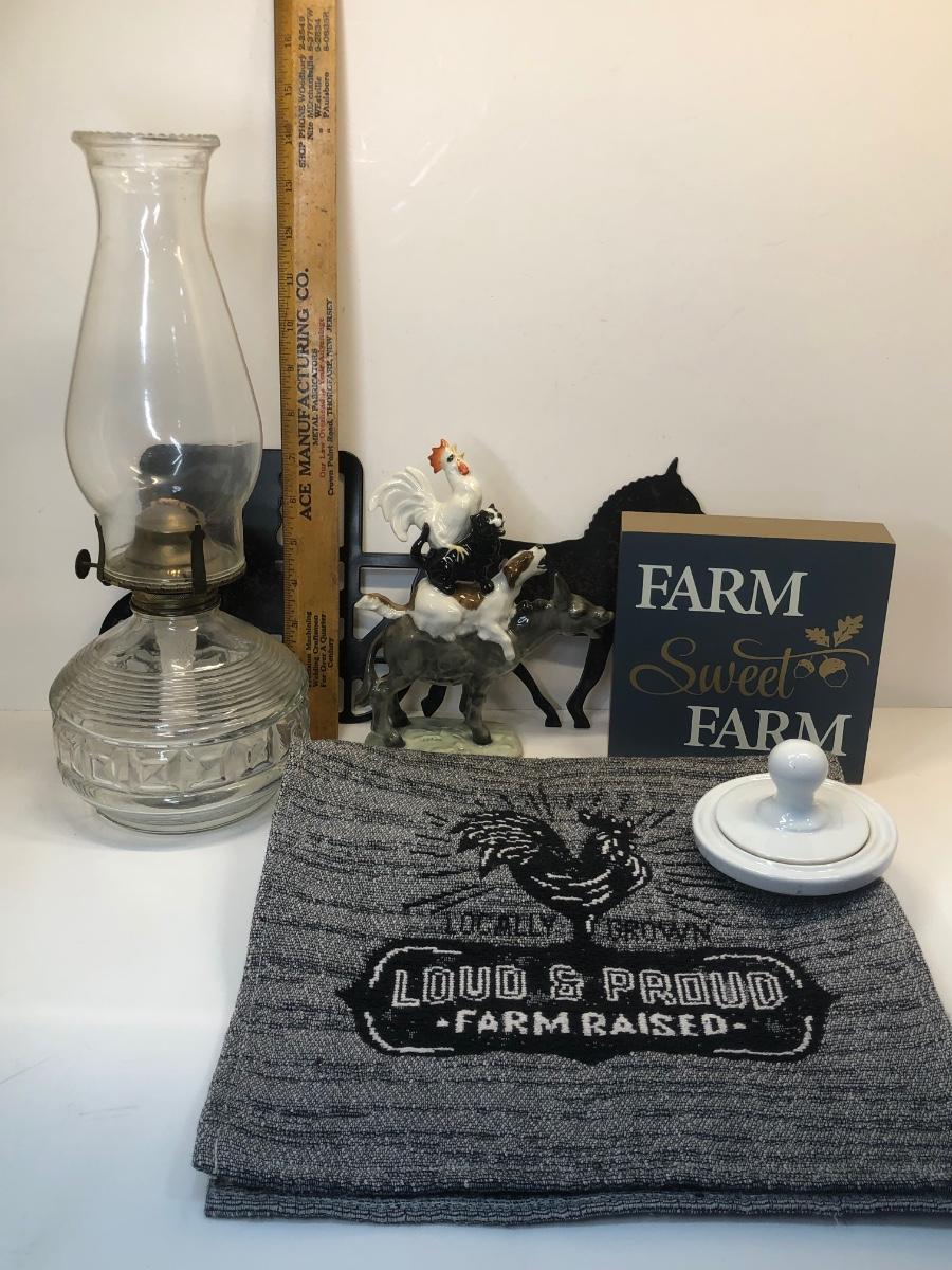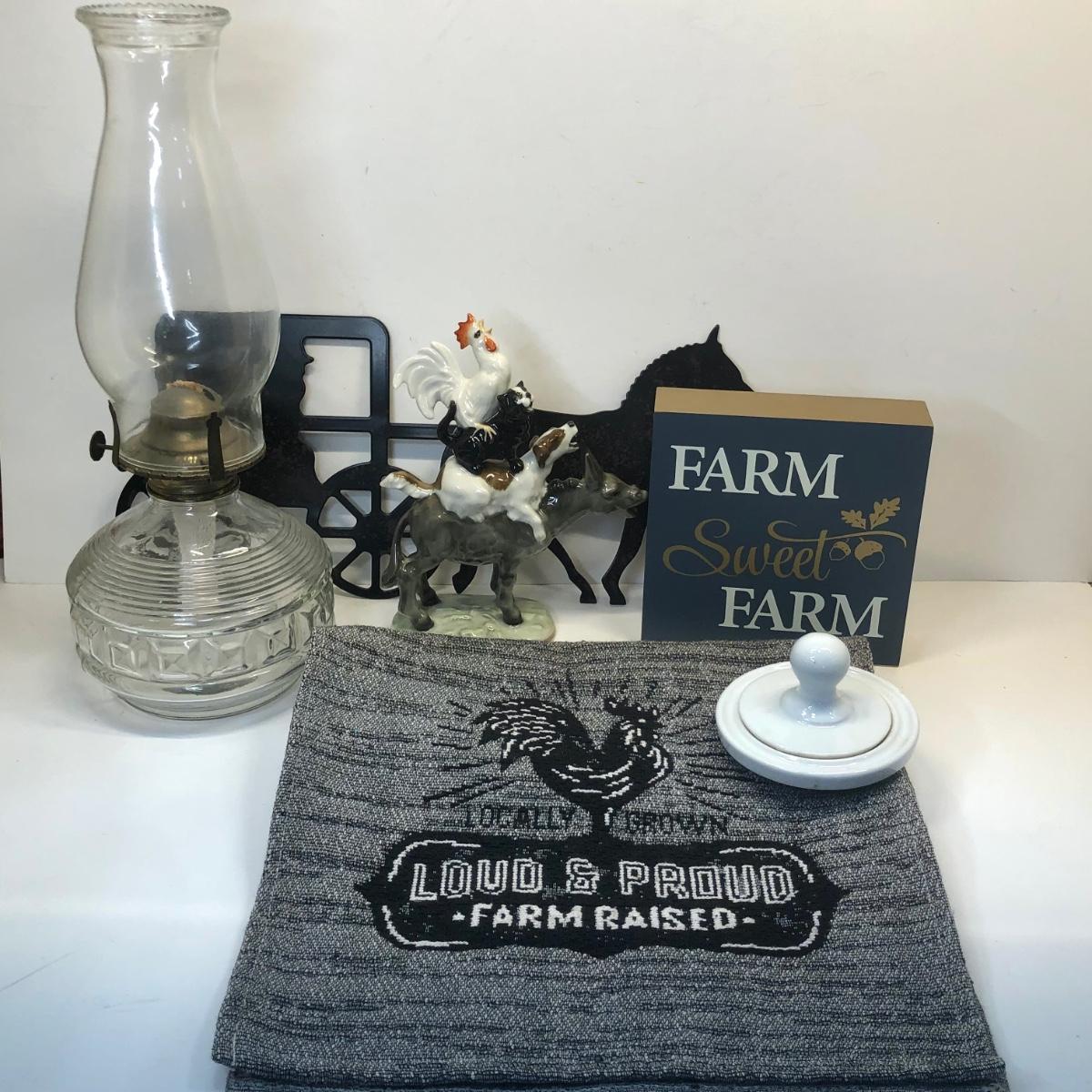 Includes a hurricaine style oil lamp, a horse and buggy cutout wall hanging, a small sign reading "Farm Sweet Farm," a "Loud & Proud Farm Raised" kitchen towel, a PIC China Please see all pictures as they are the best representation of the items. The pictures show condition, measurements if taken, and what is included in the lot. Due to the large amount that we photograph and the time frame, we are not always able to take measurements. All items unless noted, are pre-owned and have been used. If you purchased furniture, you must bring help. We do not allow one person to carry large furniture out on their own. Bring help, tools and a truck for the safety of our client’s homes, and your personal safety. Any damages that result to the property including walls, and floors due to moving of the furniture will be charged to the buyer. Company policy. Thank you.