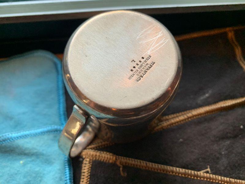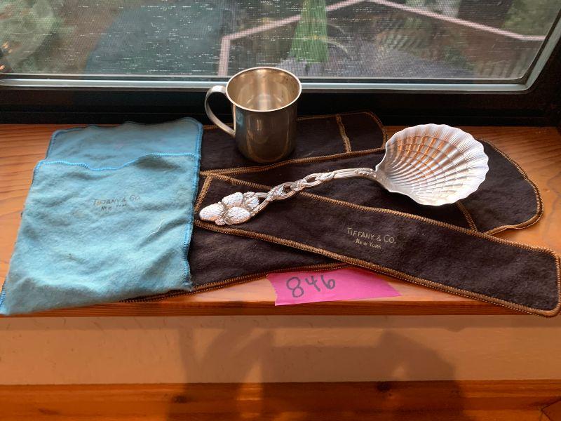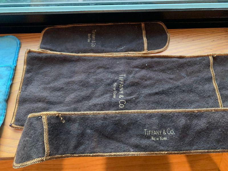 Tiffany cup and spoon and Tiffany silverware pouches (130 grams and 90 grams)