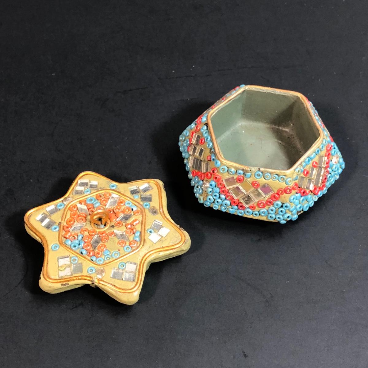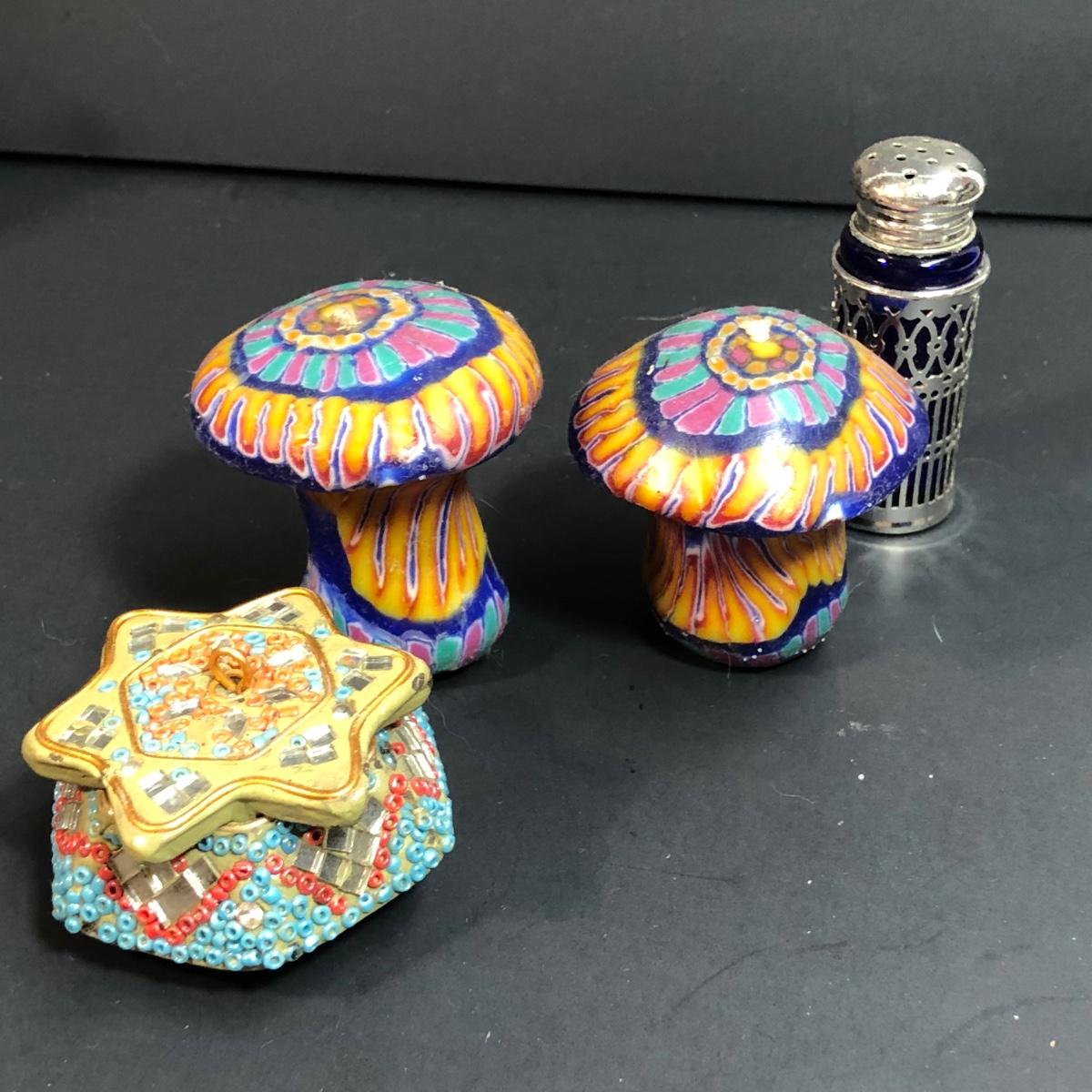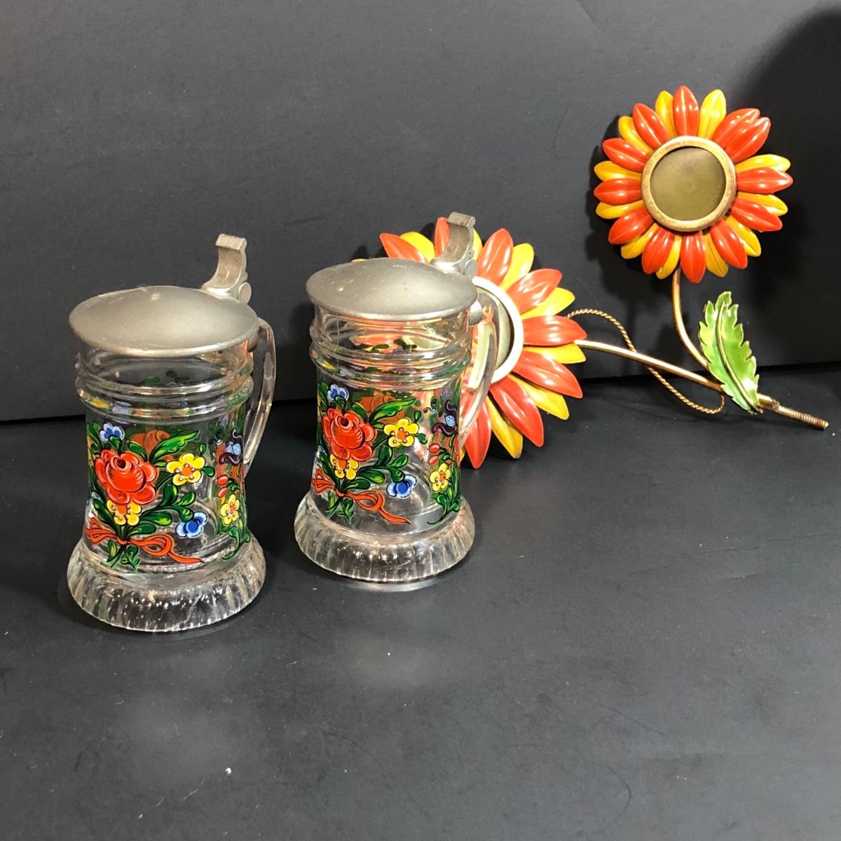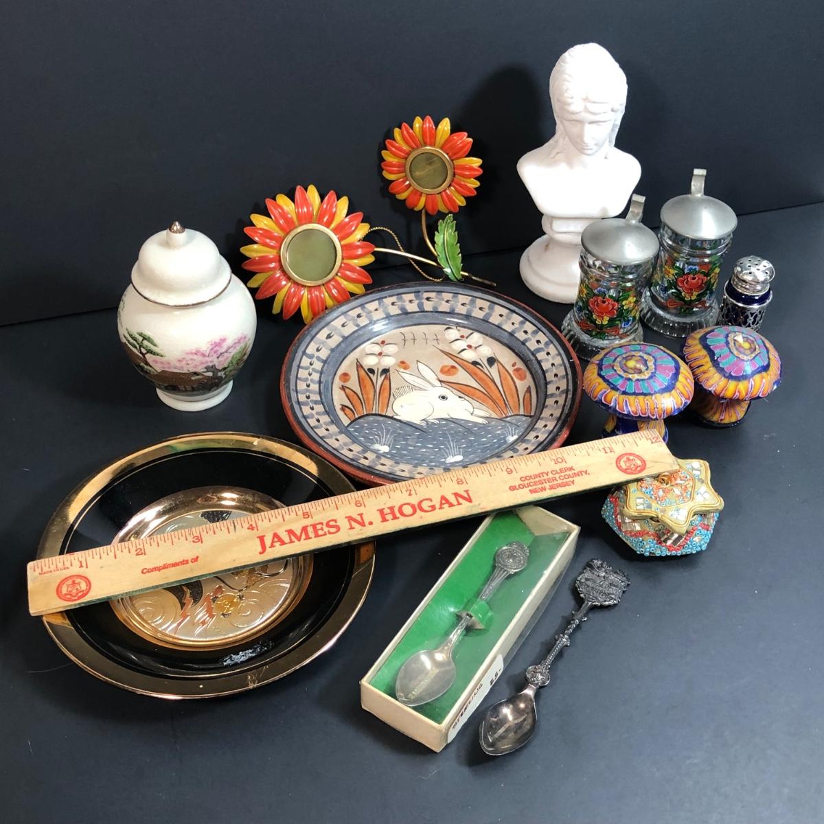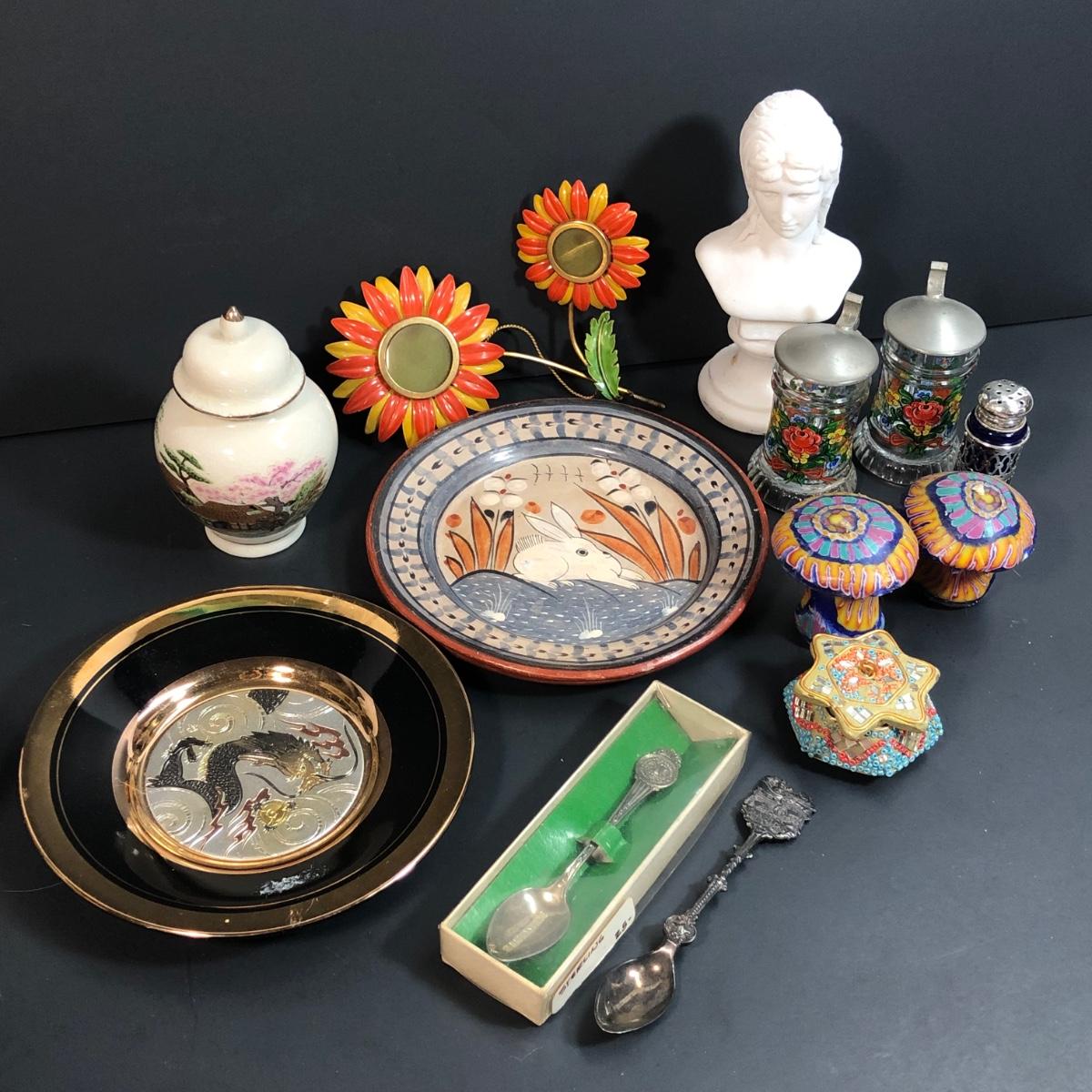 Also includes a small bust, another plate, another souvenir spoon, a beaded trinket dish, metal flower wall hanging, mushroom candles, & small glass steins.