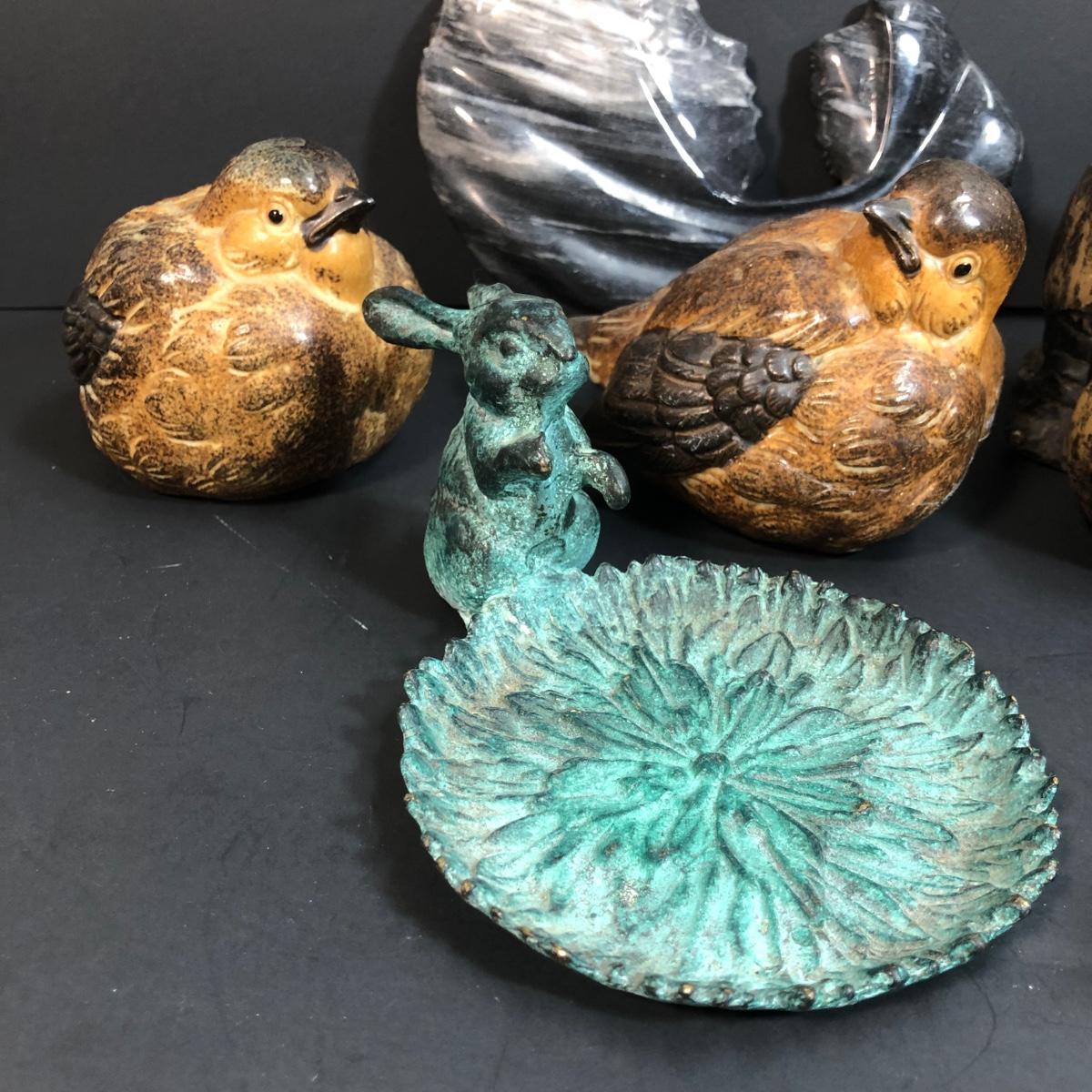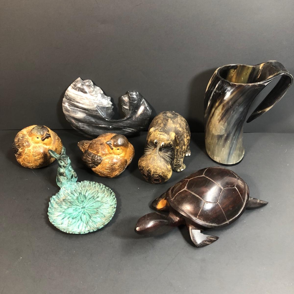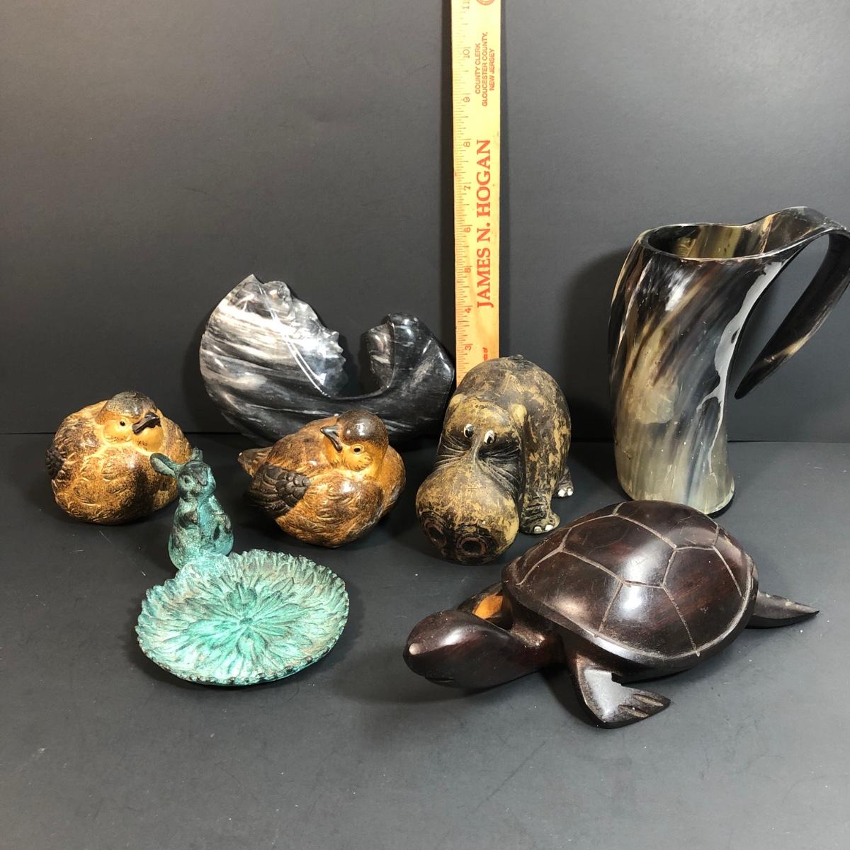 LOT 130M: Home Decor Collection: Copper Rabbit Dish, Pottery Birds, Wooden Turtle, Hippopotamus Candle & More