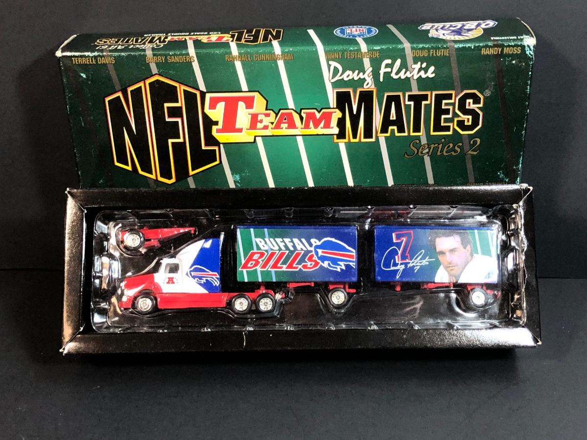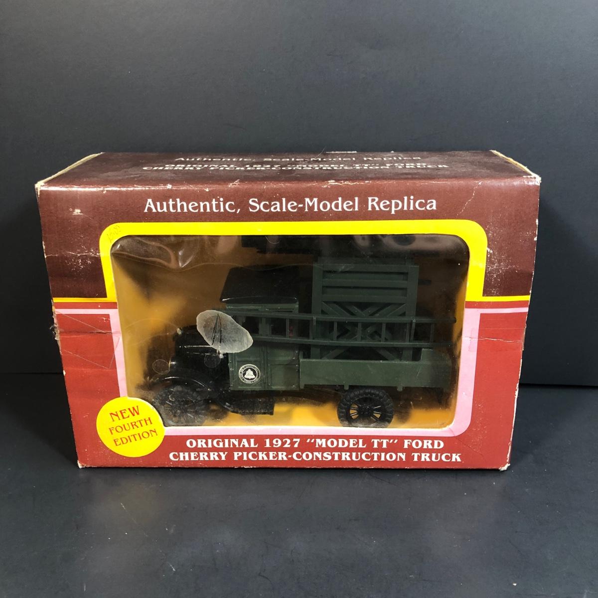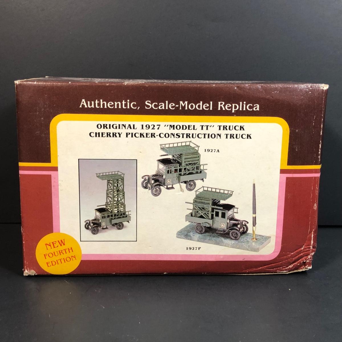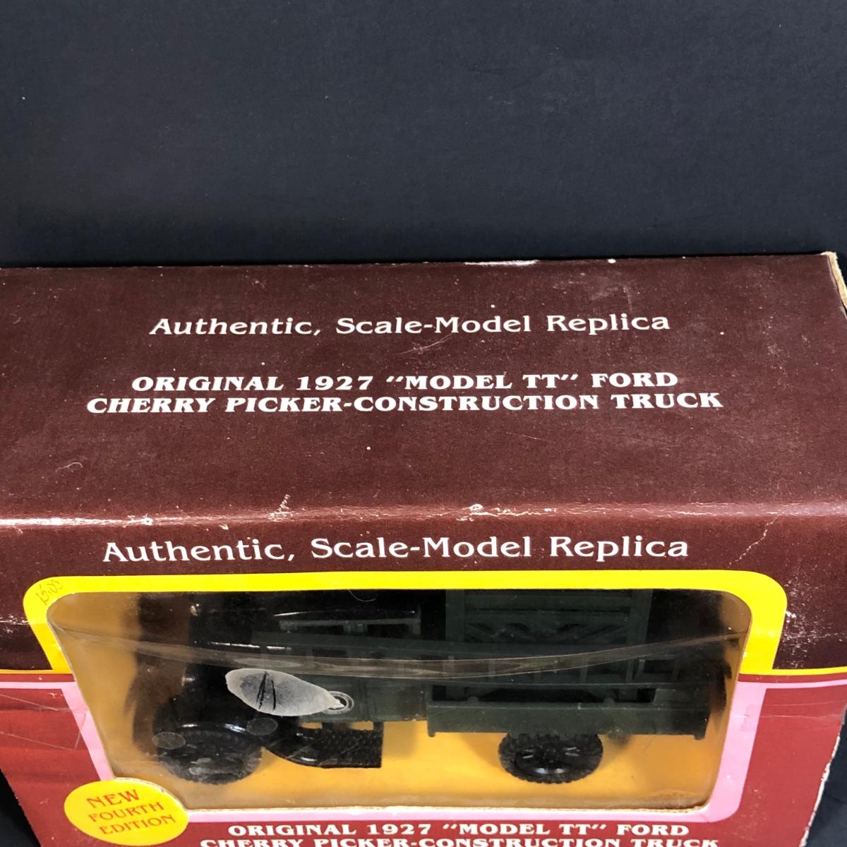 LOT 131M: 4th Edition Original 1927 "Model TT" Ford Cherry Picker-Construction Truck Scale-Model Replica, Wooden Matchbox Car, MTA & CTA Bus Models, NFL Teammates All-Metal Double Trailer