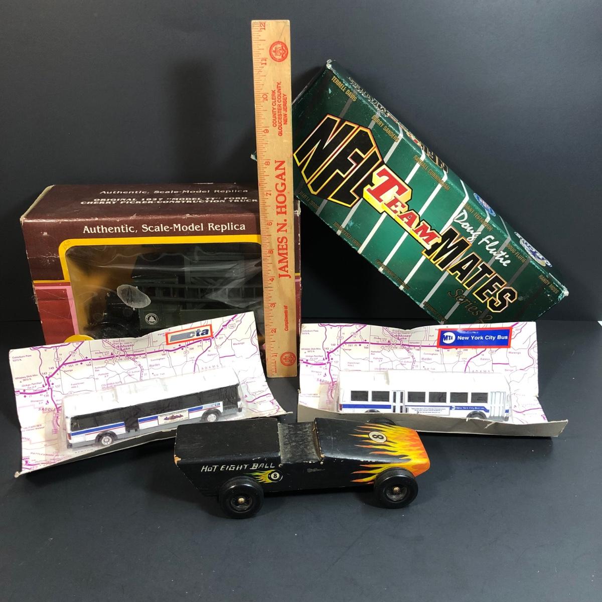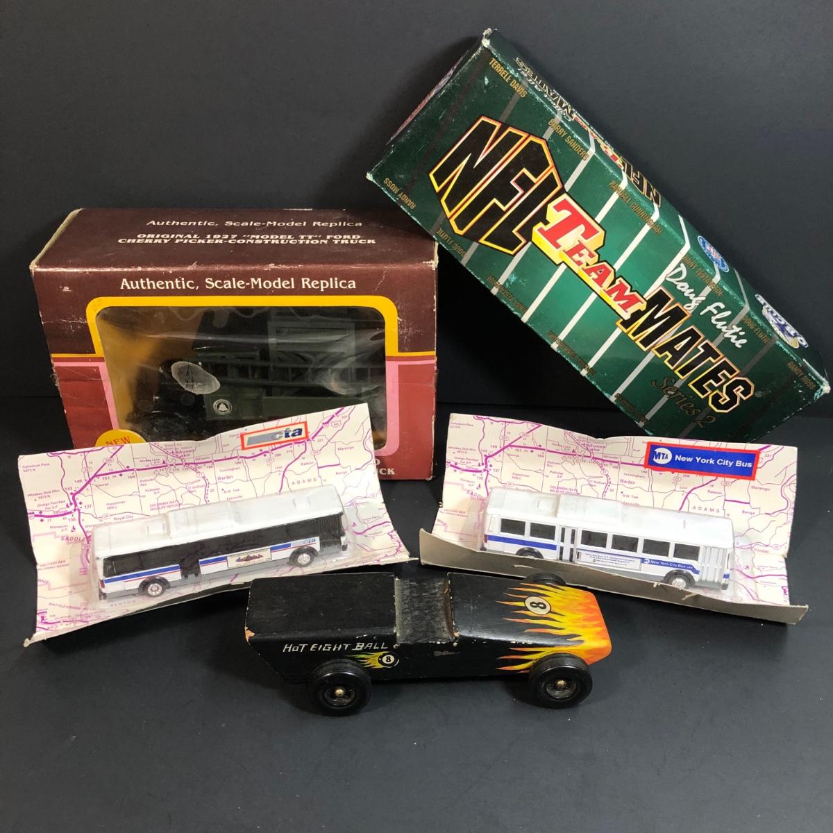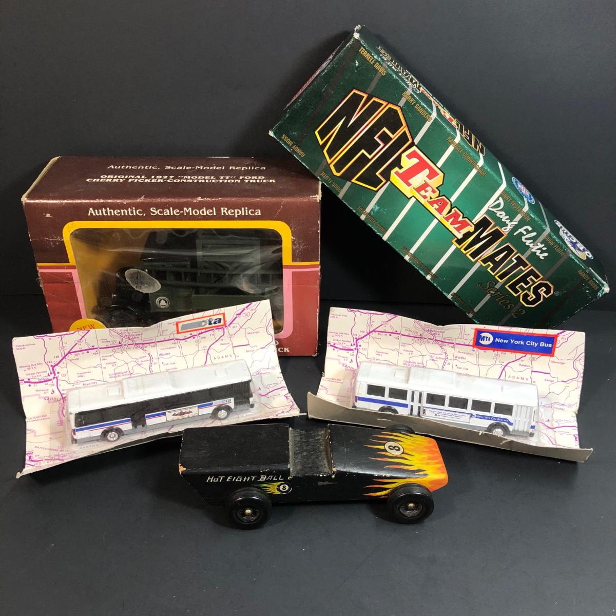Includes two bus models, a wooden matchbox car, an NFL 1:80 scale trailer model, and a boxed model of the Ford.