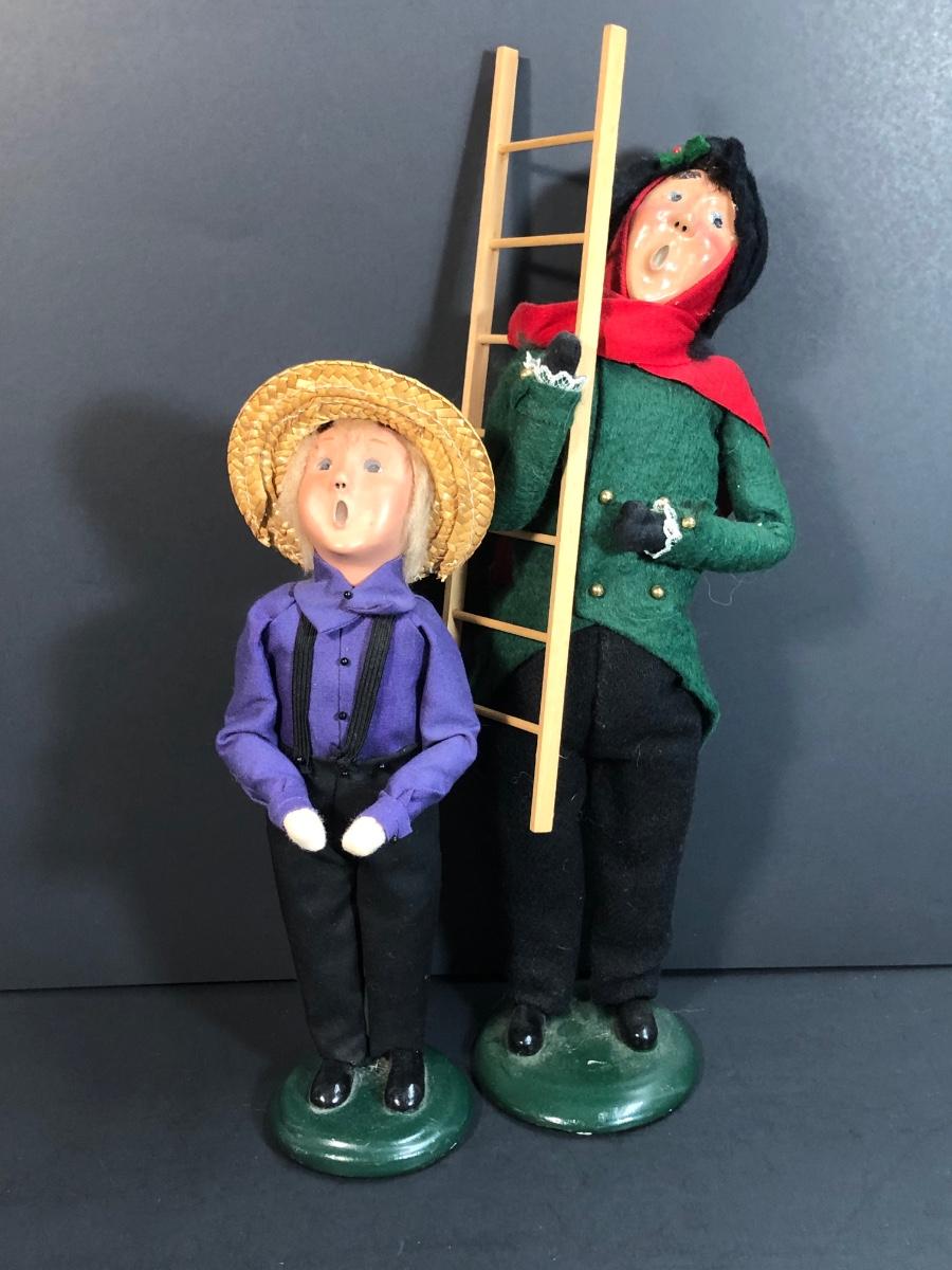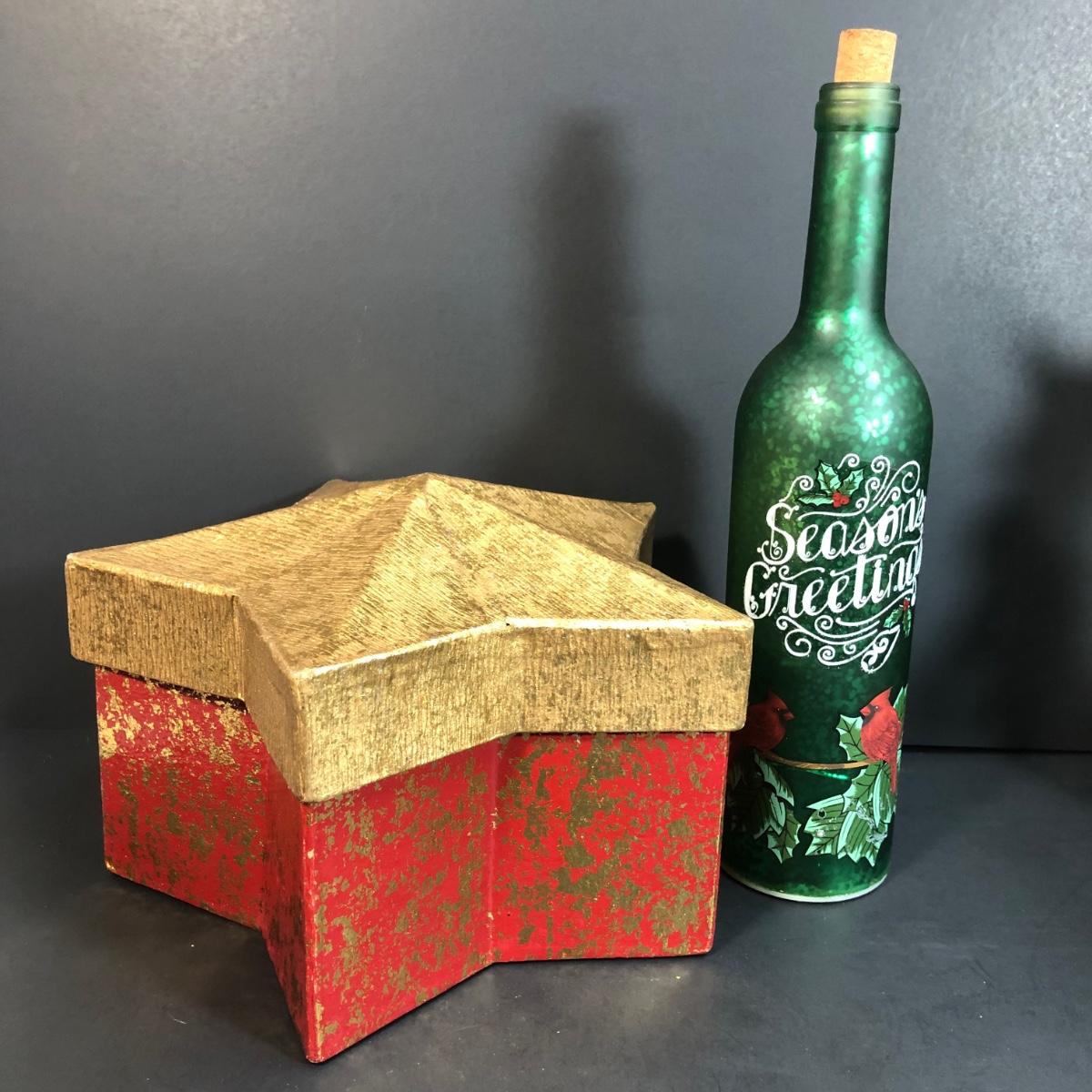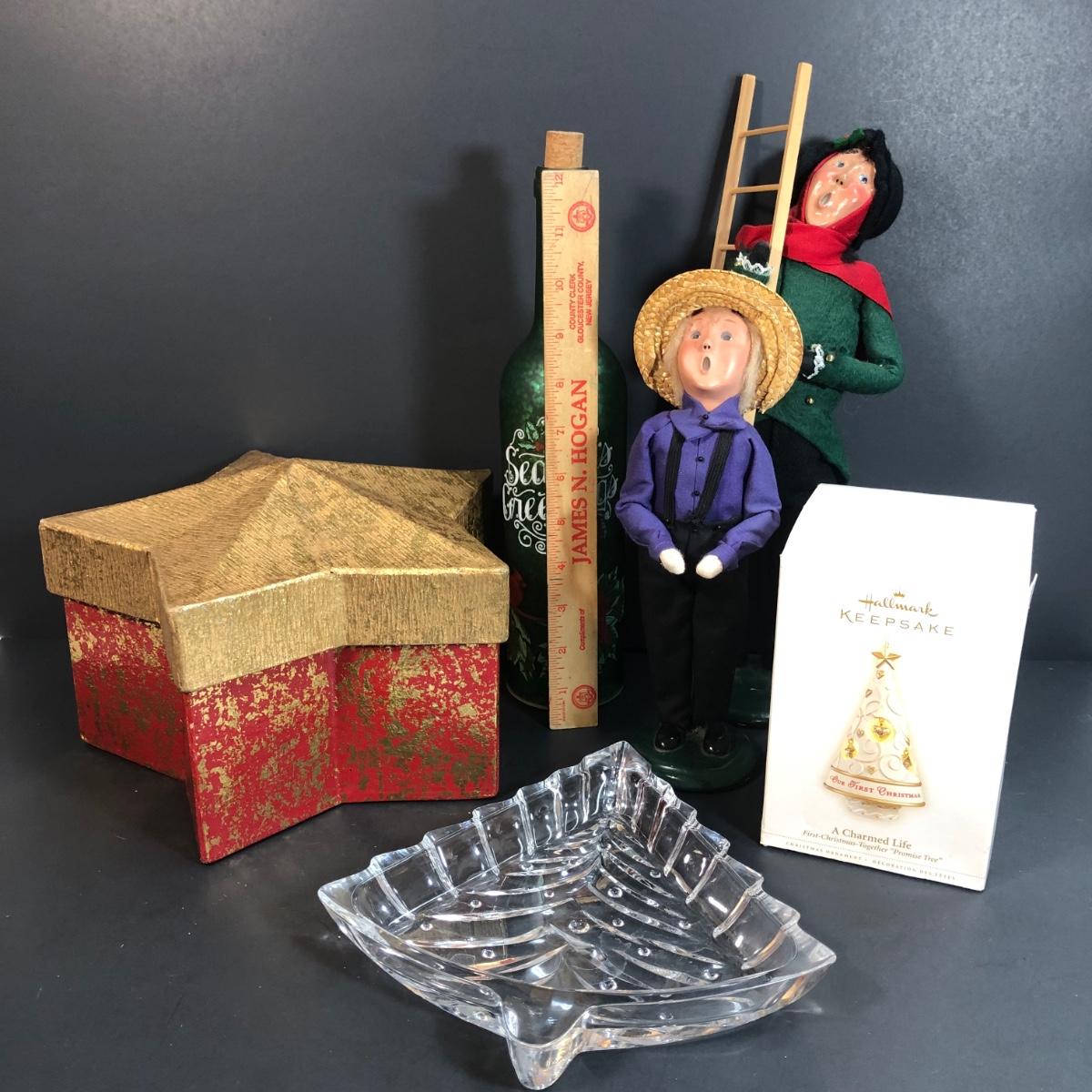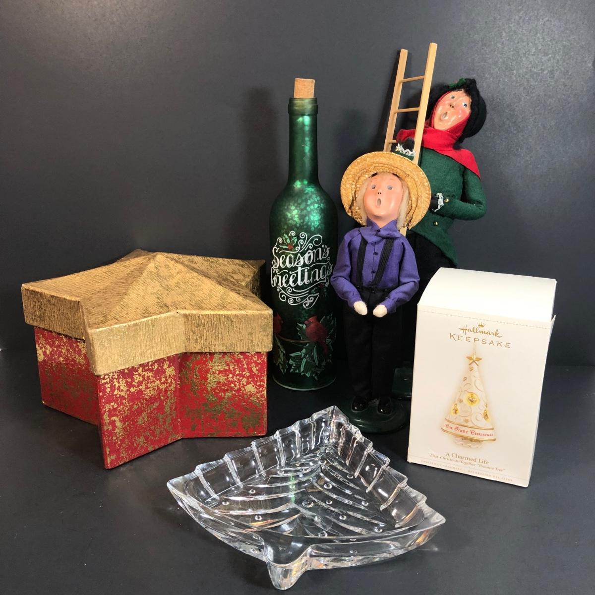 Includes two Buyer's Choice Carolers, a Hallmark Keepsake ornament in the box, a glass Christmas tree dish, a star box, and a faux wine bottle with lights inside.