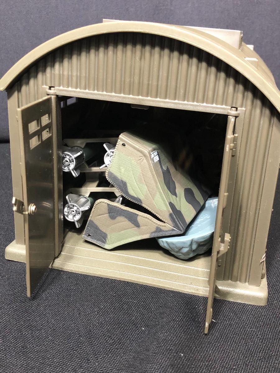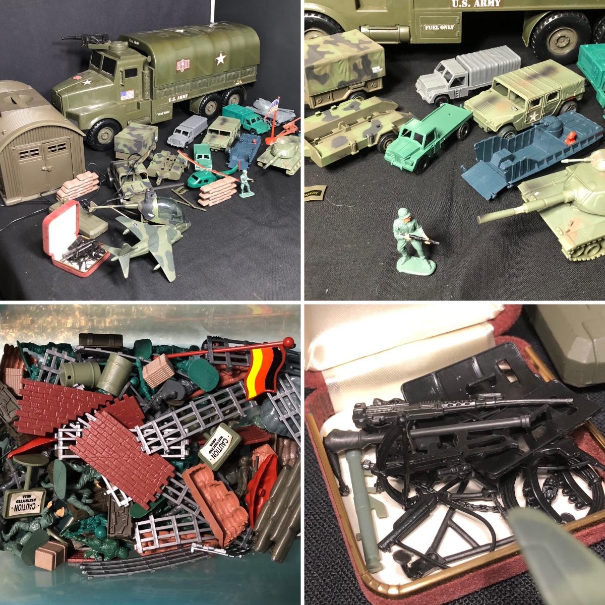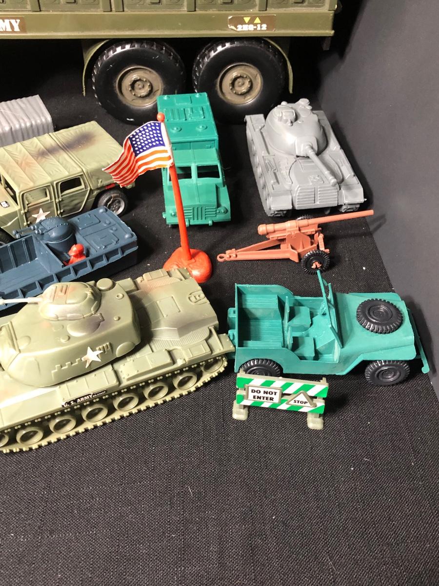 Includes GI Joe truck, a hangar with surprises in it, vehicles, green Army men, small weapons, barricades and more.