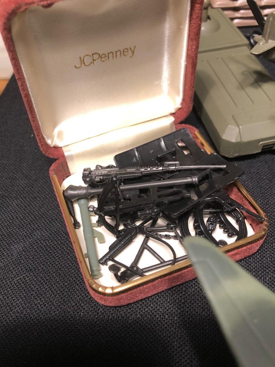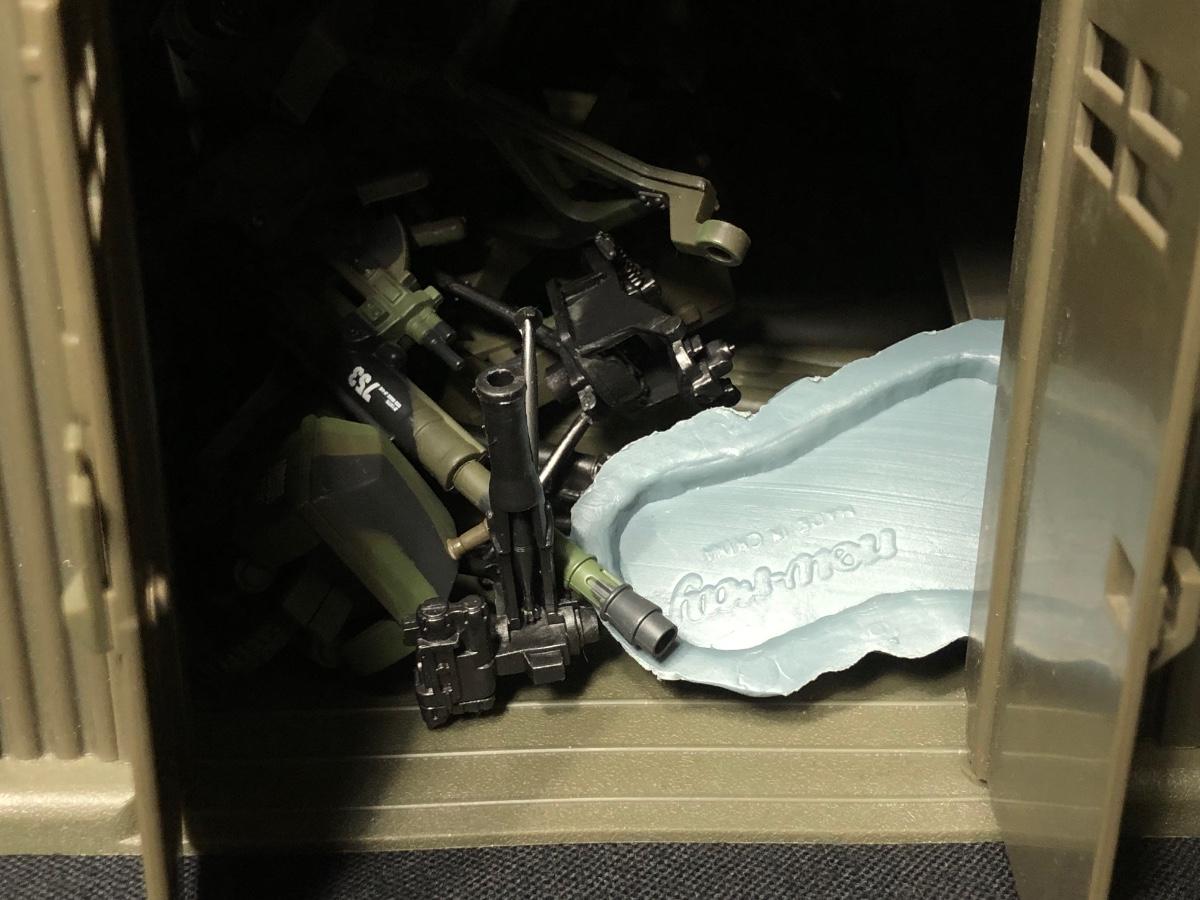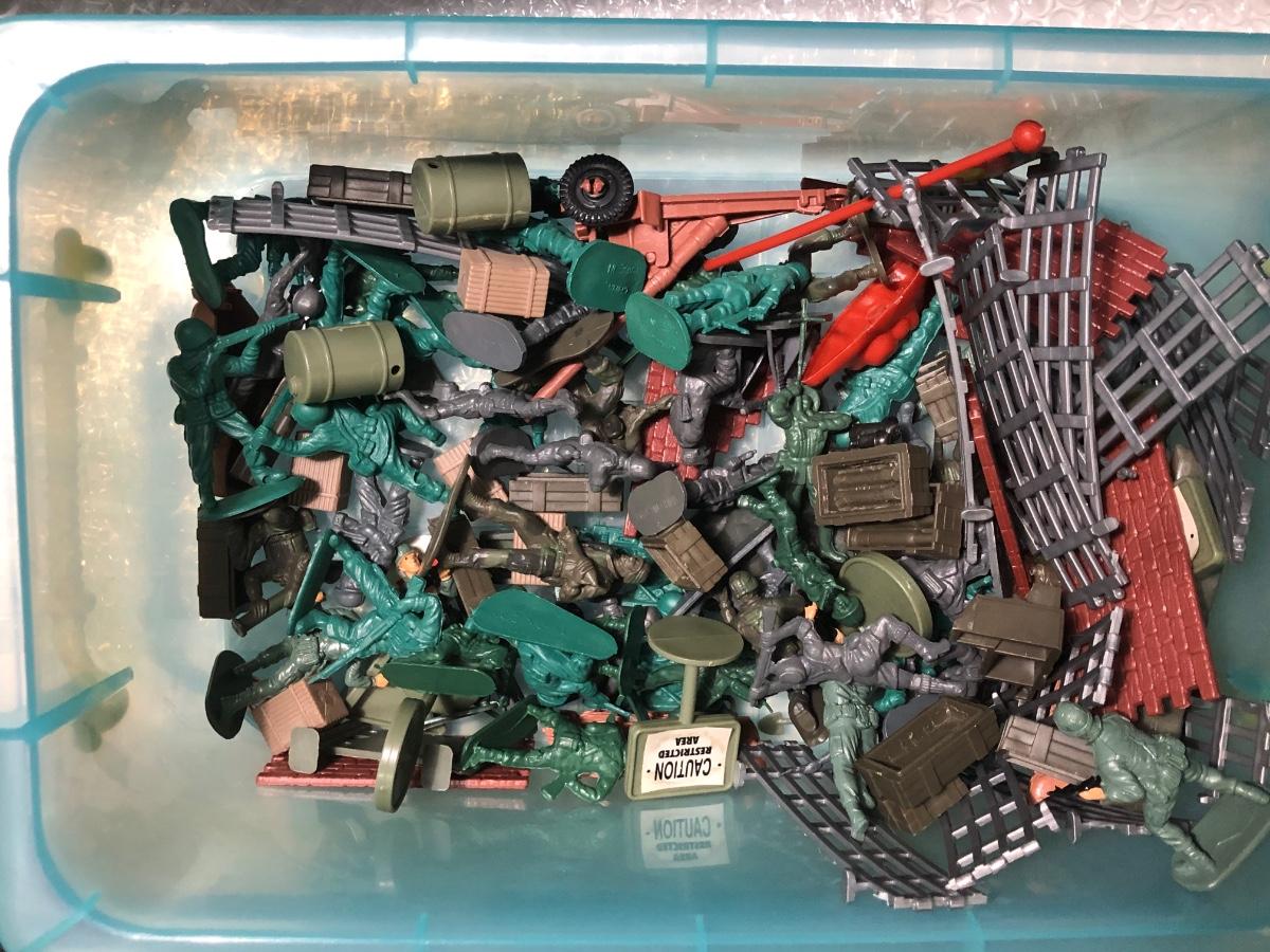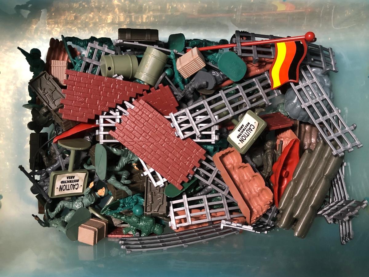 Includes GI Joe truck, a hangar with surprises in it, vehicles, green Army men, small weapons, barricades and more.