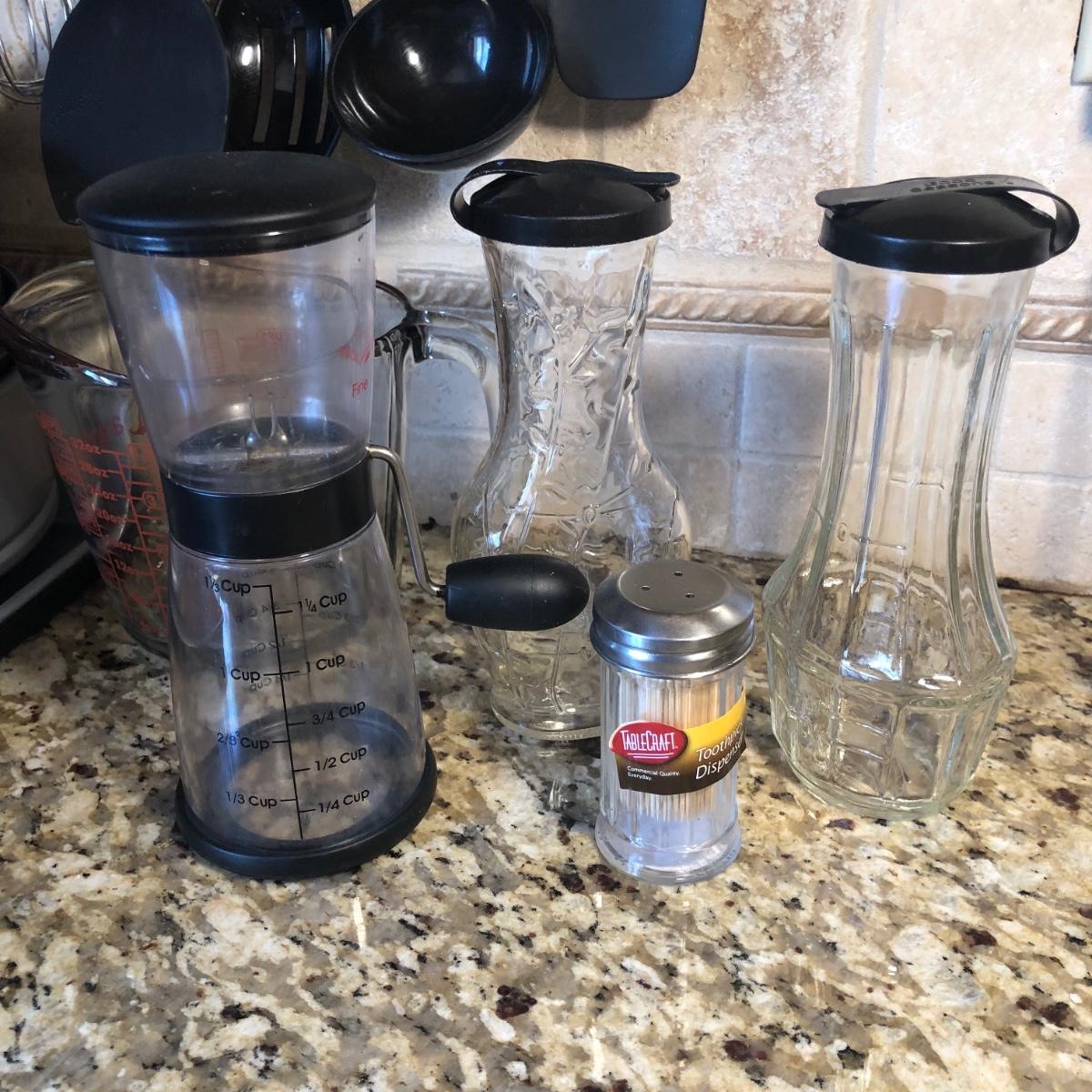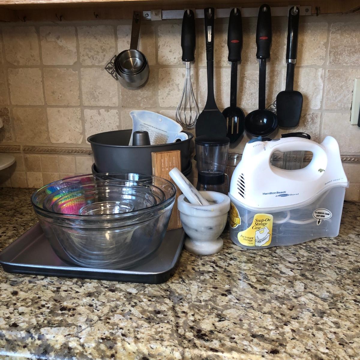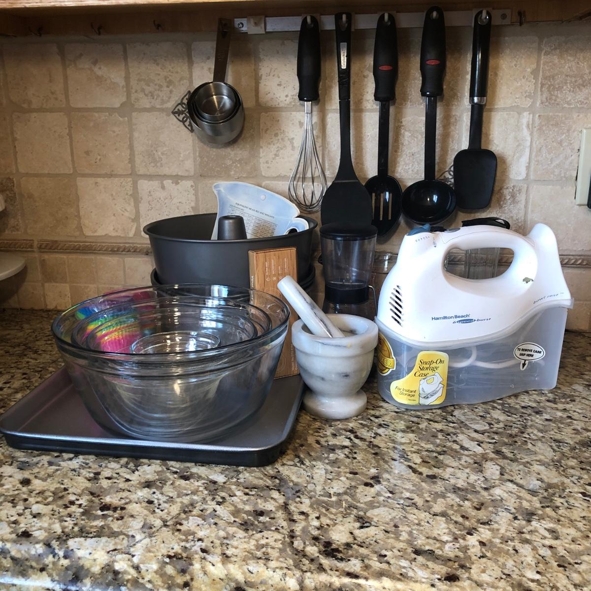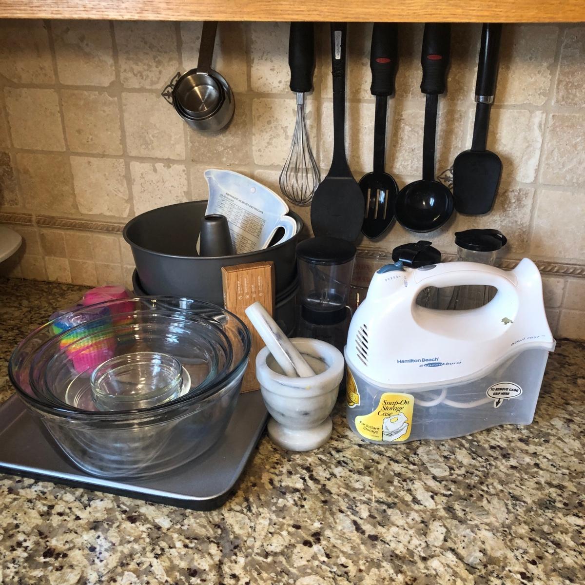 Includes a hand mixer with attachable compartment, marble mortar and pestle, glass mixing bowls, a Farberware Cake pan, a bundt cake pan, measuring guides, BBQ thermometer, measuring cups, used kitchen utensils, and more!.
