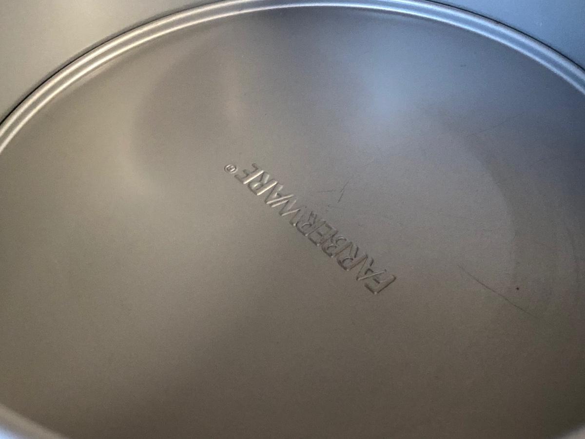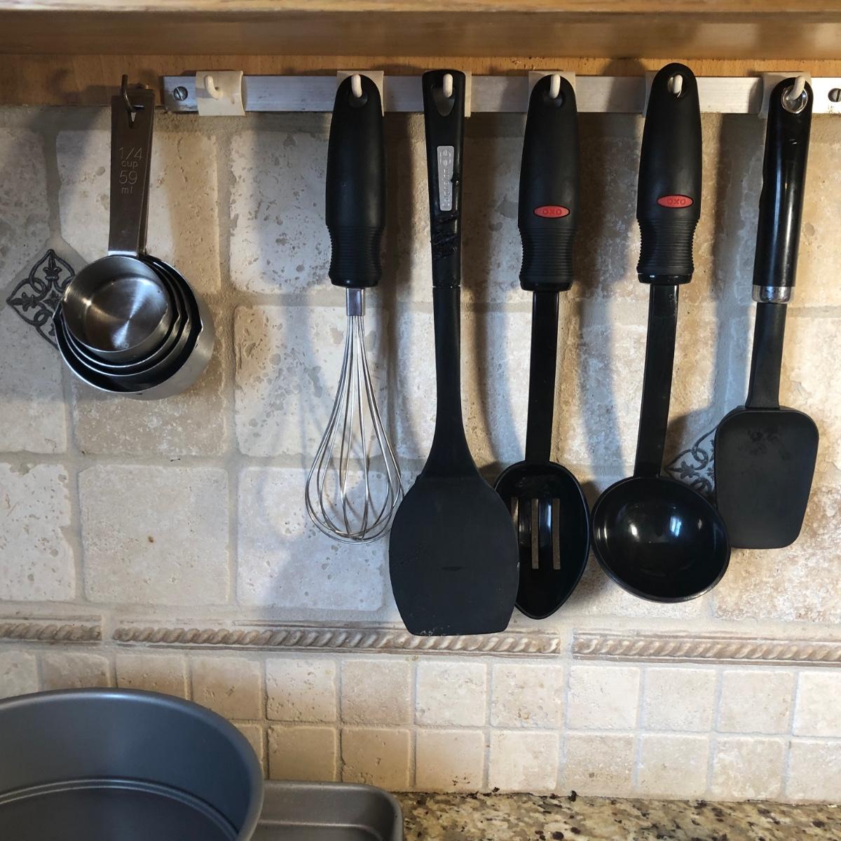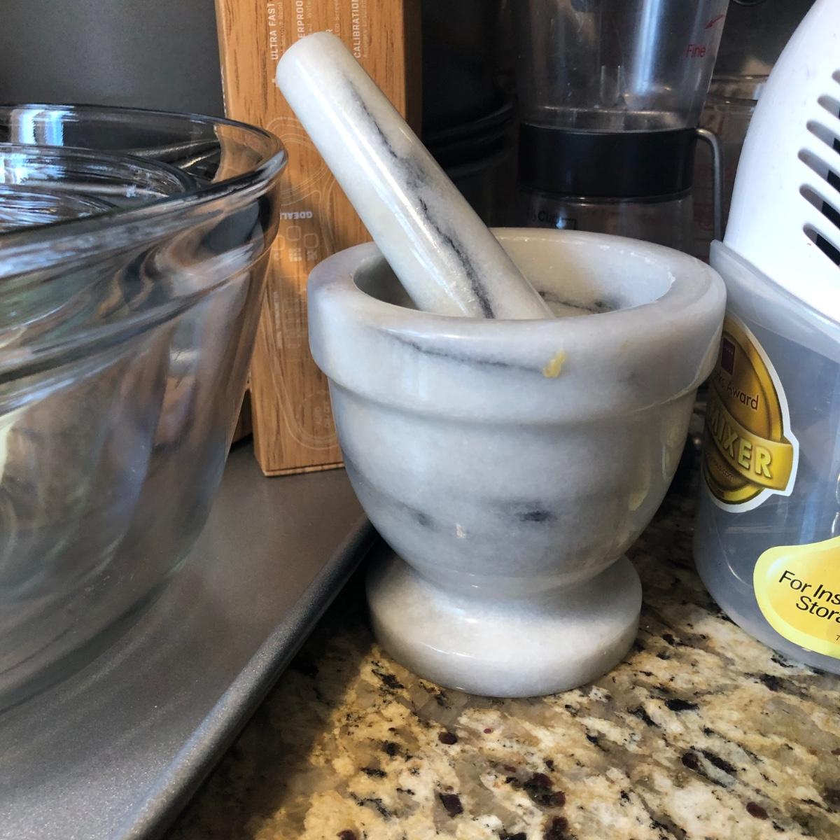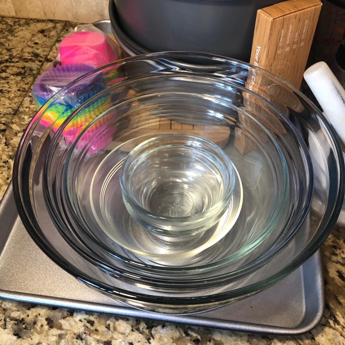 Includes a hand mixer with attachable compartment, marble mortar and pestle, glass mixing bowls, a Farberware Cake pan, a bundt cake pan, measuring guides, BBQ thermometer, measuring cups, used kitchen utensils, and more!.