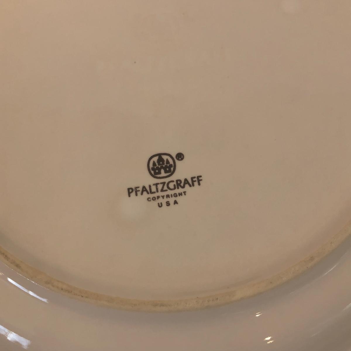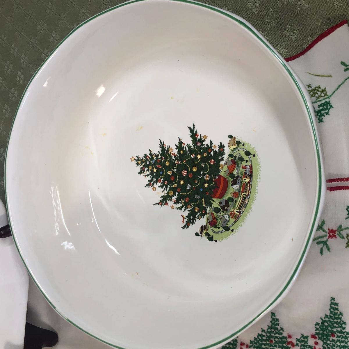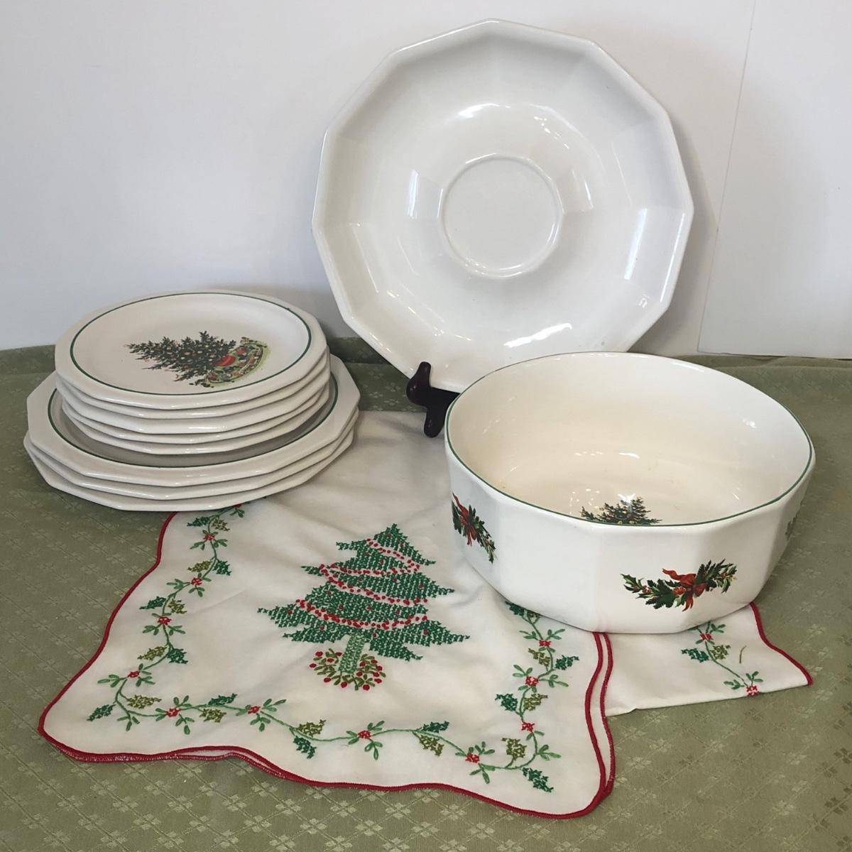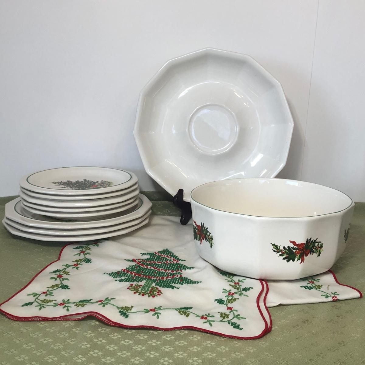 Includes three Pflatzgraff Christmas dinner plates, five dessert plates, a serving bowl, a plain white Pflatzgraff chip and dip server and a Christmas tree table runner.
