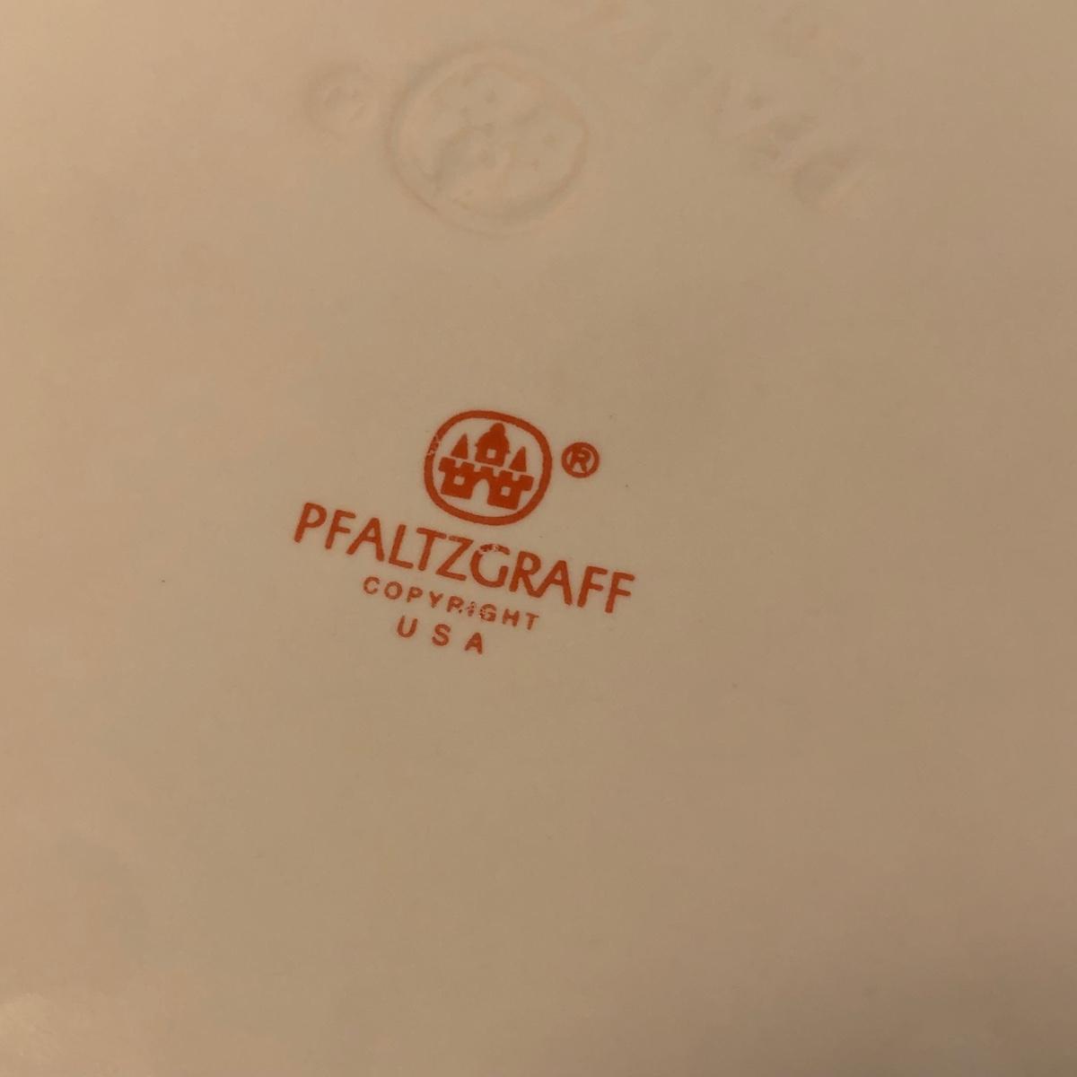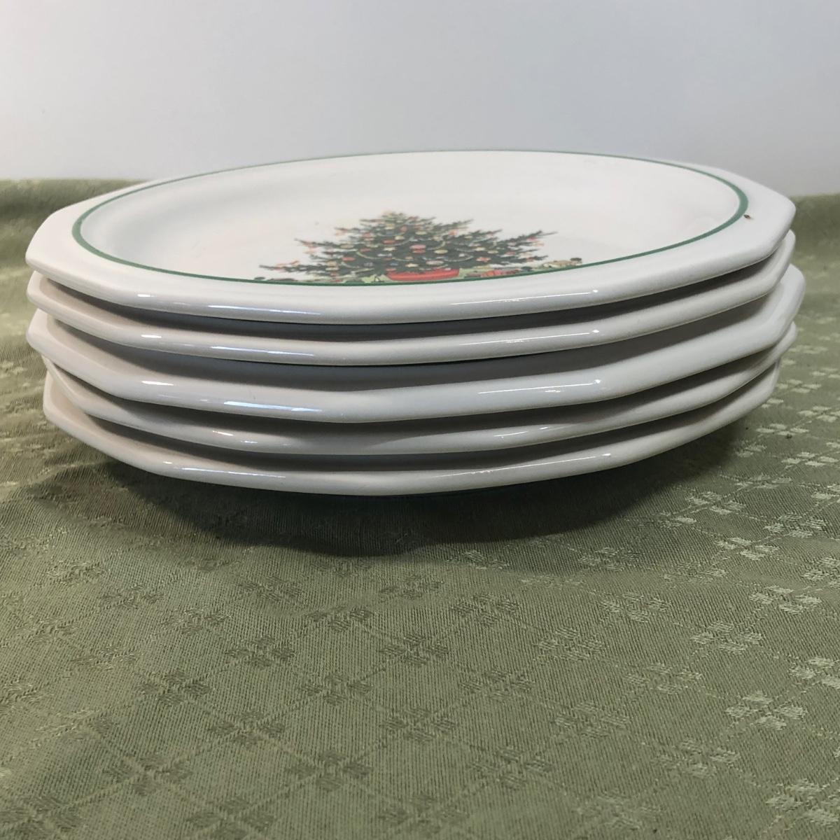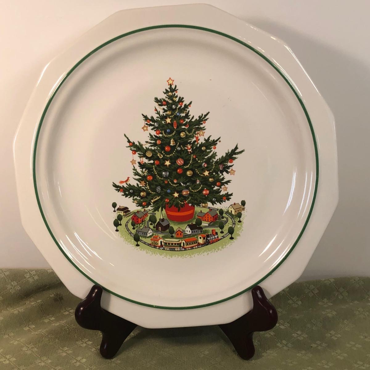 Includes three Pflatzgraff Christmas dinner plates, five dessert plates, a serving bowl, a plain white Pflatzgraff chip and dip server and a Christmas tree table runner.