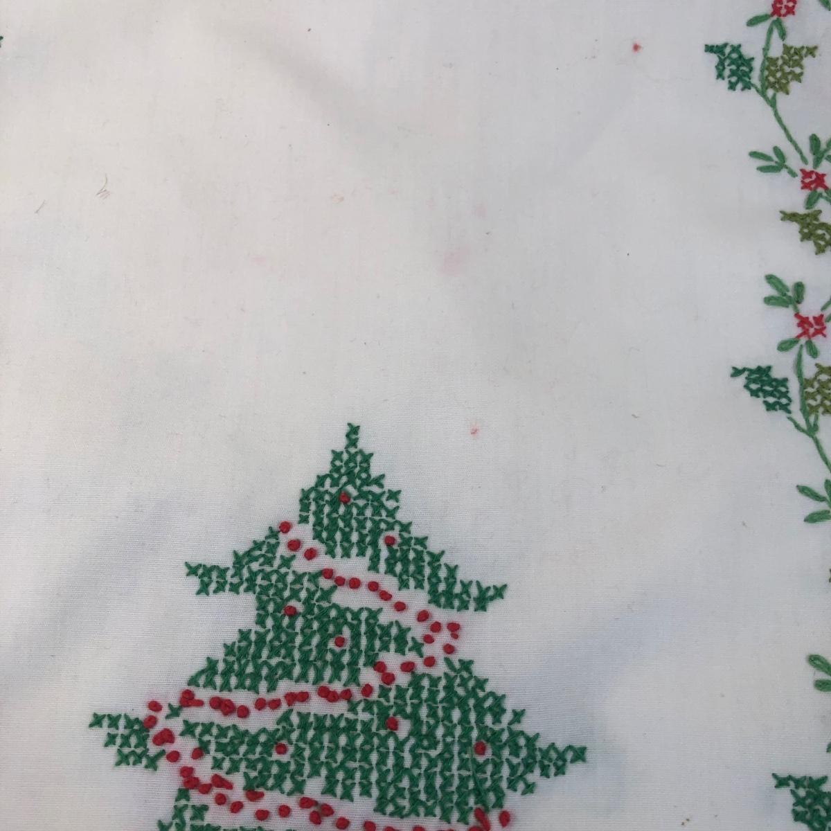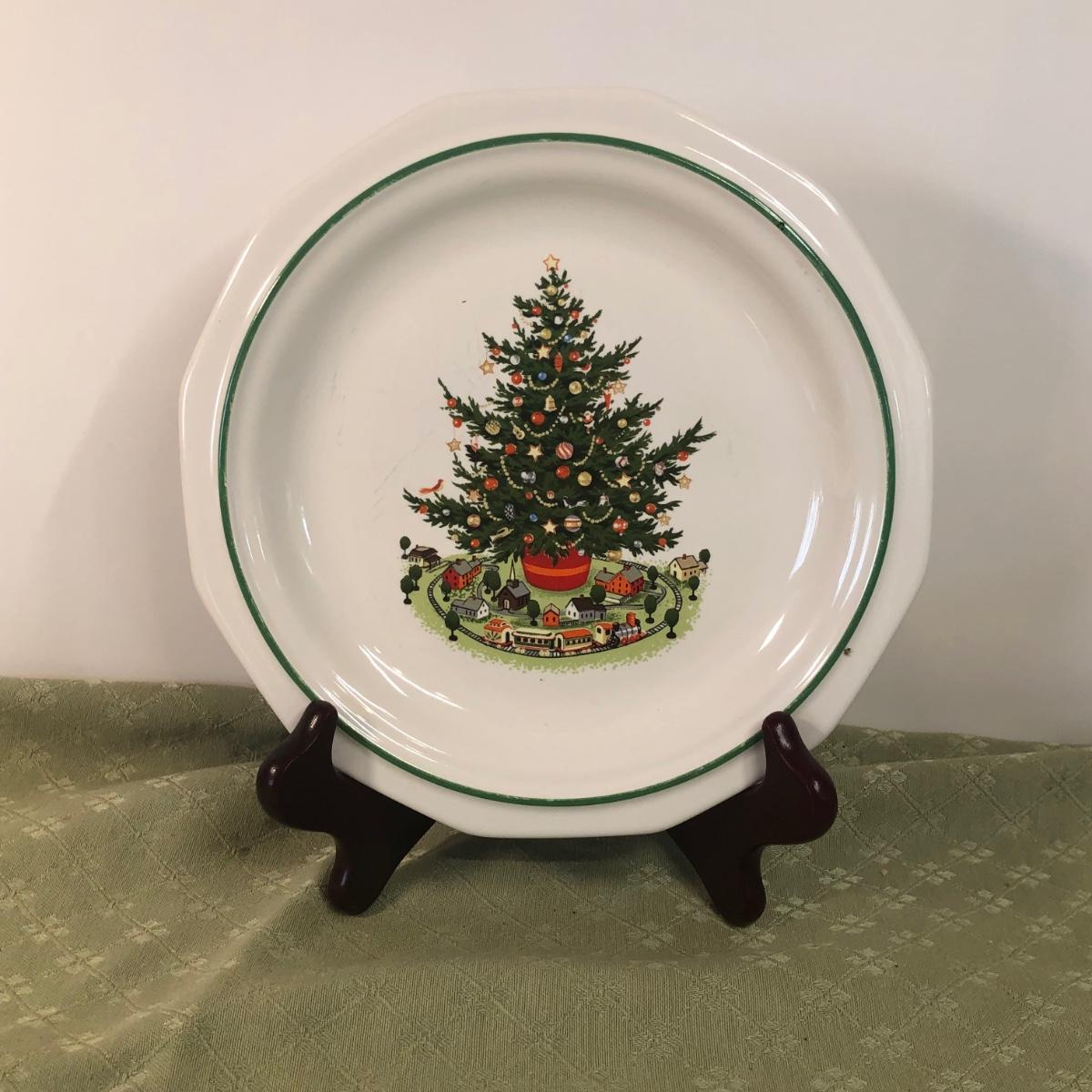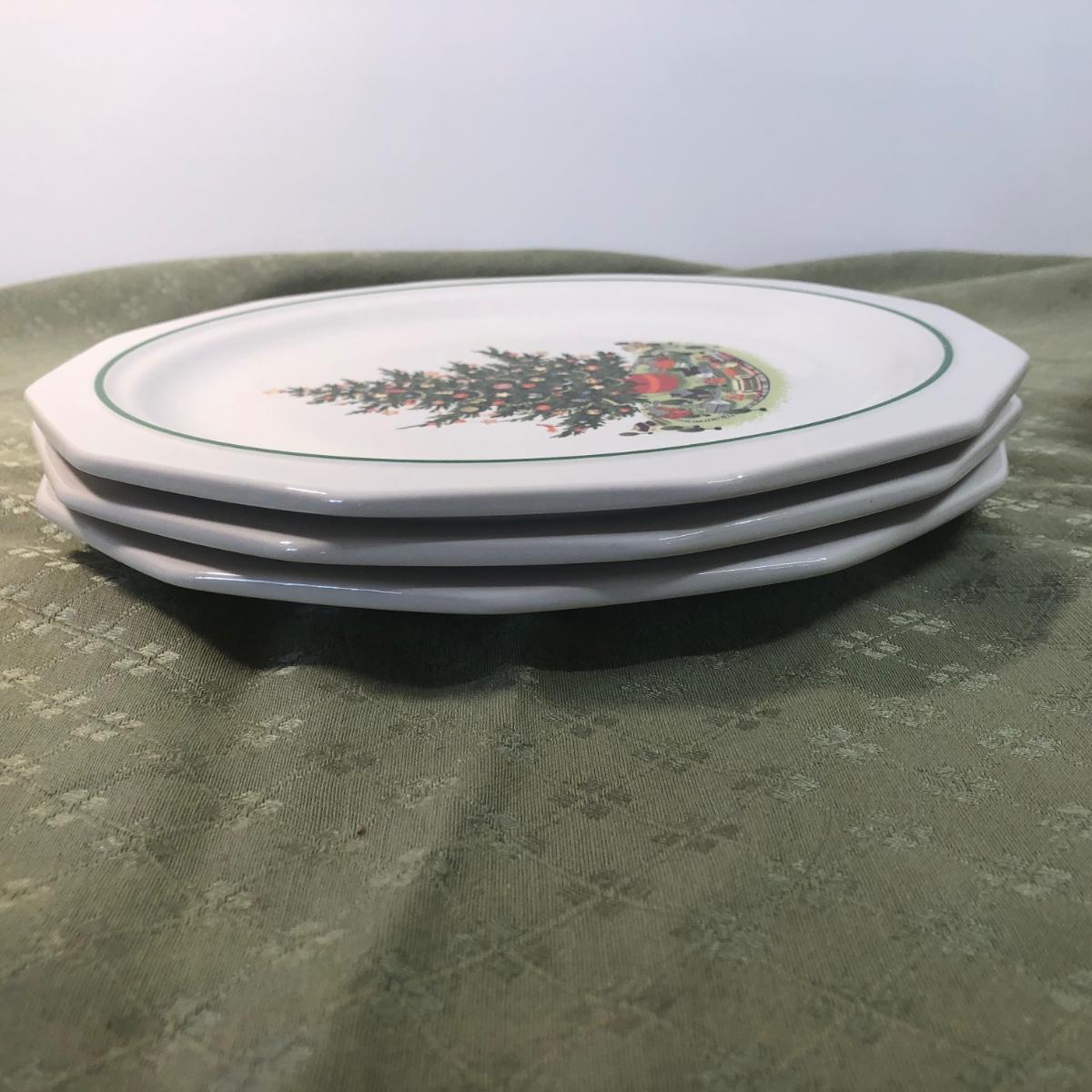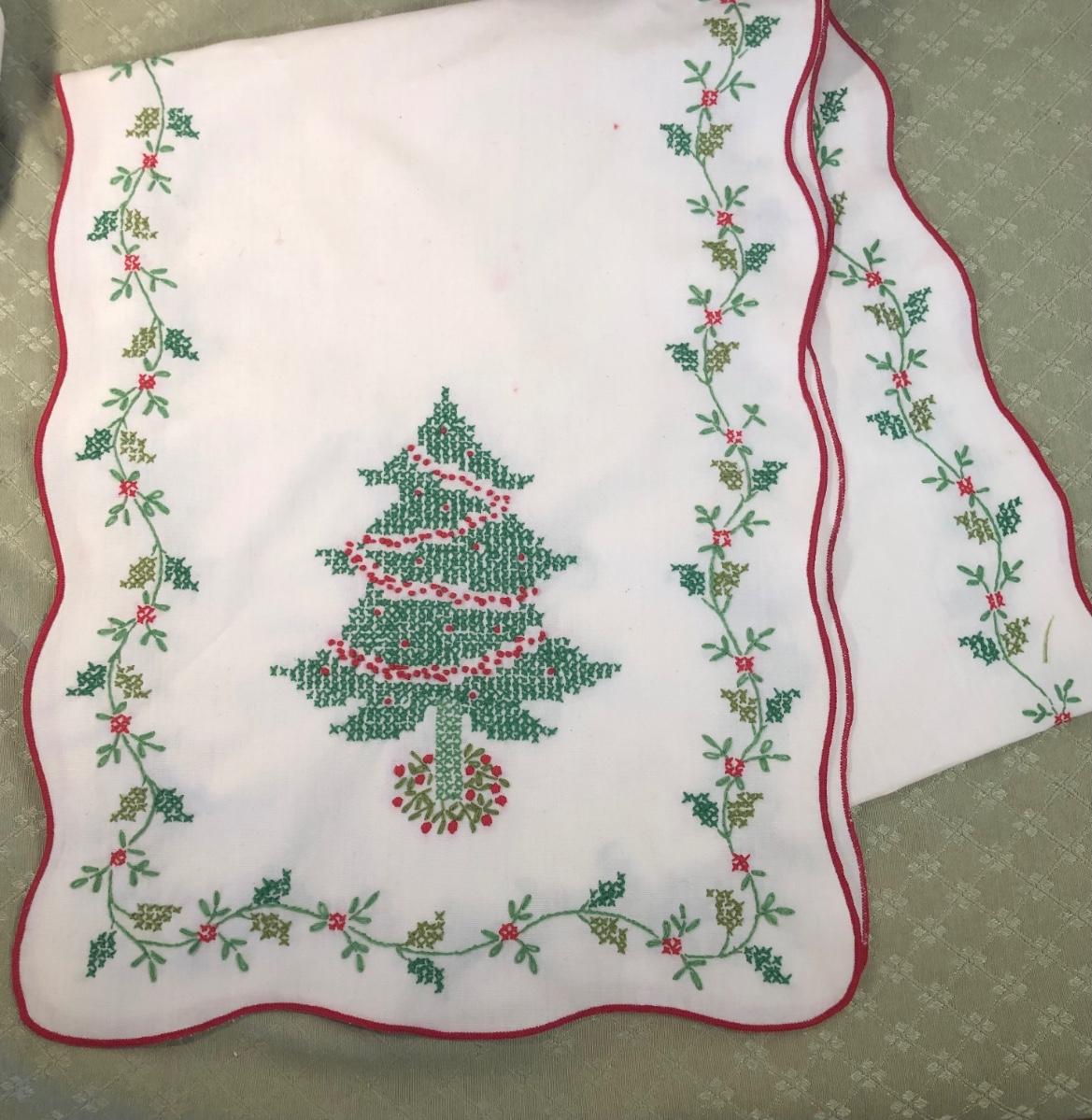 Includes three Pflatzgraff Christmas dinner plates, five dessert plates, a serving bowl, a plain white Pflatzgraff chip and dip server and a Christmas tree table runner.