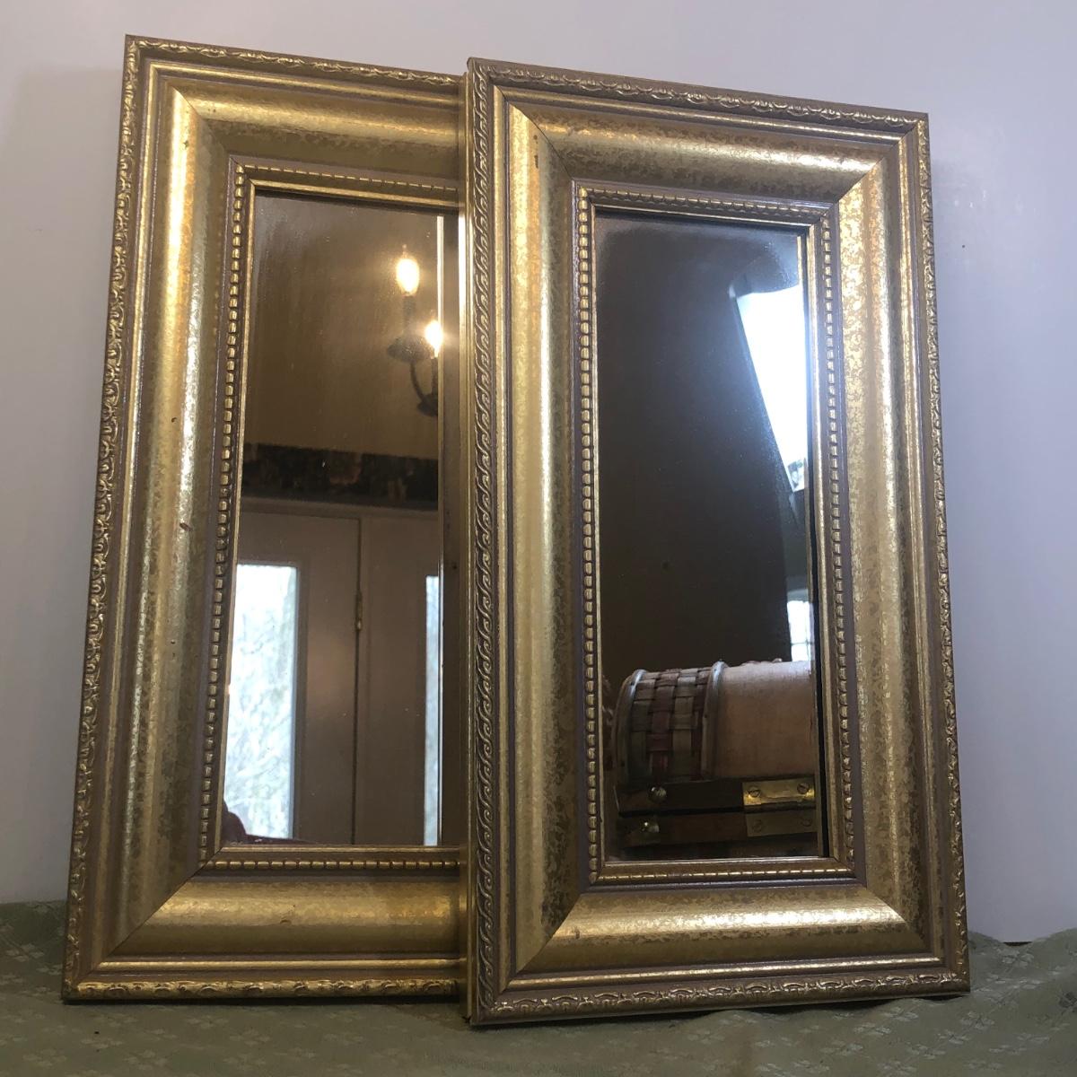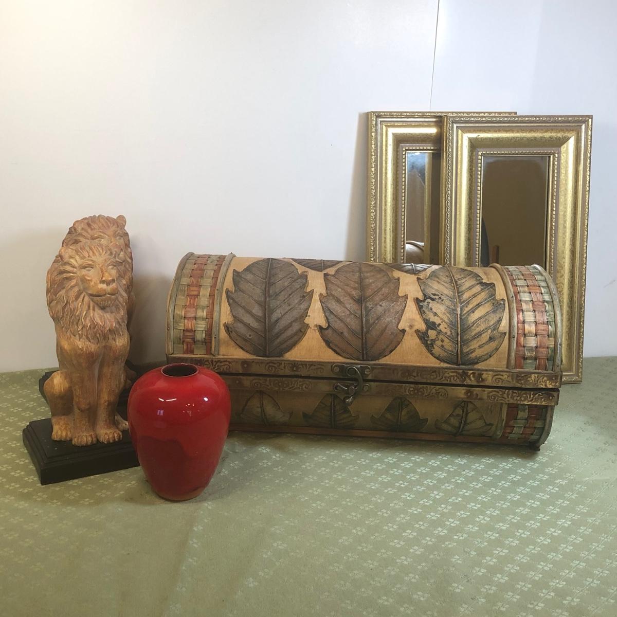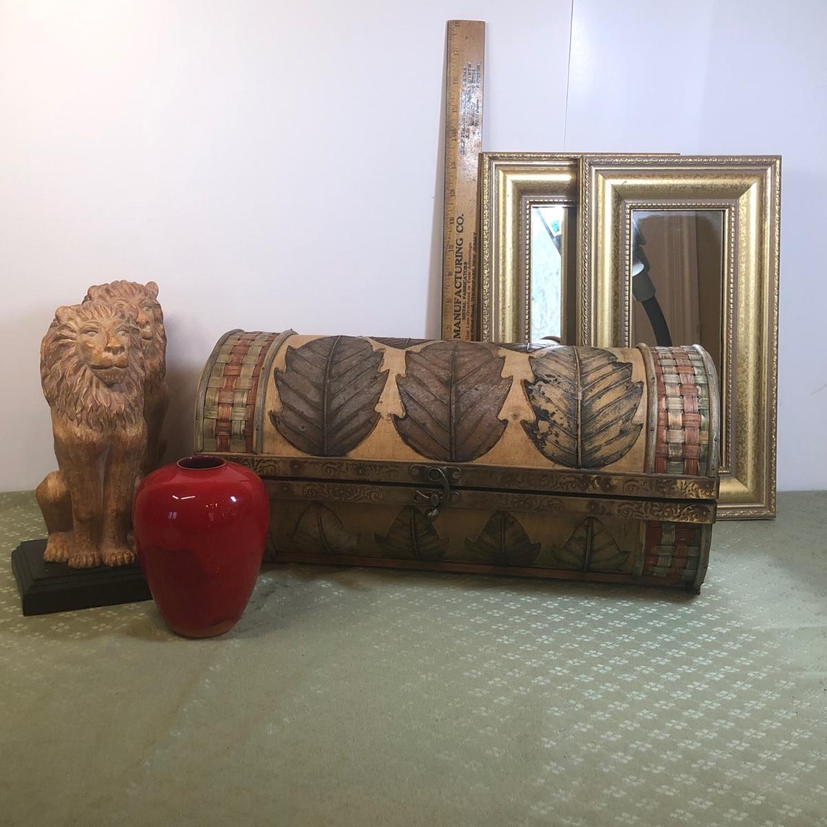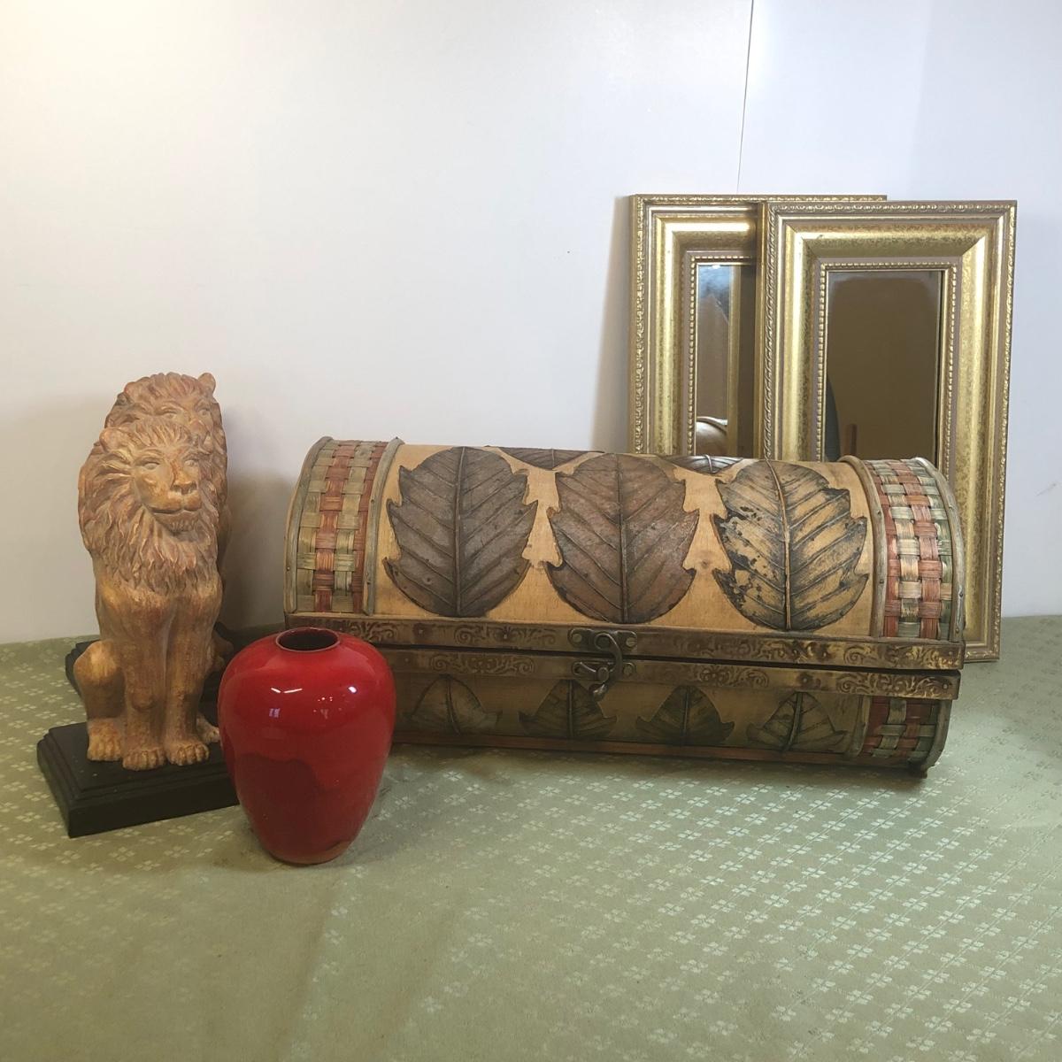 LOT 45M: Signed Terra Cotta Red Drip Vase, Wooden Leaf Box, Lion Bookends & Gilded Mirrors