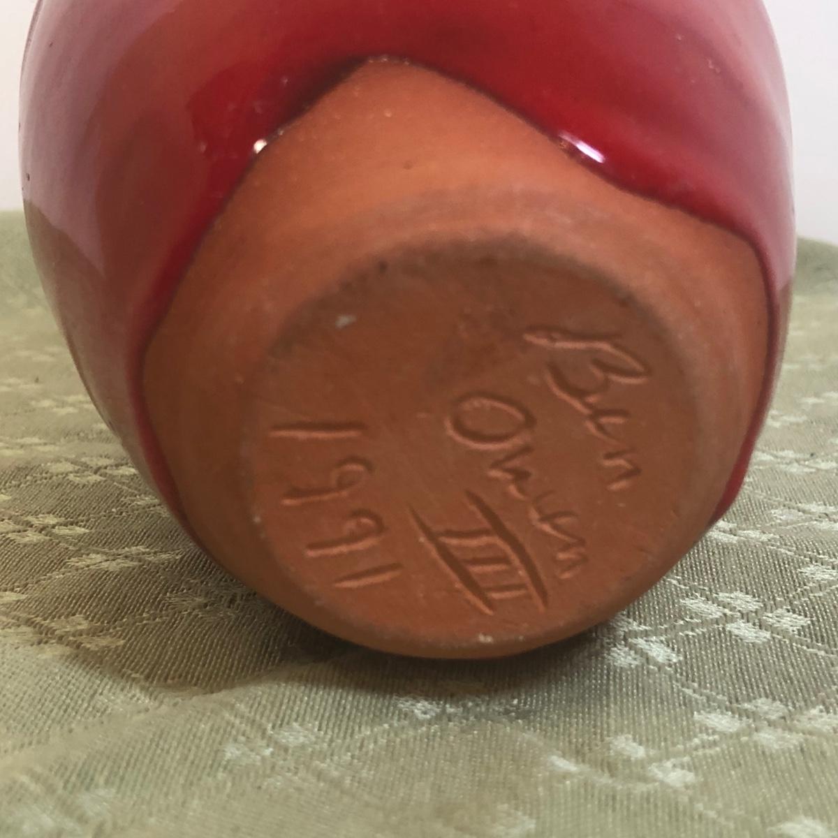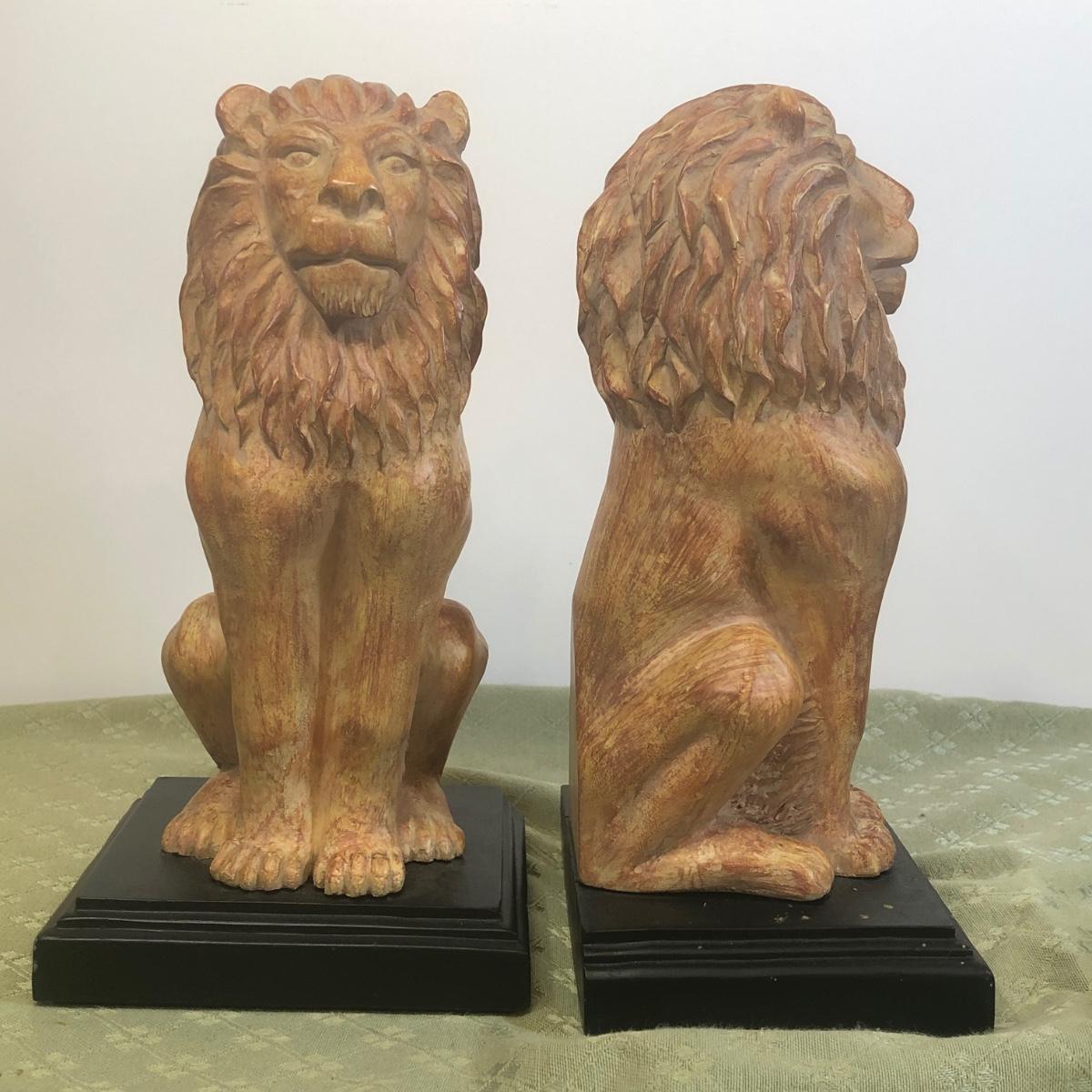 Includes two lion bookends, two small rectangular mirrors, a wooden box with a leaf design on it and a red terra cotta pottery vase signed by the artist in 1991.