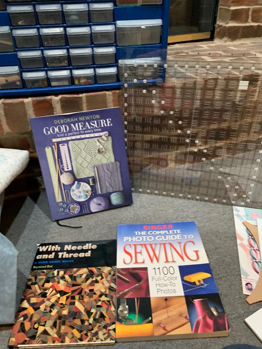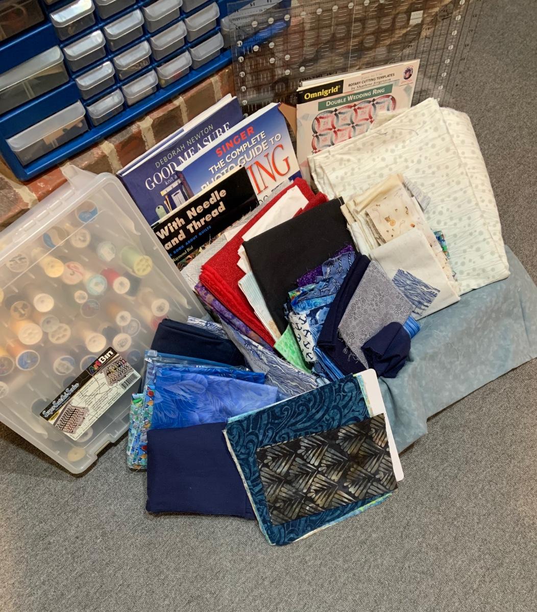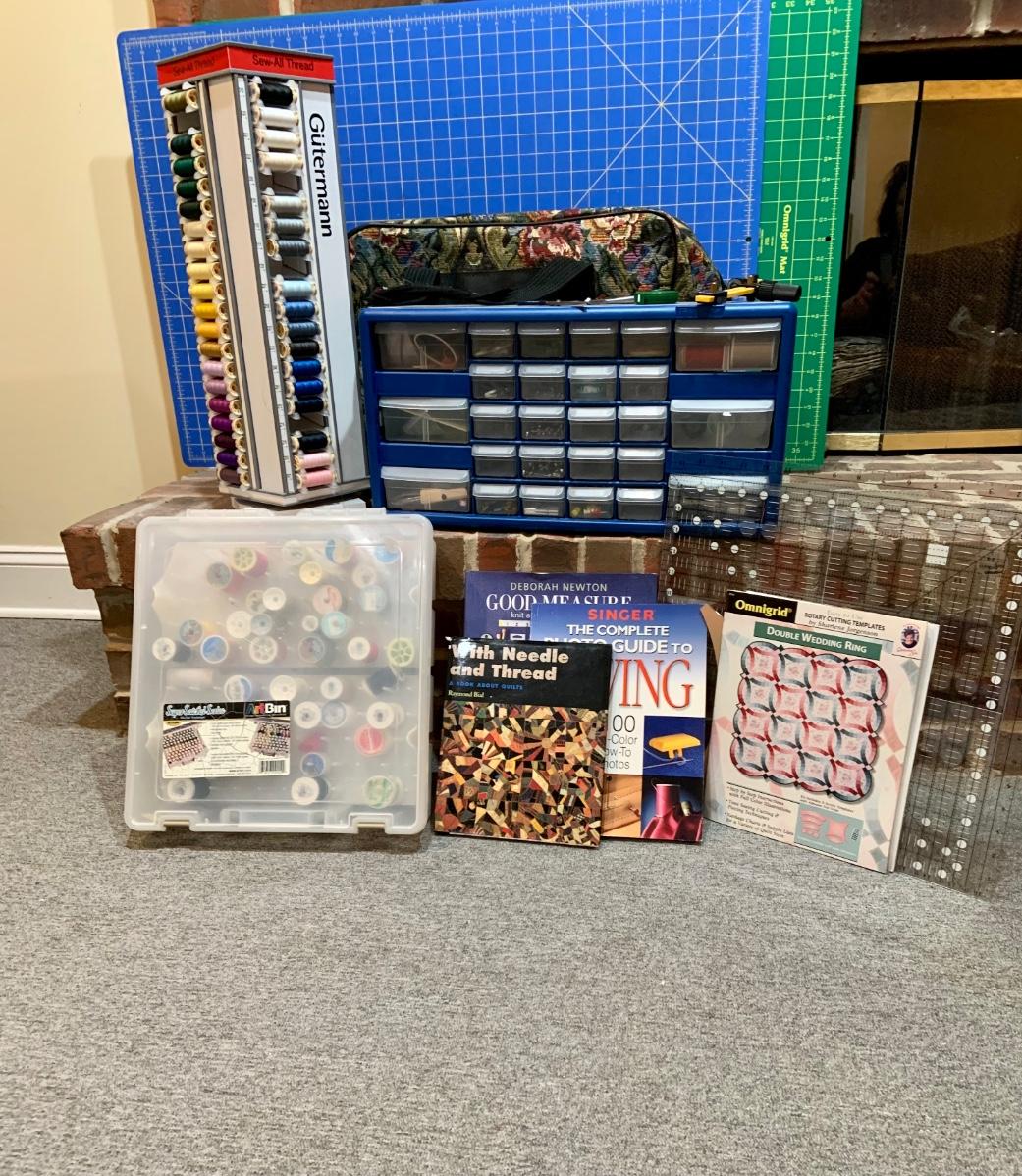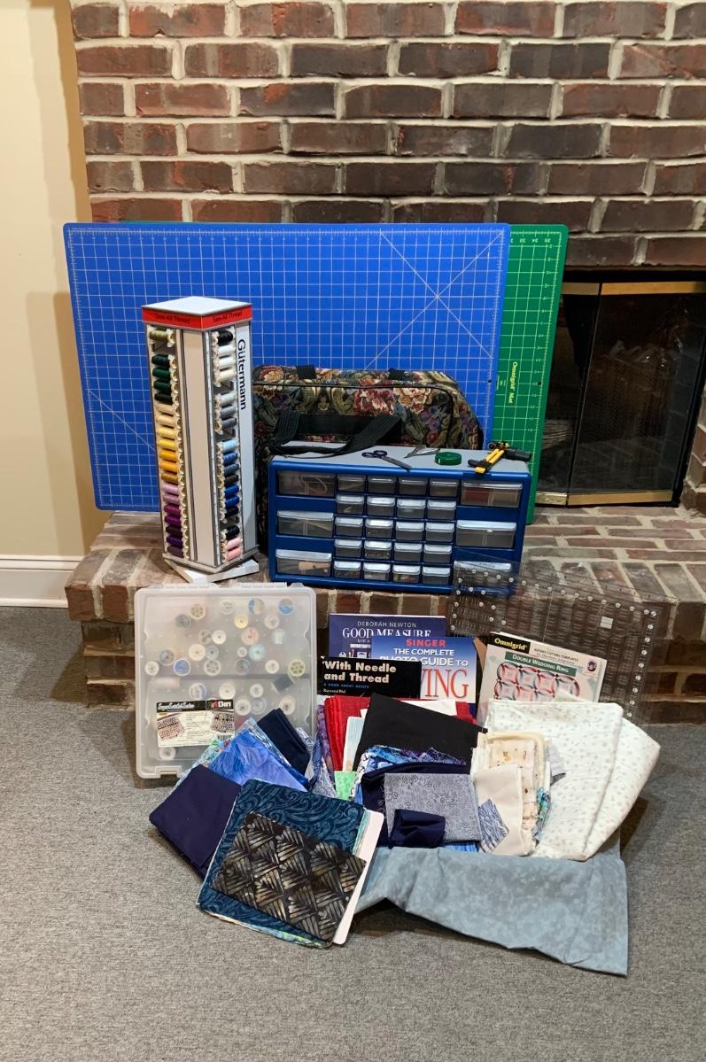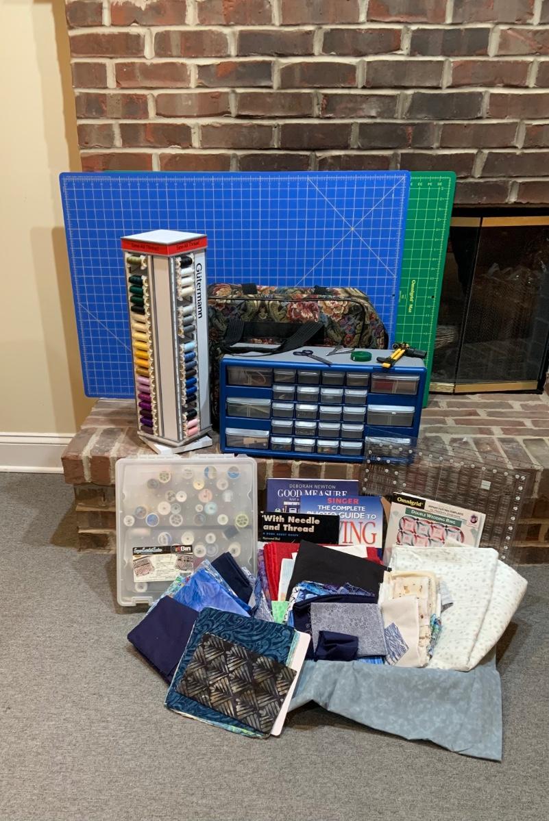 LOT:57G: Large Lot of Sewing and Quilting Supplies Including Books, Patterns, Squares, Thread, Mats and Sewing Machine Cover and Much More.