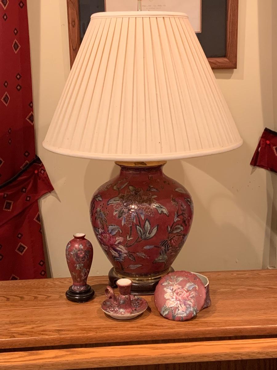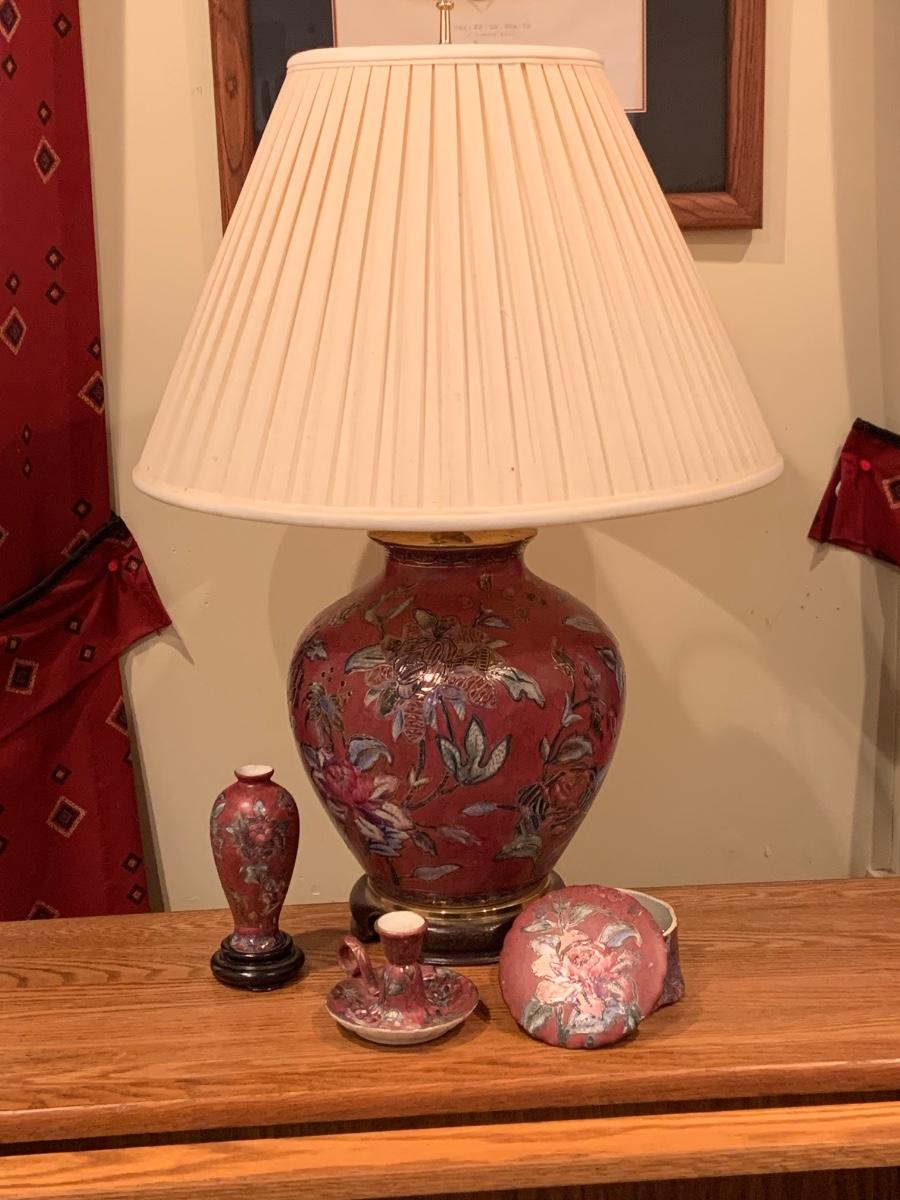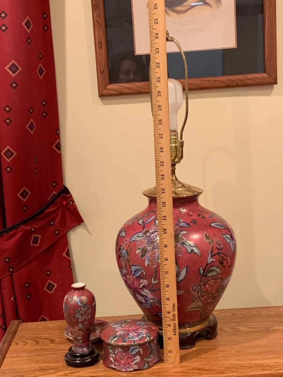 LOT:61G: Ginger Jar Style Lamp, Vase, Candle Holder and Box w/Floral Motify