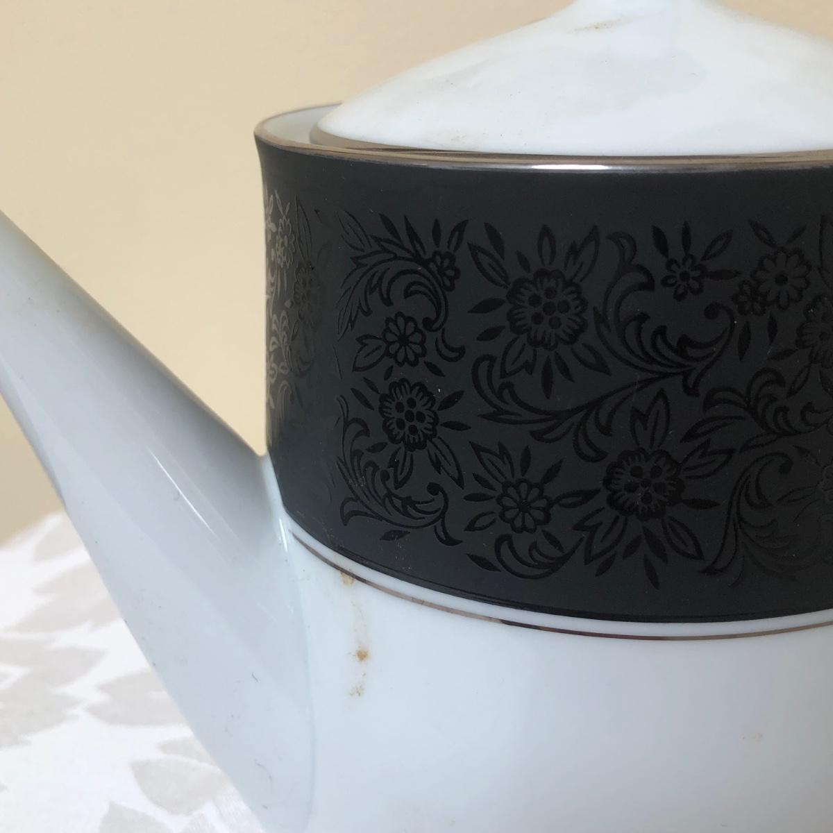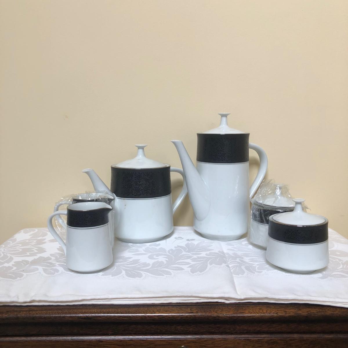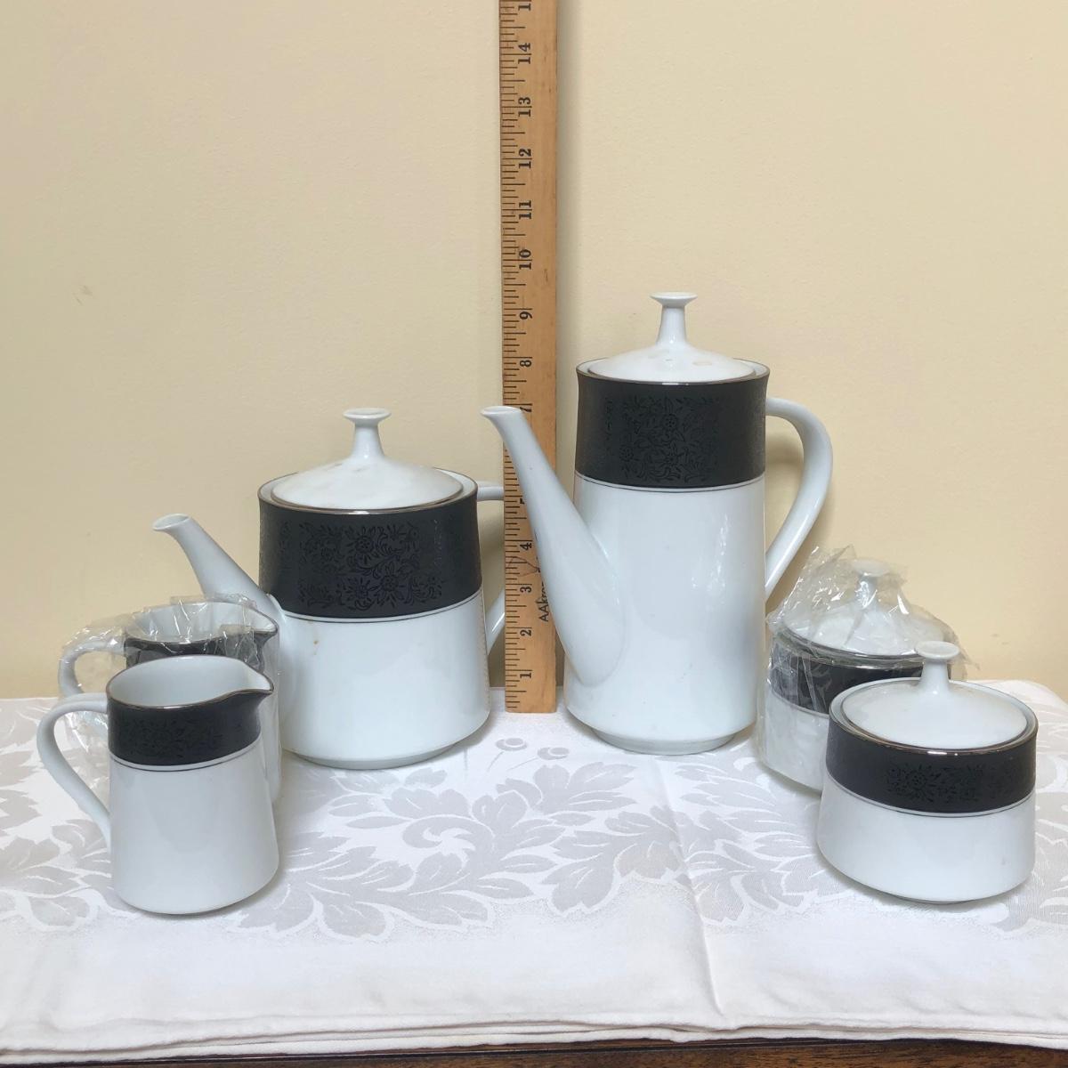 Set includes 12 teacups, 17 saucers, 16 small plates, 16 medium plates, 16 dinner plates, 18 bowls, 10 small bowls, a tea pot, a coffee pot, two creamers, two sugar bowls, a pot, a butter dish and a few serving dishes. Includes extra items that are chipped (not pictured).