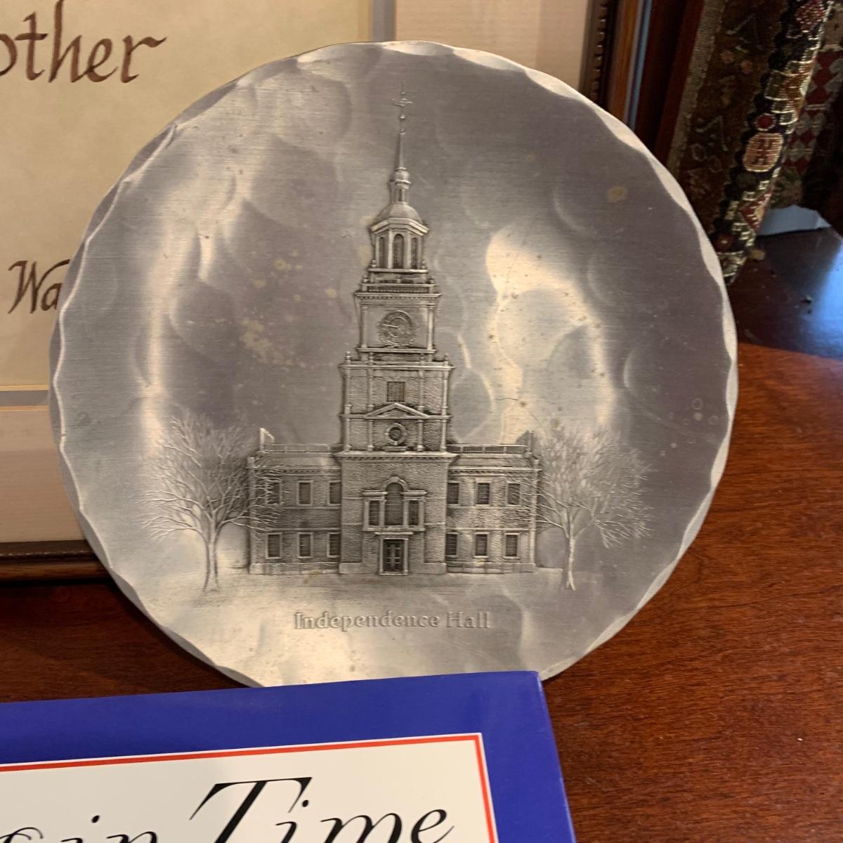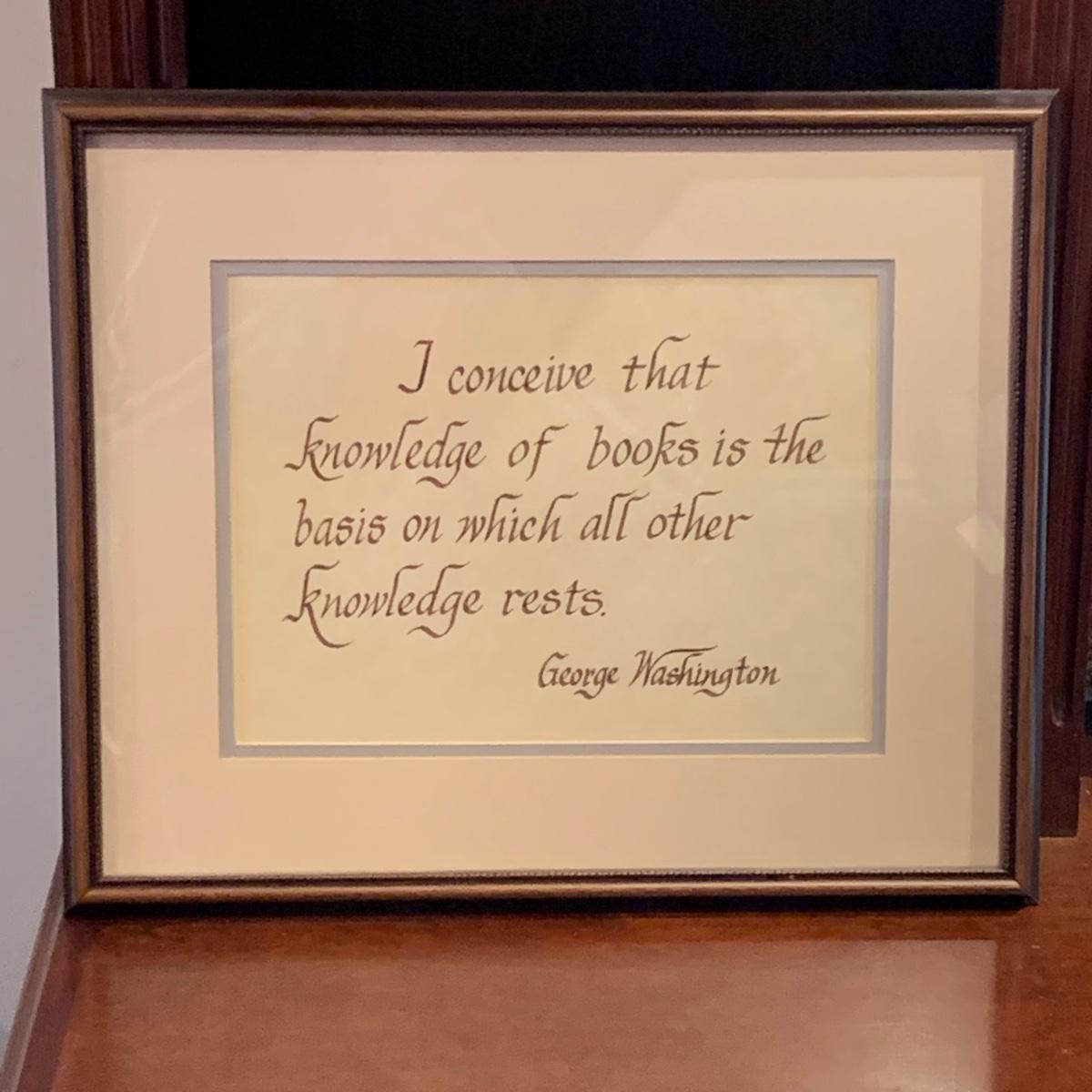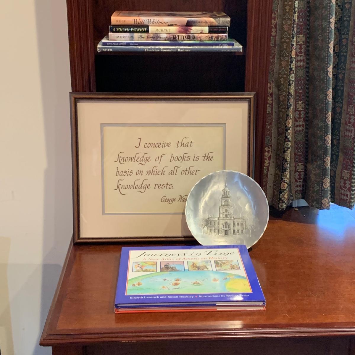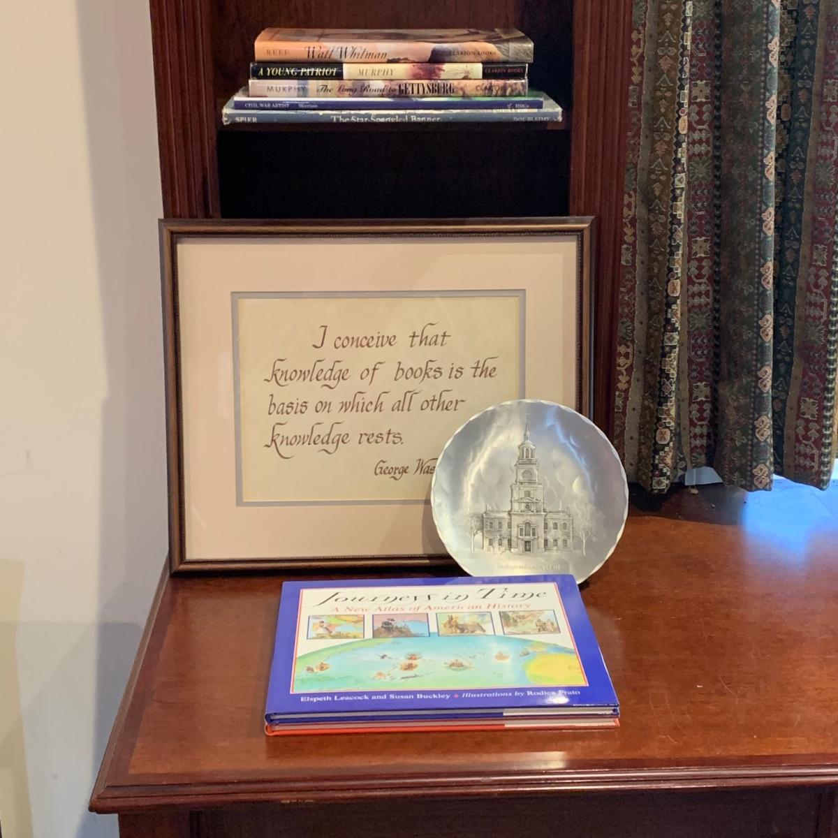 LOT:117: Historic Inspired Home Decor and Childrens Book Collection Including Caligraphy of an Inspriational George Washington Quote and a Independance Hall Plate of