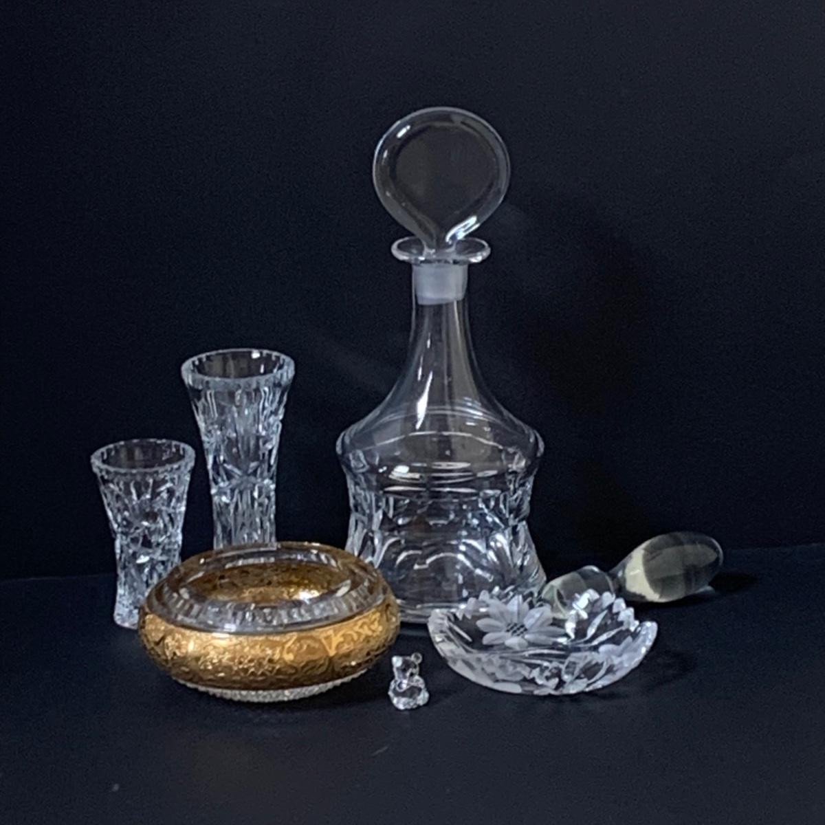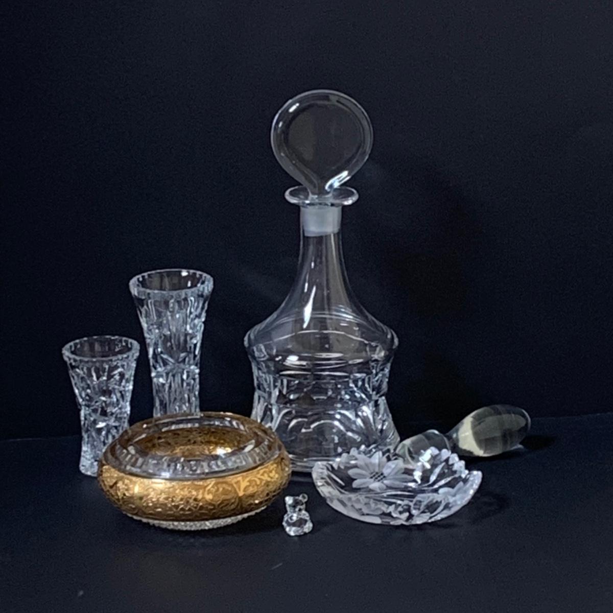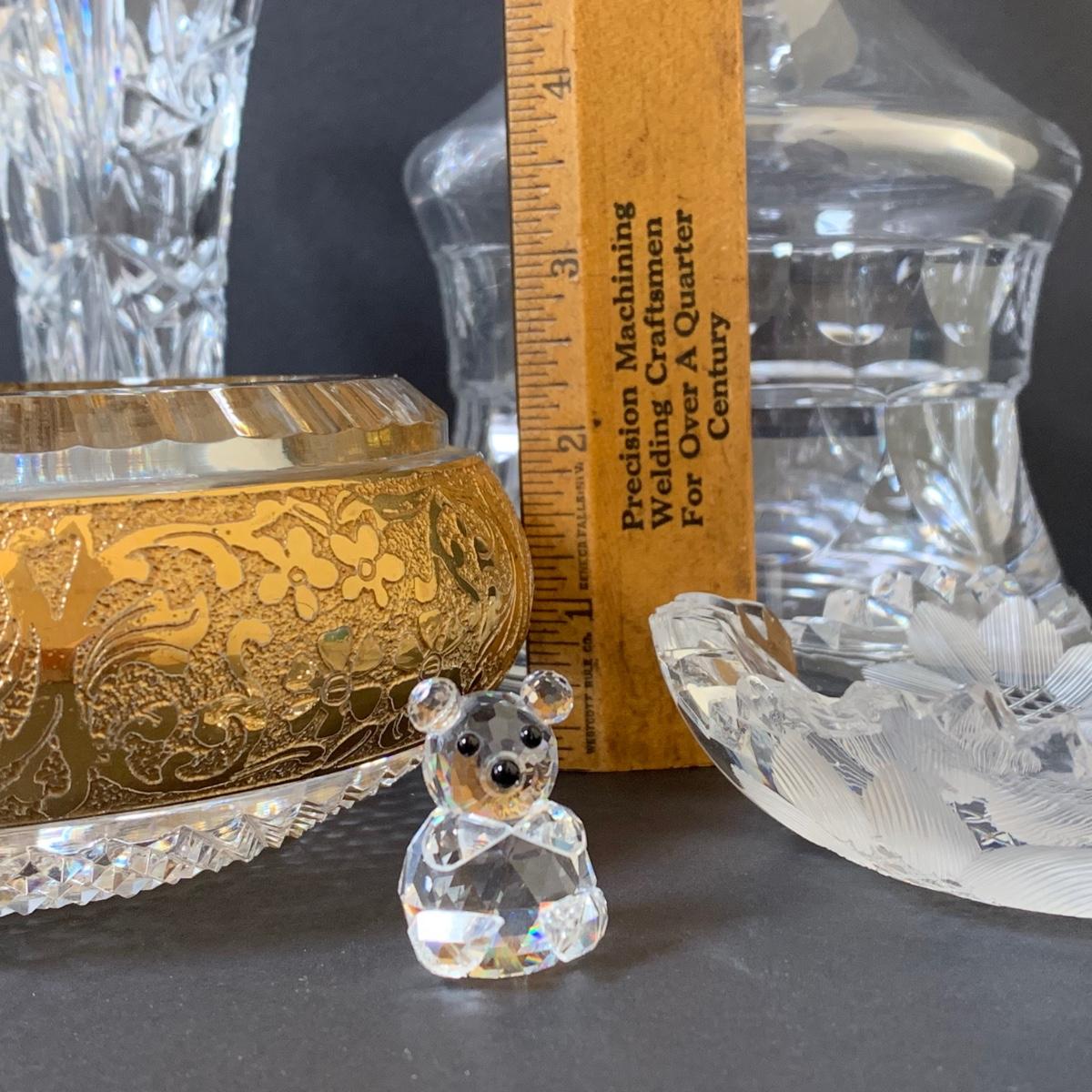 LOT 133R: Elegant Crystal Collection: Decanter, Vases, Gold-Rimmed Ashtray, Miniature Bear & More